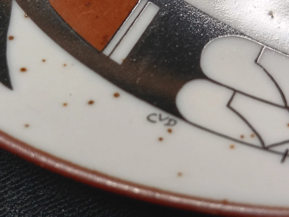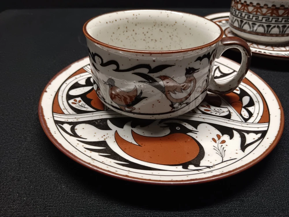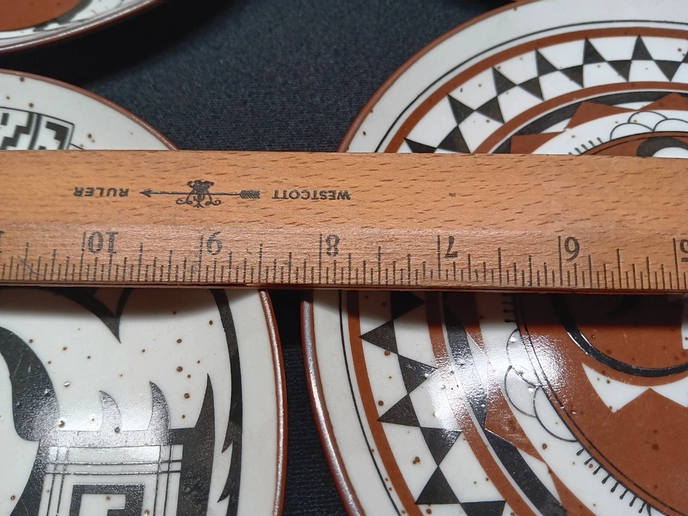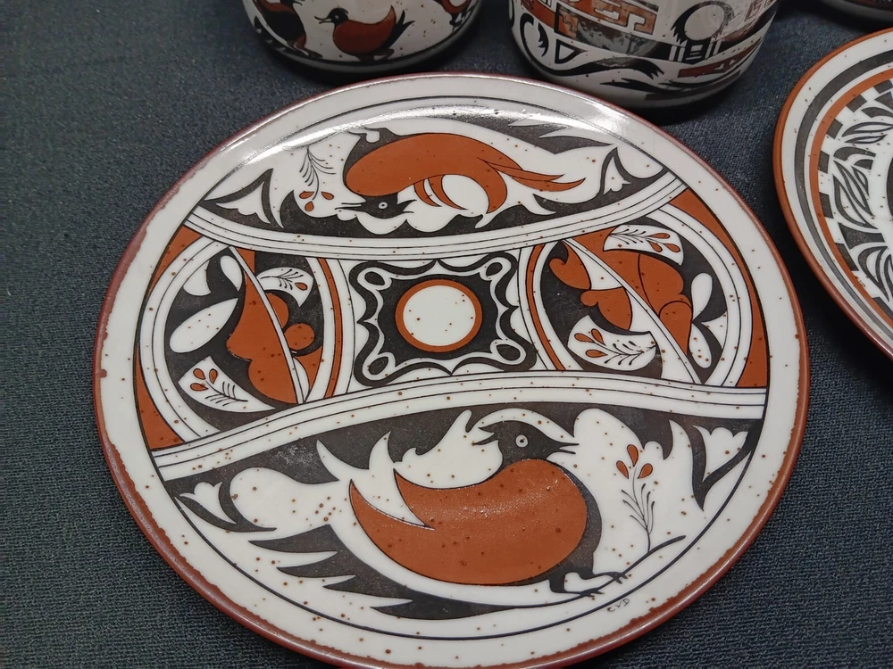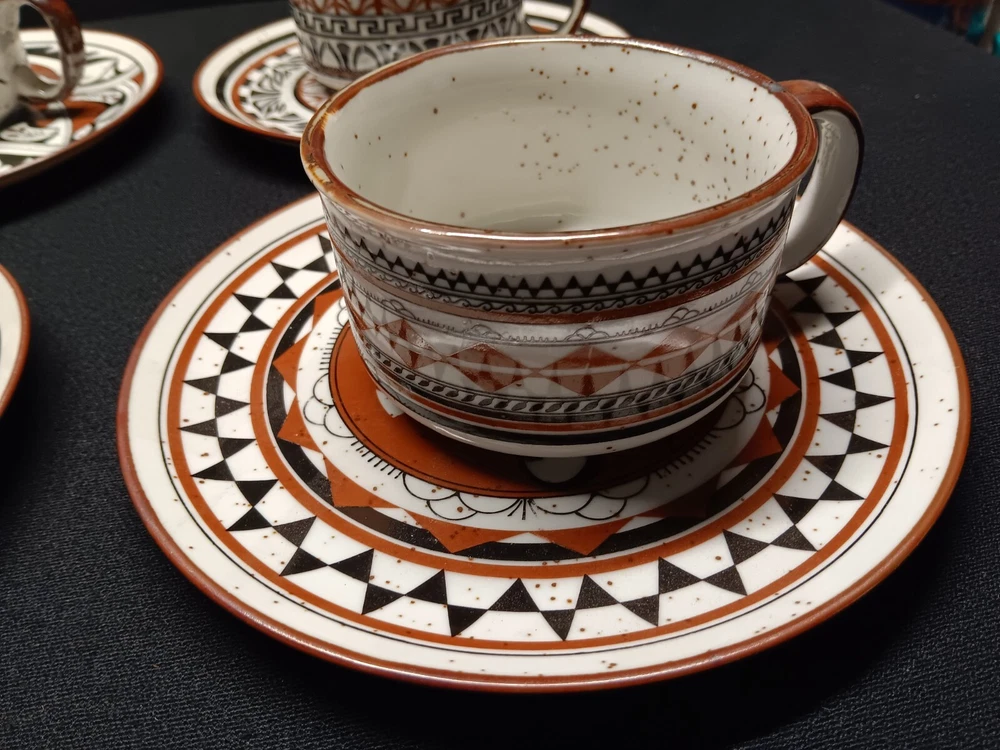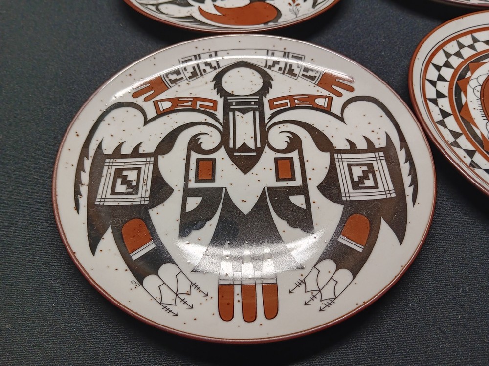 This listing is for a hard to find set made by Vandor imports. There are 4 different 8 1/8" plate designs with matching 4 1/4" wide cups. We found other items online with paper labels. These have no markings. They are in very good condition with no chips nicks or cracks. We really haven't found signs of use. The designs are taken from Native American pottery and the initials CVD are on some of the pieces. These could be a great addition to your party or dinnerware setting, thank you for looking.