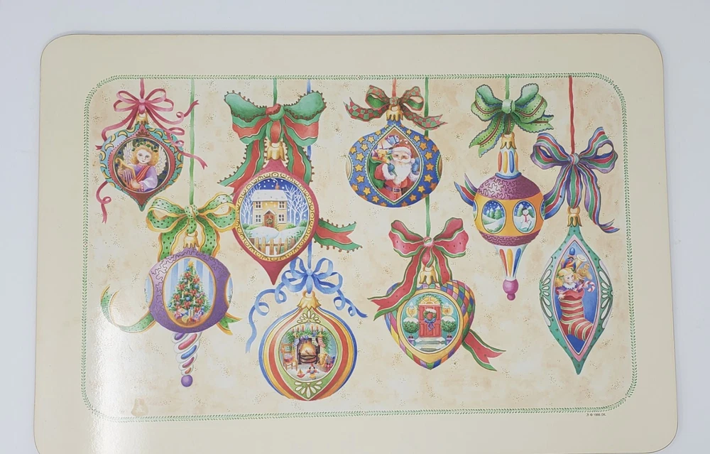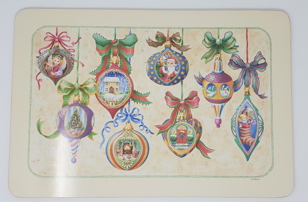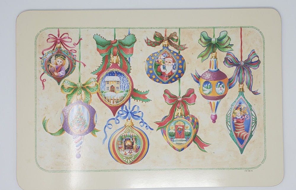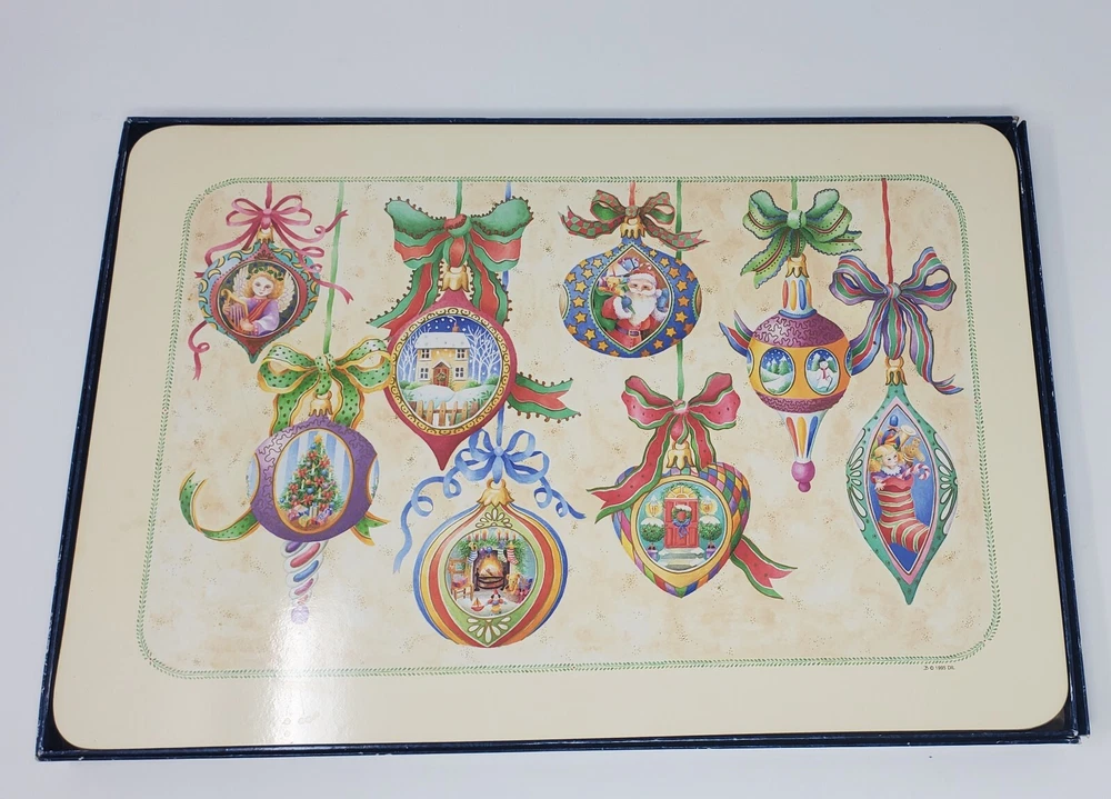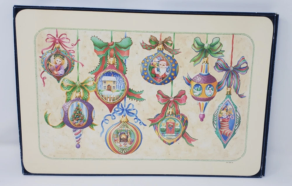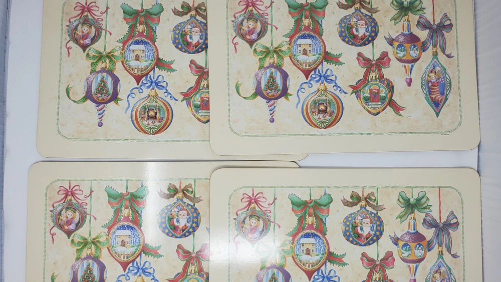 American Pennyroyal Placemats by Design Imports International Christmas Ornaments Placemats 1995 Set of 4 Cork Melamine w/Box Marked B copyright 1995 DIL Good preowned condition specially considering age. No significant signs of wear, look like they were hardly used. No stains on the front. Couple of brown spots on the back cork side. Box shows some signs of wear, especially at the corners. See photos.