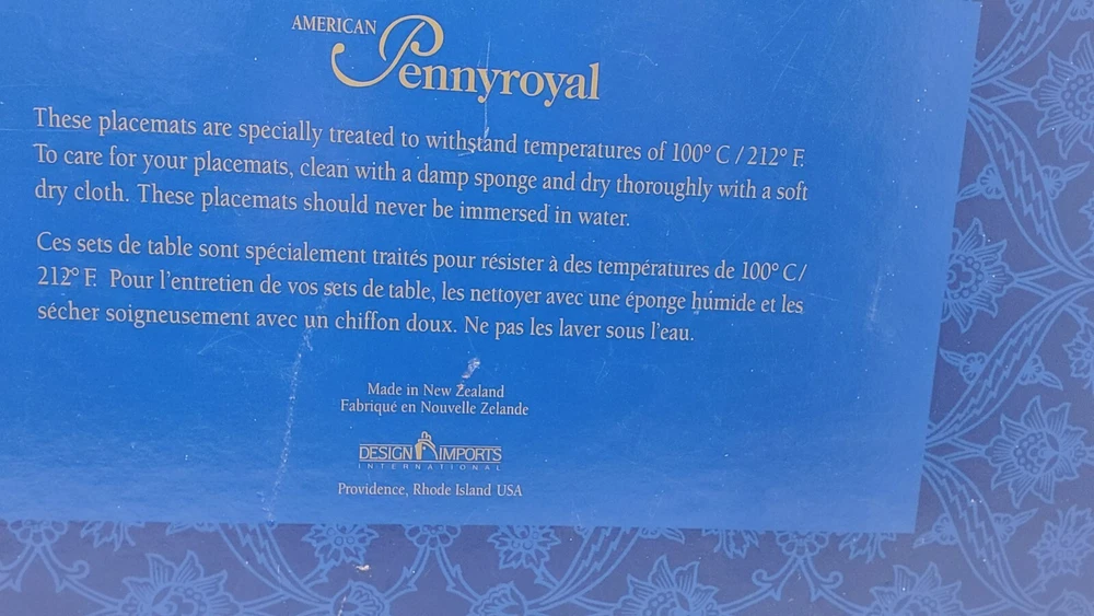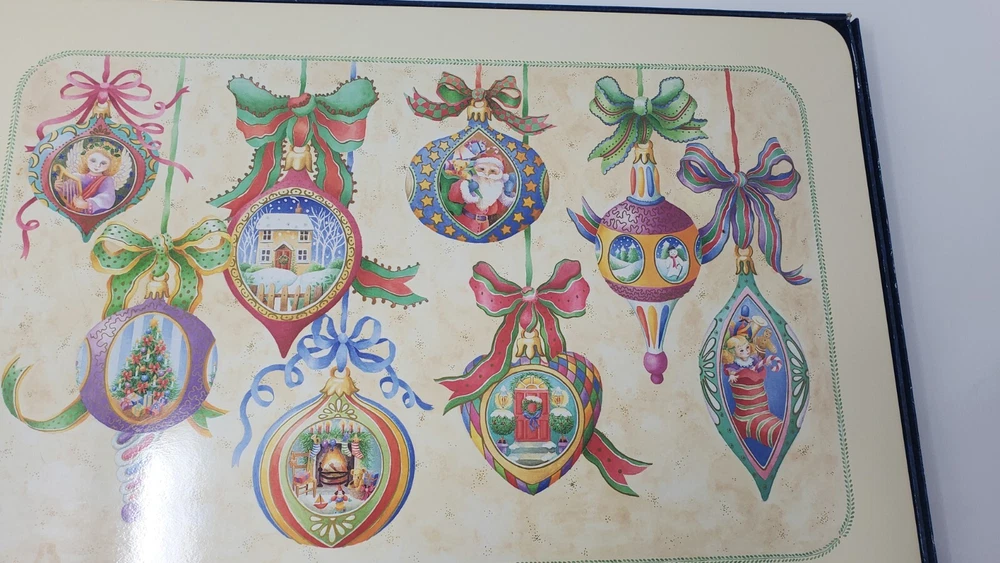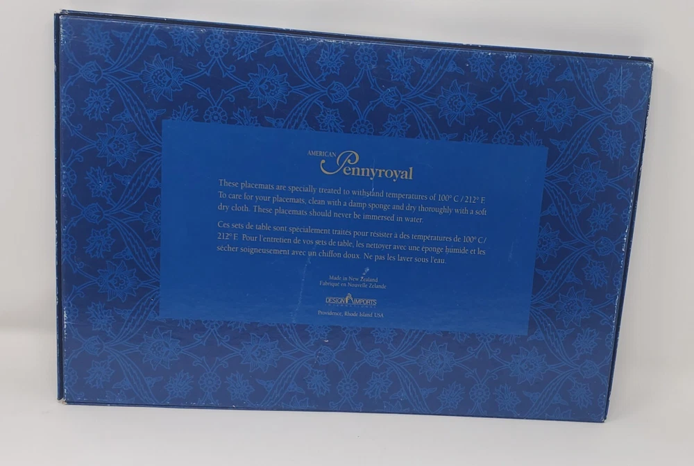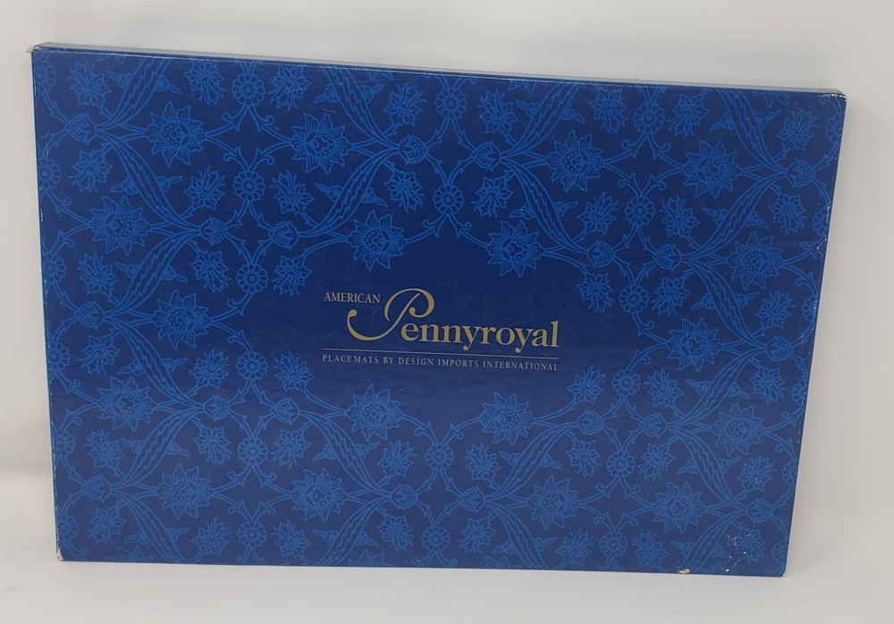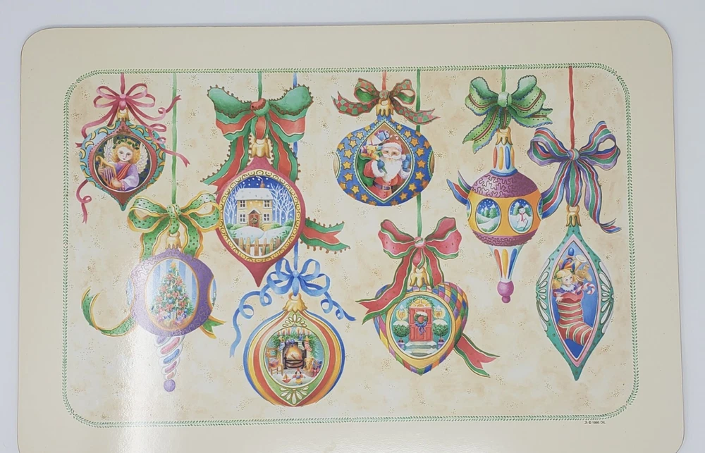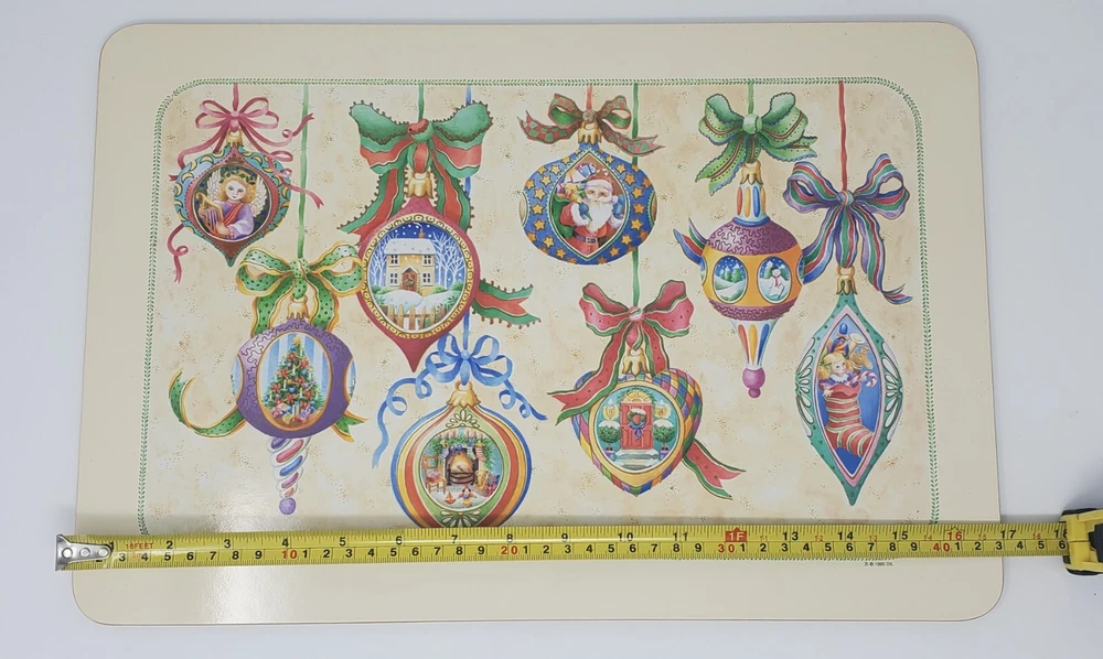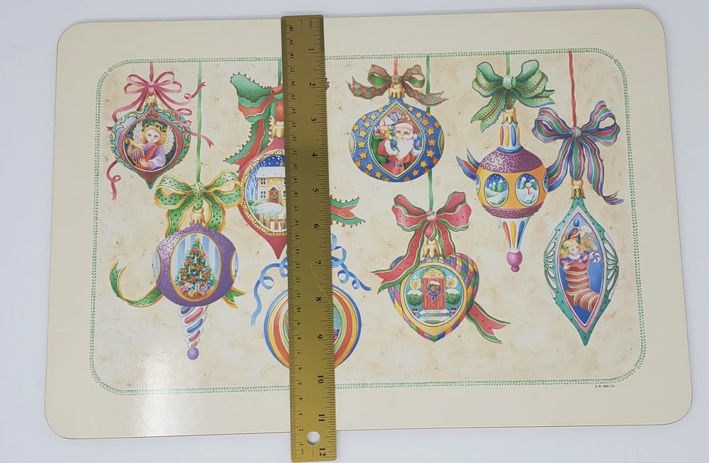 American Pennyroyal Placemats by Design Imports International Christmas Ornaments Placemats 1995 Set of 4 Cork Melamine w/Box Marked B copyright 1995 DIL Good preowned condition specially considering age. No significant signs of wear, look like they were hardly used. No stains on the front. Couple of brown spots on the back cork side. Box shows some signs of wear, especially at the corners. See photos.
