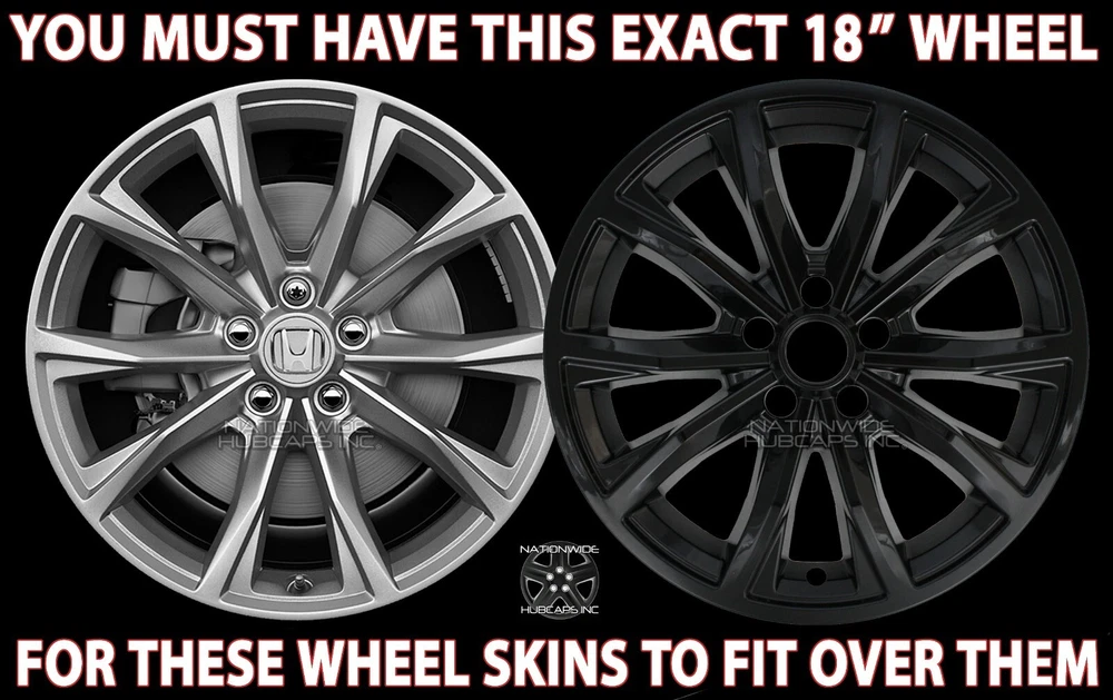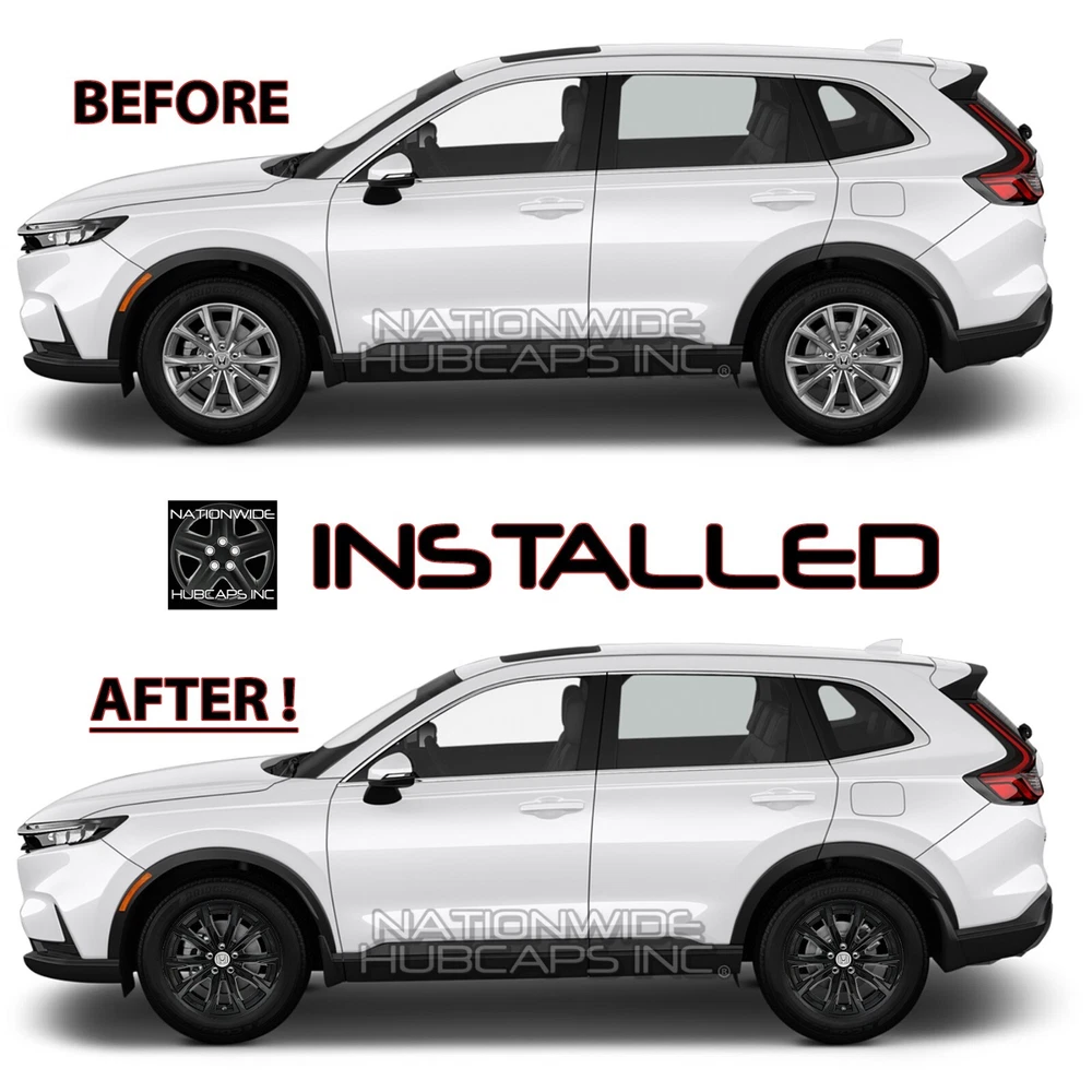 <img src="https://ti2.auctiva.com/web/aswCredit.gif" border="0"><br><a href="https://pages.ebay.com/seller-center/listing/listing-advanced-sellers/third-party-listing-tools.html#auctiva" target="_blank"><img src="https://ti2.auctiva.com/images/sc1line0.gif" border="0"></a> New Set of 4 Gloss Black Wheel Skins for CR-V EX / EX-L 2023-2025 18" Alloy Wheels Brand New Set of 4 Gloss Black 18" Wheel Skins ** PLEASE LOOK AT ALL 10 PICTURES PROVIDED ** (...AND YES, YOU REALLY WILL GET ALL 4 WHEEL SKINS FOR THE LOW PRICE LISTED ) fits over 2023-2025 EX and EX-L models with rim shown **WATCH THE INSTALL VIDEO PROVIDED** **These are the Best Quality Skins made for this wheel** New Set of 4 Gloss Black Exact Fit heavy-duty wheel skins. *Fits ONLY the exact 18" Aluminum Wheel shown in picture #3. Fits 2023-2025 Honda CR-V EX and EX-L models. These skins snap over your entire wheel, covering it in black & allows only your existing center caps & lug nuts to show through. See installed in picture # 4. Wheel skins are made of heat/impact resistant auto grade ABS, then painted a gloss black finish for an aggressive look. These snap on tight & secure for the best fit available, these snap behind the openings on the wheel. See clips in pictures # 6-8. These are simple to install, it can be done yourself in minutes. If you have any questions about fitment, we will be glad to answer them, 1-800-758-1782. No center caps are included, these utilize your existing center caps. PRICE INCLUDES 4 WHEEL SKINS & FREE SHIPPING** **NOTE: Free Shipping to Lower 48 US States Only! **AK, HI, PR, US Territories & International Cost Extra ANY QUESTIONS? WE CAN HELP YOU DETERMINE WHAT YOU NEED NATIONWIDE HUBCAPS 18007581782 WHEN CHECKING YOUR TIRE SIZE, DO NOT MEASURE THE HUBCAP, IT WILL GIVE A LARGER SIZE THAN NEEDED. FOR THE CORRECT SIZE IT GOES BY THE TIRE SIZE. CHECK THE SIDEWALL OF YOUR TIRE FOR A SERIES OF #'S LIKE: P225/65/R18 . THE R18 IN THE EXAMPLE IS THE HUBCAP/TIRE/WHEEL SIZE YOU NEED TO ORDER THE CORRECT SIZE. BY ENTERING A QUANTITY OF 1 YOU WILL GET 4 WHEEL SKINS SHIPPED TO YOU New set of 4 snap on gloss black wheel skins hubcaps to fit 2023 2024 2025 for Honda CR-V EX EX-L model with the 18" aluminum wheel that we have pictured. These will fit right over top of your wheel and expose your existing center caps and lug nuts when installed. Price includes a new set of 4.