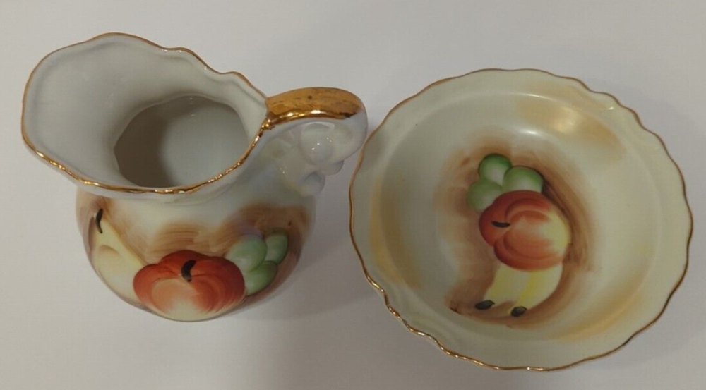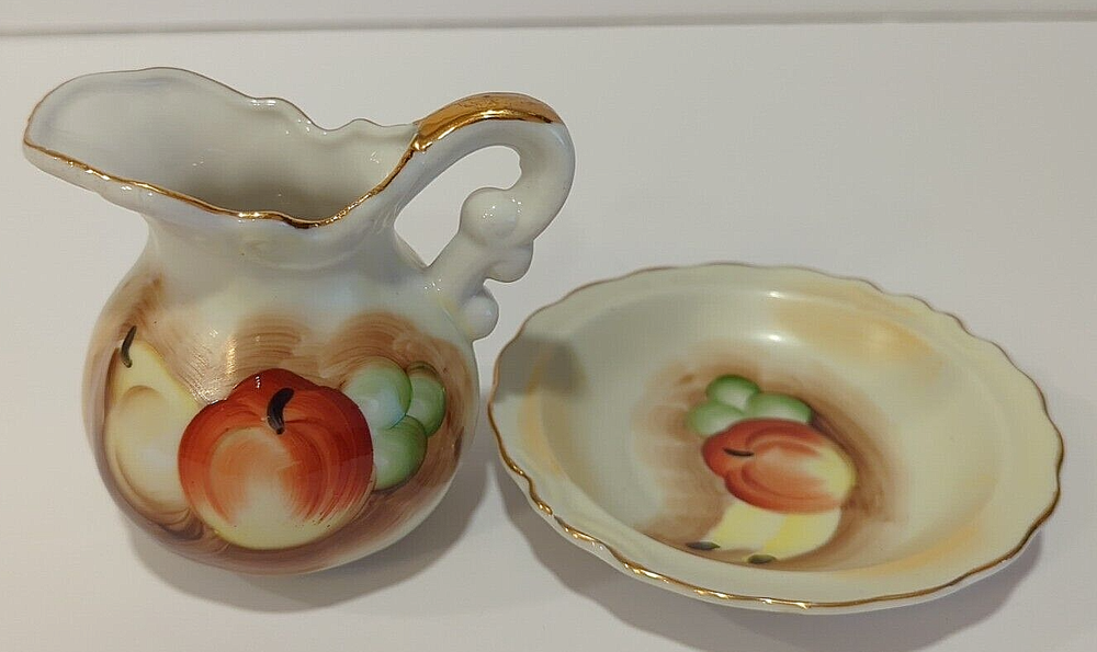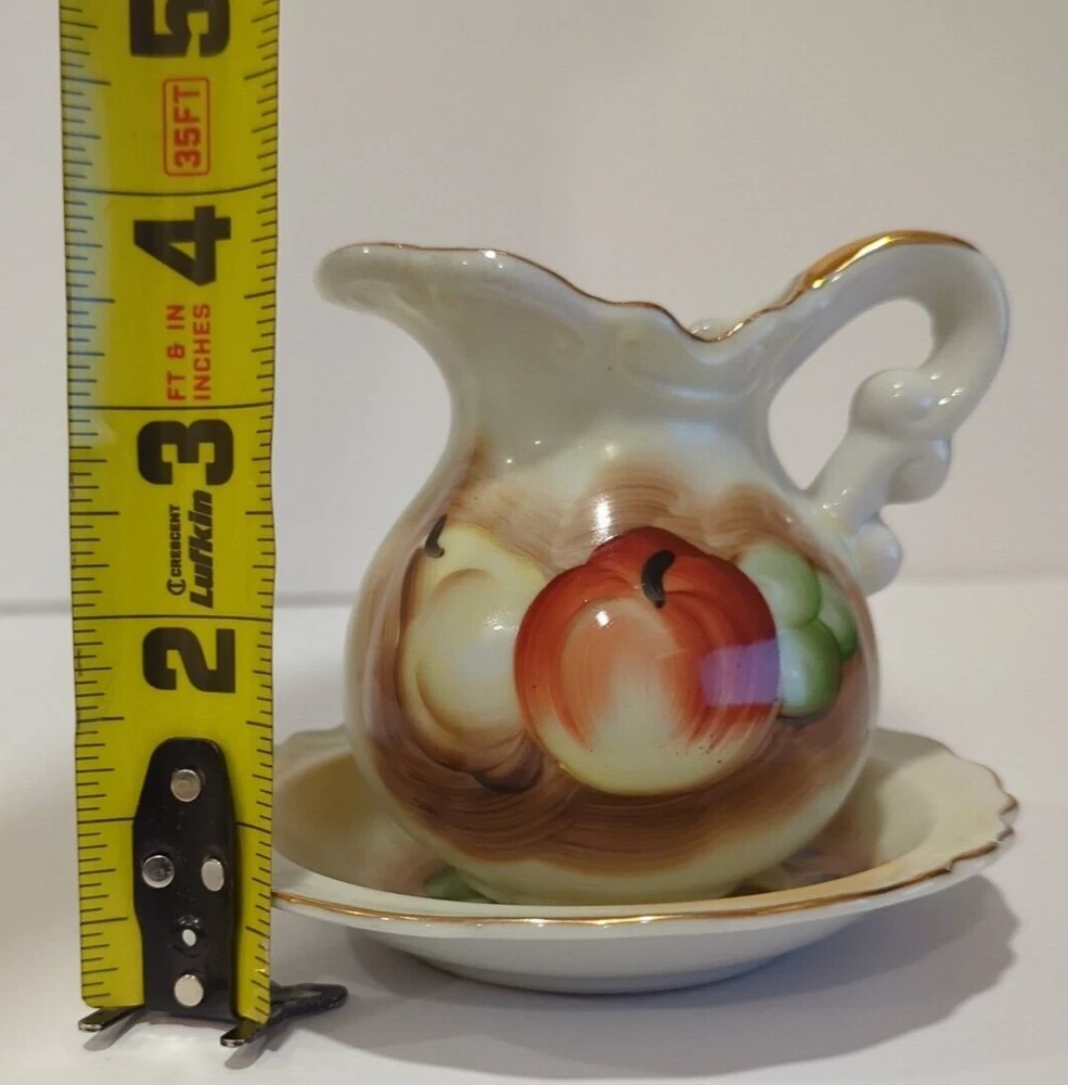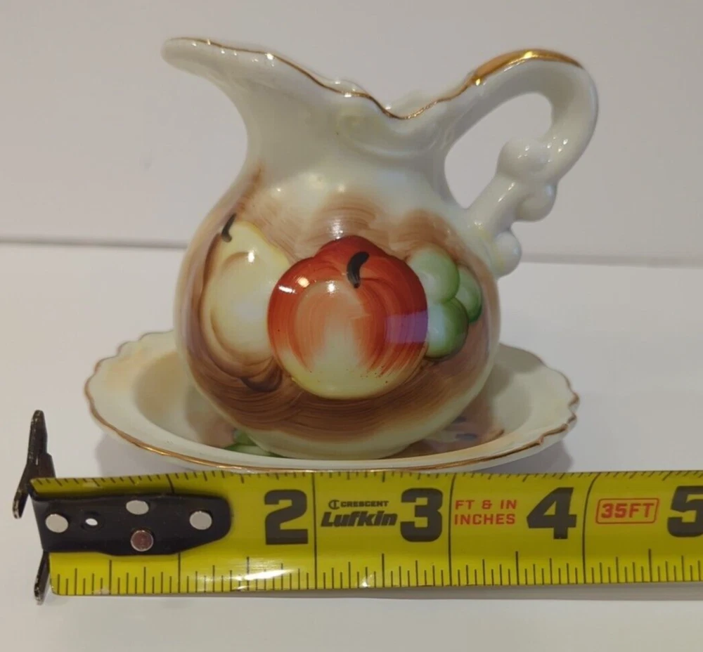 Please read entire description. This item has been used. The item may have some signs of wear or imperfections. Photos are of the actual item listed. Smoke free home. Please contact me with any questions or concerns you may have. If you are in any way unsatisfied, please contact me. Add a touch of elegance to your collection with this vintage Enesco Japan Import Pitcher and Basin set. The set features a stunning fruit design with exquisite gold trim that adds a touch of luxury to any decor. Made of high-quality pottery, this set is a true gem for collectors. The 4-inch tall set is in great shape. The brand is Enesco and it was made in Japan. This decorative set is perfect for those who love to collect unique items and add a touch of sophistication to their home.