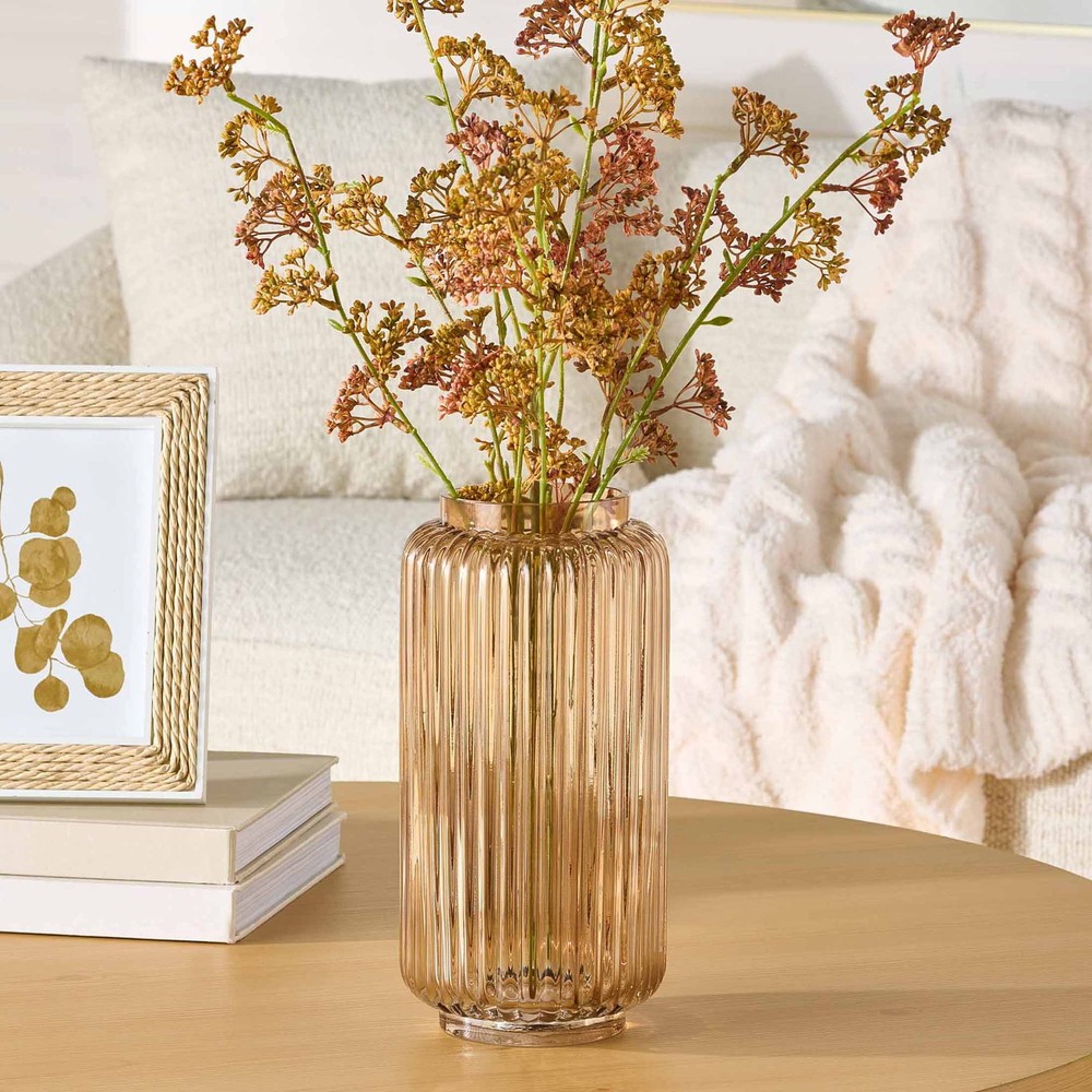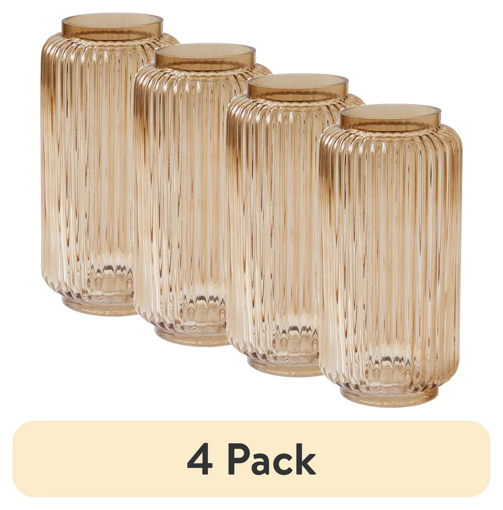 Envelop your home in elegance with the Better Homes & Gardens Ribbed Glass Vase in a luxe champagne hue. With its sleek, ribbed lines and soft golden glow, this beauty catches the light just right, adding effortless sophistication to any setting. Whether it’s holding fresh florals, dried stems, or shining solo, this goes-with-anything finish helps make this glass vase a staple decorative piece. Only at Walmart. Material: Glass Dimensions: 5'' D x 10'' H Includes: Four decorative vases Care: Wipe clean Country of Origin: Imported Features: Ribbed pattern; cylinder shape Designed for: Display as is or add your favorite flowers; indoor use only Ribbed Glass Vase from Better Homes & Gardens