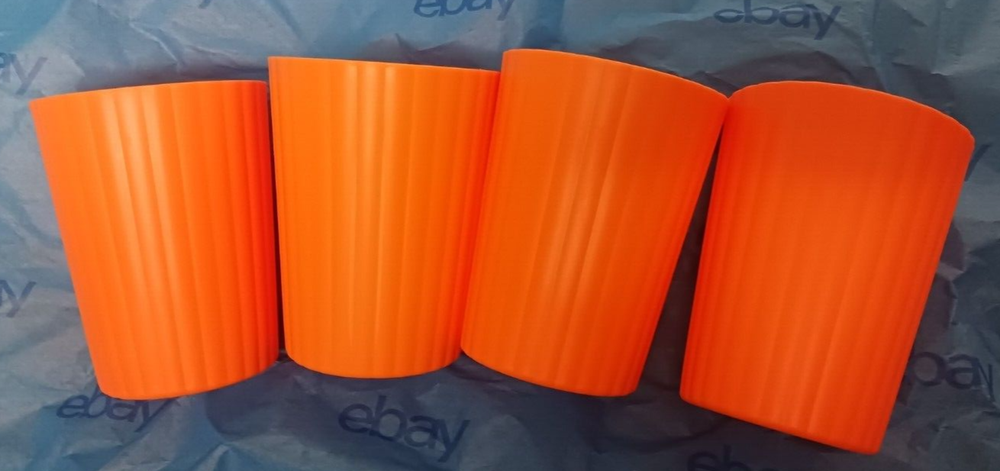Mainstays Plastic ribbed Tumblers Set Of 4, (4 Of Each) pink NEW! • Material content: Polypropylene Plastic • Featuring a smooth matte finish • BPA Free • Durable and suitable for everyday use • Perfect for entertaining • Suitable for Indoor or Outdoor use • Microwave and Dishwasher safe • (4) Tumblers 18 oz (3.50” Diameter by 4.75” Height) • Color: orange