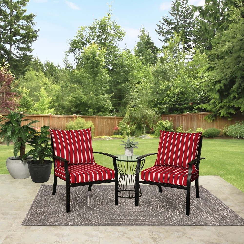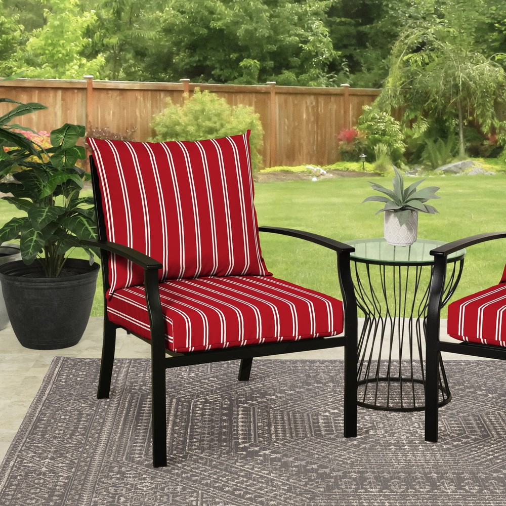 Transform your outdoor space with the Mainstays Outdoor Deep Seat Cushion Set. This set contains a deep seat pillow back and a deep seat bottom cushion. It fits most standard deep seat conversation chairs. The pillow back measures 24 in. wide x 21 in. length x 6 in high and the seat bottom measures 22.75 in. wide x 24 in. length x 5 in. high. The durable, weather-resistant polyester fabric ensures vibrant colors through the season and offers easy cleaning with just soap and water. The pillow is filled with polyfill while the bottom cushion is filled with new and improved higher density polyfill to help retain it's shape and provide long-lasting comfort during outdoor use. Crafted with quality and designed for durability, these cushions are the perfect addition to your patio, deck, or garden furniture. Whether you're lounging by the pool, hosting a barbecue, or simply soaking up the sun, our cushions provide the ultimate blend of comfort and aesthetics. Set includes one seat cushion and one pillow back Total dimensions: 45" L x 22.75" W x 5.5" H The deep seat cushion measures 22.75"W x 24"D x 5"H The pillow back measures 24"W x 21"D x 6"H Fits most standard deep seat patio furniture Durable, 100 percent outdoor polyester fabric UV-treated to resist fading Protective treatment helps repel water Filled with 100 percent polyester fiber for long lasting comfort Mix and match colors and patterns from Mainstays to create your own backyard getaway Cleans easily with soap and water Intended for use on your patio or deck, however we recommend bringing it indoors when it rains or when not in use to preserve its lifespan Coordinating items available