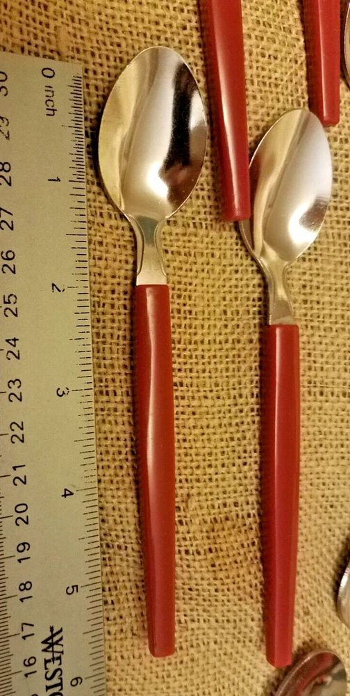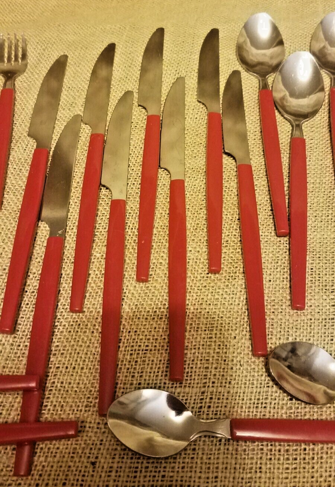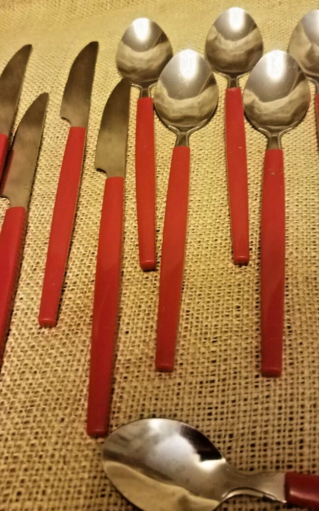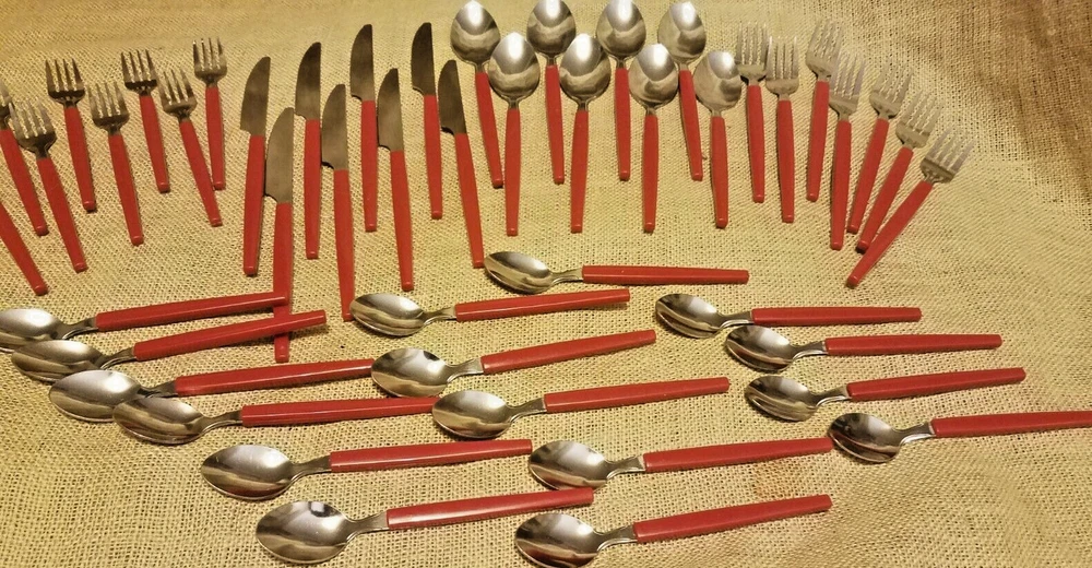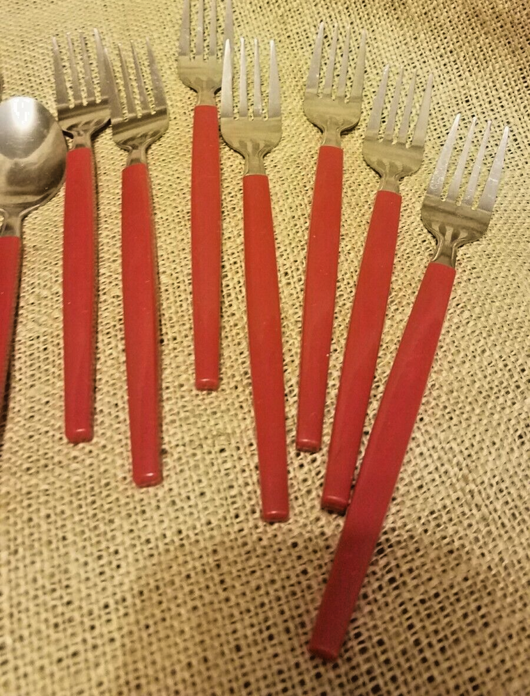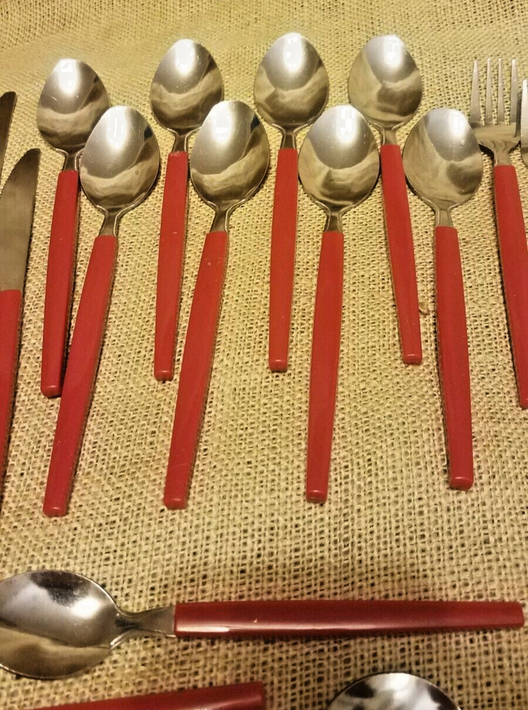 48 Piece Stainless Steel & Plastic Flatware Set Tray Niccole Red Mainstays. Set includes 16 small spoons, 9 small forks, 8 knives, 8 large spoons, and 7 large forks. All in good used condition from smoke free home.