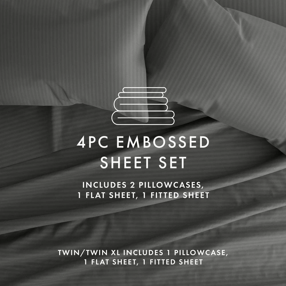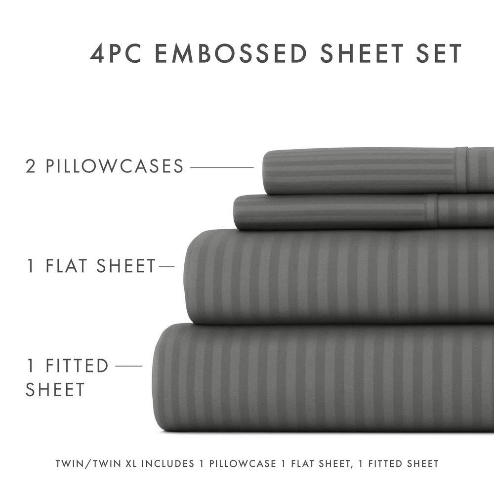 4-Piece Gray Striped Microfiber California King Sheet Set Includes 1-Flat, 1-Fitted, 2-Pcases (TW sets 1-Pcase) 16 in. Deep-Pocket Fitted Sheets Hypoallergenic and antimicrobial for sensitive skin The Becky Cameron Embossed 4-Piece sheet set is designed with your comfort in mind. Add a designer accent to your bedroom decor. Made of the finest imported double-brushed microfiber yarns creating a new standard in softness and breathability, this 4-piece sheet set will make it incredibly hard to get out of bed in the morning. Our premium yarns are two times more durable than cotton, completely wrinkle free, and perfect for all seasons. Superior weave for durability and a buttery-soft touch Double-brushed microfiber for outstanding comfort Easy Care: Machine wash cold, Tumble dry low, Fade Resistant, Wrinkle Free, No Ironing Necessary California King Size Set Includes: 1 California King Fitted Sheet: 72" W x 84" L + 16" ; 1 California King Flat Sheet: 108" W x 102" L ; 2 King Pillowcases: 20" W x 40" L King Size Set Includes: 1 King Fitted Sheet: 78" W x 80" L + 16" ; 1 King Flat Sheet: 102" W x 105" L ; 2 King Pillowcases: 20" W x 40" L Queen Size Set Includes: 1 Queen Fitted Sheet: 60" W x 80" L + 16" ; 1 Queen Flat Sheet: 90" W x 102" L ; 2 Standard Pillowcases: 20" W x 30" L Full Size Set Includes: 1 Full Fitted Sheet: 54" W x 75" L + 16" ; 1 Full Flat Sheet: 81" W x 96" L ; 2 Standard Pillowcases: 20" W x 30" L Twin Size Set Includes: 1 Twin Fitted Sheet: 39" W x 75" L +16" ; 1 Twin Flat Sheet: 66" W x 96" L ; 1 Standard Pillowcase: 20" W x 30" L Bedding Material Microfiber Care Instructions Machine Wash Color Gray Color Family Gray Decor Type Bedroom Linen Features Deep Pocket,Easy Care,Hypoallergenic,Soft Lifestage Adult Linen Type Sheet Set Material Polyester (100%) Number of Pieces 4 Occasion Year Round Origin Imported Pattern Type Striped Pattern/theme Dobby Stripe Pocket Depth (in) 16 in. Returnable 90-Day Set Includes Fitted Sheet,Flat Sheet,Pillow cases Size California King Thread Count 20000 Certifications and Listings OEKO-TEX Standard 100 Shipping Fast shipping is very important for us. Our standard US shipping service is FREE. Your order will be delivered within 2-3 business days after the handling time. We only ship to the confirmed PayPal address. We reserve the right to cancel any order for any reason at any time. We are not responsible for undeliverable addresses. Returns and payment We offer a 30 days return policy from checkout winning date. We allow only PayPal as payment method FeedBack Your feedback very important to us, after you get your package and you are satisfied with our service please leave us positive feedback If you have any problem with your order / any questions please before leave any type of feedback For any questions, using eBay contact system Please visit our eBay store to check out other items for sale! Thank you for shopping at our store.