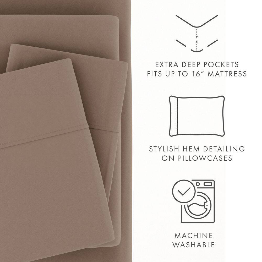 Includes 1-Flat, 1-Fitted, 2-Pcases (TW sets 1-Pcase) 16 in. Deep-Pocket Fitted Sheets Hypoallergenic and antimicrobial for sensitive skin The 4-Piece Classic Sheet Set by Becky Cameron is designed with your comfort in mind. Made of the finest imported double-brushed microfiber yarns creating a new standard in softness and breathability, this sheet set will make it incredibly hard to get out of bed in the morning. Our premium yarns are 2-times more durable than cotton, completely wrinkle free, and perfect for all seasons. Superior weave for durability and a buttery-soft touch Double-brushed microfiber for outstanding comfort Easy care: machine wash cold, tumble dry low, fade resistant, wrinkle free, no ironing necessary California king size set includes: 1-California king fitted sheet: 72in. W x 84 in. L plus 16 in. 1-California king flat sheet: 108 in. W x 102 in. L; 2-king pillowcases: 20 in. W x 40 in. L King size set includes: 1-king fitted sheet: 78 in. W x 80 in. L + 16 in. 1-king flat sheet: 102 in. W x 105 in. L 2-king pillowcases: 20 in. W x 40 in. L Queen size set includes: 1-queen fitted sheet: 60 in. W x 80 in. L plus 16 in. 1-queen flat sheet: 90 in. W x 102 in. L; 2-standard pillowcases: 20 in. W x 30 in. L Full size set includes: 1-full fitted sheet: 54 in. W x 75 in. L plus 16 in. 1-full flat sheet: 81 in. W x 96 in. L; 2-standard pillowcases: 20 in. W x 30 in. L Twin extra-long size set includes: 1-twin extra-long fitted sheet: 39 in. W x 81 in. L plus 16 in. 1-twin extra-long flat sheet: 66 in. W x 96 in. L; 1-standard pillowcase: 20 in. W x 30 in. L