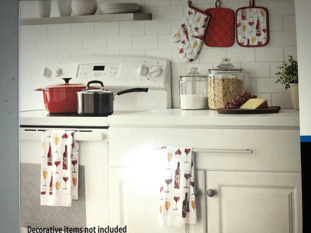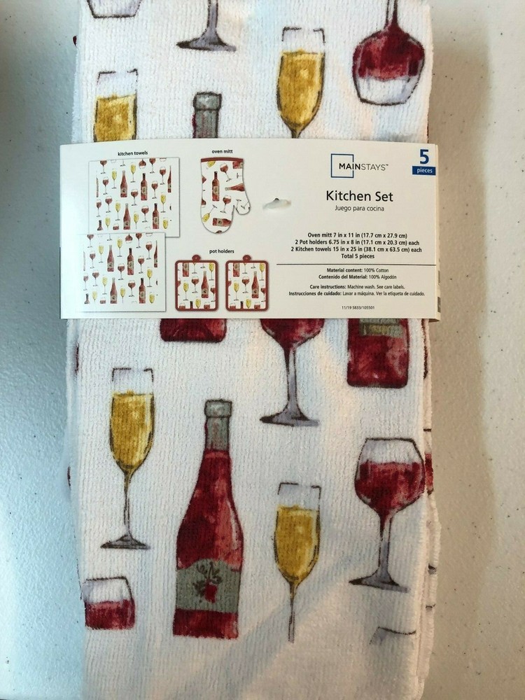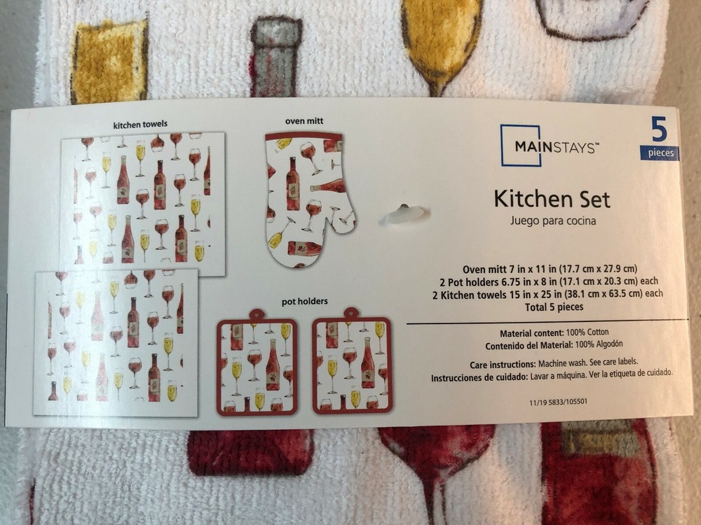 5 Piece Kitchen Set- Mainstays 2 Kitchen Hand Towels 15" x 25" 2 pot holders 6.75" x 8" 1 oven Mitt 7" x 11" The main colors are: Maroon, gold, gray white The MOTIF is: Wine Theme Thank you for your b...