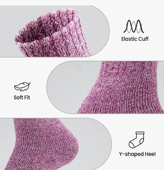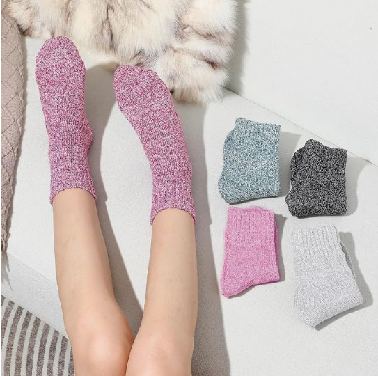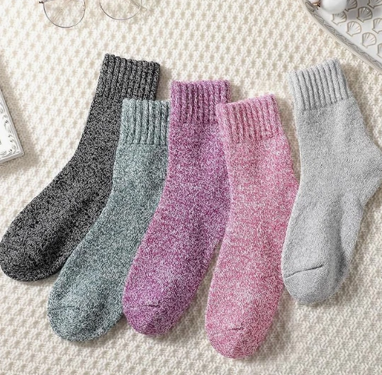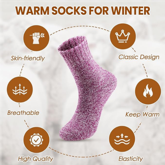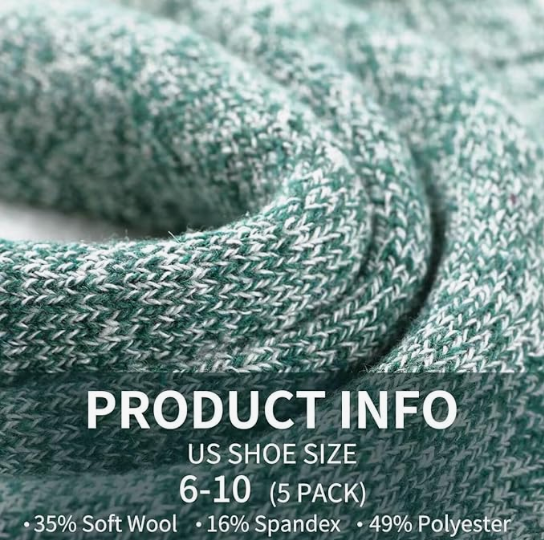 About this item High-quality Material: Made of 35% premium wool + 49% Polyester + 16% Spendex, our wool socks are super cozy, soft, breathable, wearable and doesn't deform easily, which will provide you comfortable and warm feeling during cold weather. Proper Size & Care: Our socks for women are standard US SIZE, suitable for women US shoe sizes 6 to 10. These womens wool socks with elastic material make them easy to wear and take off, and not easy to slip. Please do not iron them and suggesting wash them by hand, good wool socks require the proper care. Warm & Stylish: With classic solid colors and simple style, our warm winter socks are perfect for different occasions and coordinate with any outfits. These warm socks are good matching for all your sneakers, boots, snow boots, and sport shoes. Wear thick knit warm wool socks to keep your feet warm throughout the day. Multiple Occasions: These winter boot socks use terry-loop cushioning throughout the foot and are specifically designed for extreme weather conditions, suitable for hiking, mountaineering, outdoor camping, biking and long-term outdoor work and so on. These womens socks can provide form-fitting and warm functions even after repeated washing. It is suitable all year round. Excellent Winter Choice: These cabin socks women will be perfect presents for your girlfriend, sister, wife, mom, grandma in important holidays. Give these colorful wool socks to the woman you love to keep their feet and hearts warm throughout the cold winter.