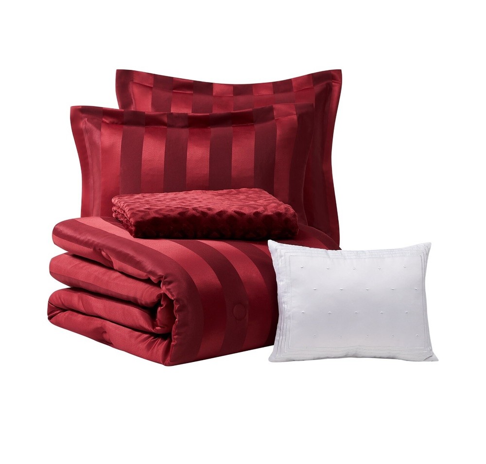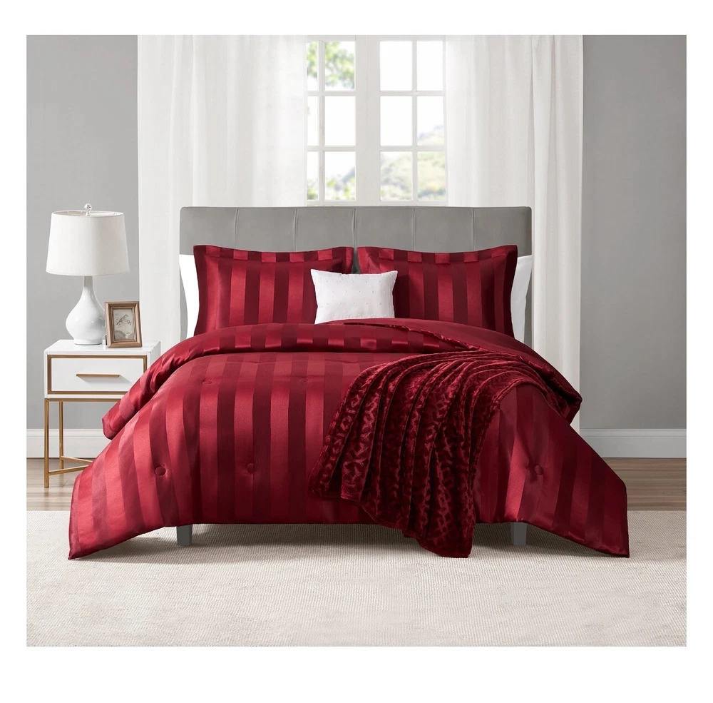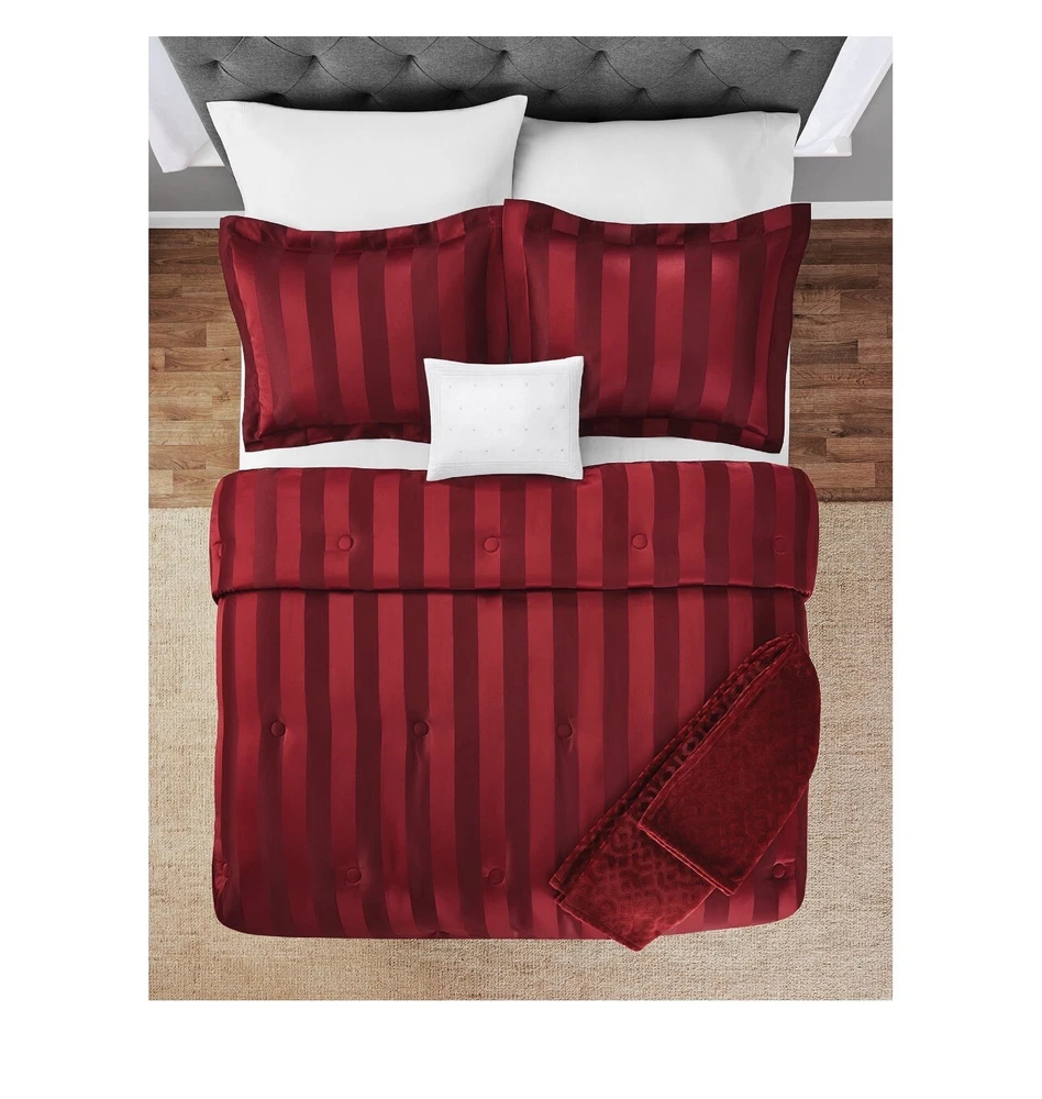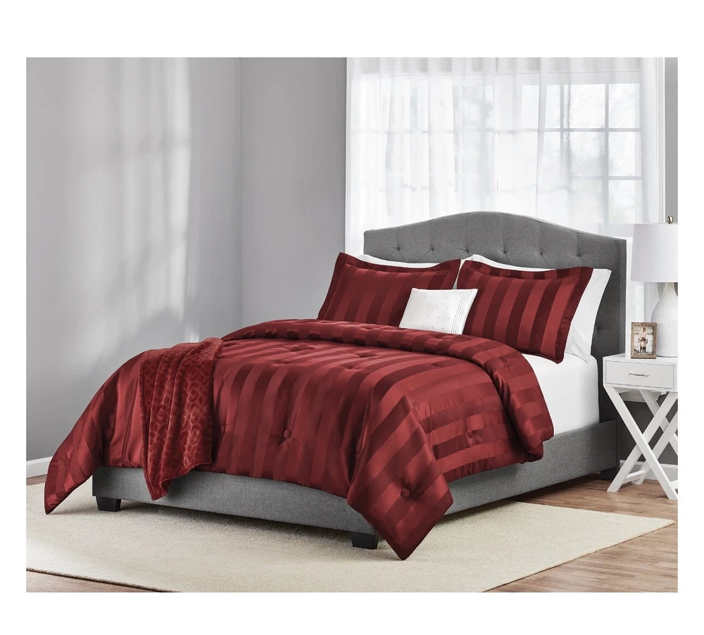 Free Shipping!!!! Add timeless elegance to your bedroom with the 5-Piece Red Damask Stripe Comforter Set. This beautiful set combines a sophisticated damask jacquard stripe pattern in luscious merlot with the perfect accents of a matching merlot throw and a white décor pillow. The Damask Stripe Comforter Set includes one comforter, 2 shams, a super soft embossed plush throw, and embroidered decorative pillow. Woven with a thread weight of 168 GSM and is machine washable for easy care, this comforter set is perfect for everyday use. Revitalize any bedroom with the timeless style of the Luscious Merlot 5 Piece Damask Stripe Comforter Set. This set offers the ultimate experience in comfort and style at a great value. Available in Full/Queen and King sizes. Mainstays 5-Piece Red Damask Stripe Comforter Set is a timeless jacquard pattern that is an elegant addition to any bedroom Crafted from jacquard microfiber offers the ultimate look and hand feel Material: 100% polyester Reversible comforter Luxurious plush throw Full/Queen set includes 1 comforter: 88" x 92", 2 shams: 20" x 26", 1 lumbar decor pillow: 12" x 16" and 1 throw: 60" x 50" Machine washable for easy care Packaged in reusable tote bag Luxurious style for adult master bedrooms, guest bedrooms, teen bedrooms, and more Unisex design We ship only to lower 48 states. We can not ship to Hawaii, Alaska, PO Boxes, or Military addresses. I care about your complete satisfaction. If you have any questions about the items for sale, or have a problem that needs resolved, please email me so we can find a solution. If you enjoy your purchase and our customer service, positive feedback is greatly appreciated. If for any reason you are planning to give me a neutral, negative or a lower rating feedback please contact me first and give me a chance to regain your trust. We are using several different major retailers. The item will be shipped directly from our supplier. In the unlikely event that the item is sold out or on back-order, we will refund 100% of your money immediately. As we love our customers and provide very quick communication and turn around times we require the following: In the event that a product arrives damaged we require a return for a refund or we will provide a return replacement. We do not give a partial refund as retail stores also require a return and do not negotiate partial refunds. Additionally we do not negotiate prices after the item has been purchased. Please be advised we report all feedback solicitations to eBay for investigation. If for any reason you do not want the product or are disappointed for any reason we do not negotiate partial refunds but require a return for a refund or return replacement. Purchasing the item is agreeing to our terms.
