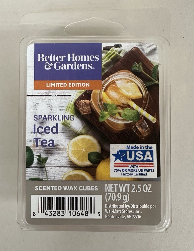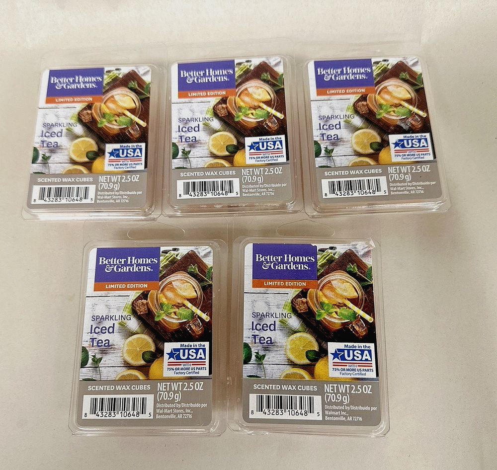 The product is a set of 5 packs of Better Homes & Gardens SPARKLING Iced Tea Wax Cubes. These solid wax cubes are designed as wickless and are intended for aromatherapy purposes. The cubes are infused with the scent of iced tea and emit a fresh fragrance. Made in the United States, they are suitable for use in any room and are ideal for creating a cozy atmosphere in your home. The orange color adds a vibrant touch to your space, making them a stylish addition to any home decor.