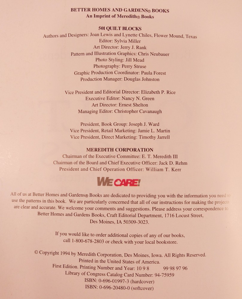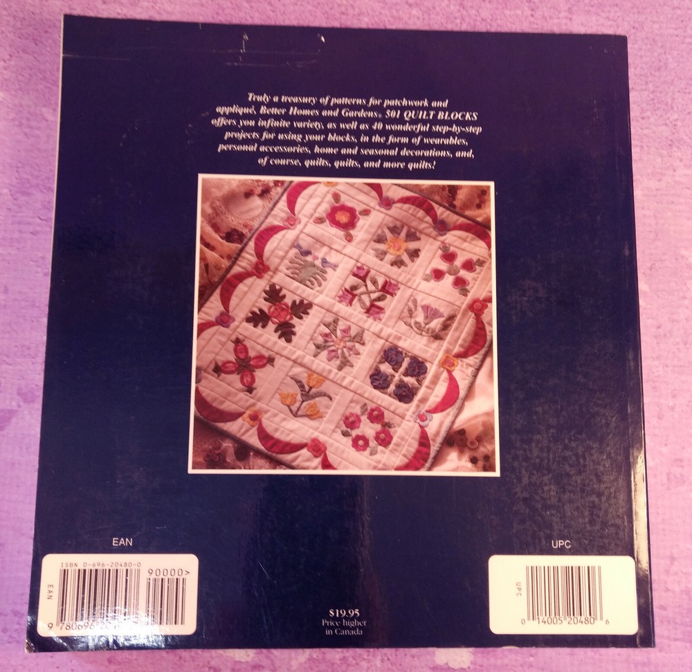 Title: 501 Quilt Blocks: A Treasury of Patterns for Patchwork & Applique Author: Better Homes and Gardens Cover: Softcover Copyright Date: 1995 Size: 9" x 9.5" Number of Pages: 320 Illustrations: Full-color photos and black & white diagrams Publisher: Better Homes and Gardens Summary: A treasury of patterns for patchwork and applique Condition: In very good condition with clean pages and light cover wear including a spot where a label was removed on the front. Visit Purple Squirrel Emporium to discover more treasures with a tail! I add new items daily, so please add me to your favorites list ! I LUV TO COMBINE SHIPPING ~ Please feel free to browse my other items to save money on shipping costs! I will combine shipping whenever possible and practical and charge actual cost plus a $1.00 handling fee per shipment . Please wait until I send a combined invoice in order to take advantage of the shipping discount as it’s not computed automatically by eBay. I appreciate positive feedback! Feedback should be based on things a seller has control over (responding to inquiries, quick shipping, safe and proper packaging, etc.) and not USPS/FedEx/UPS delivery time, which is beyond our control. Buyers should never leave feedback based on delivery time - the seller has no control over this. I appreciate buyers who use common sense when leaving feedback - thank you! It really warms my heart to receive positive feedback from happy customers! I may use recycled shipping materials, which keeps my shipping prices as low as possible and helps the environment. I’ll always pack your order with care and ship as quickly as possible, usually within one business day. If there are any problems with your order, please contact me right away so I can do my best to make things right. Thank you for viewing my listing! Please feel free to email me with any questions. A NOTE TO INTERNATIONAL BUYERS: Import duties/taxes/customs fees/brokerage fees are not included in the item price or shipping charges. These charges are the buyer’s responsibility and are normally collected by the shipping service. Please check with your country’s Customs office to determine what these additional costs will be prior to bidding/buying. I don’t mark merchandise “gift” on Customs forms, which is prohibited by government regulations.