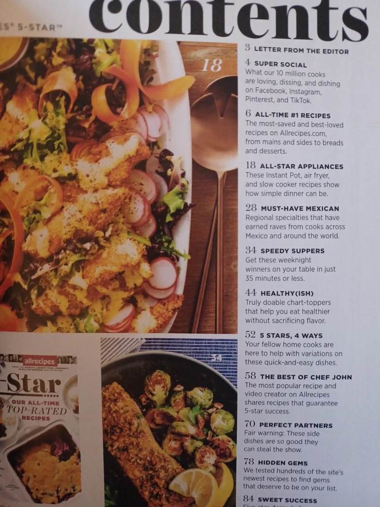5-Star Allrecipes Magazine. To see table of contents please see pictures. Shipped with media mail. **These Magazines are new as in never owned before. They are magazines I recieve that didn't sell off the retail shelves. They are in great condition. Not perfect. Some are perfect. I don't list these as collector items. If you would like a picture of the copy you recieve I can send pictures upon request. I ship all of my magazines with cardboard to ensure no damage from post office. When you open the envelope, the side with the address has the cardboard and safe to cut open on that side. Please take a look at seller's other magazine's 😊