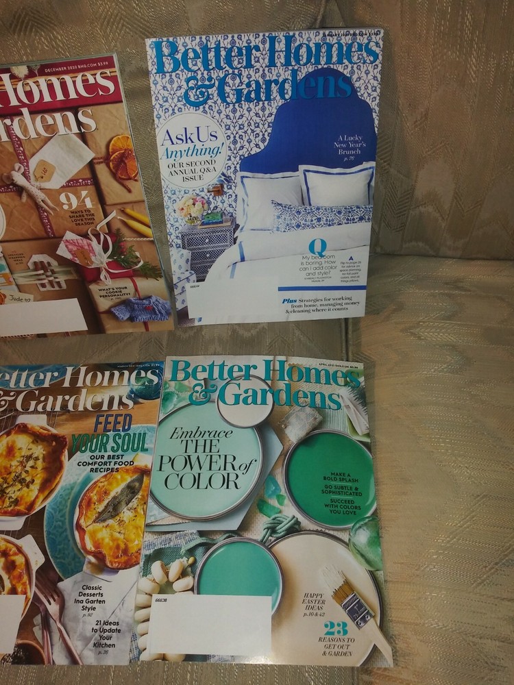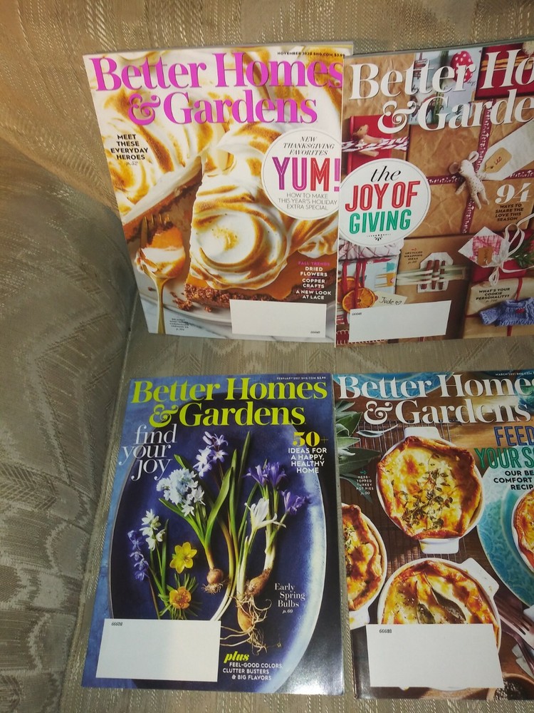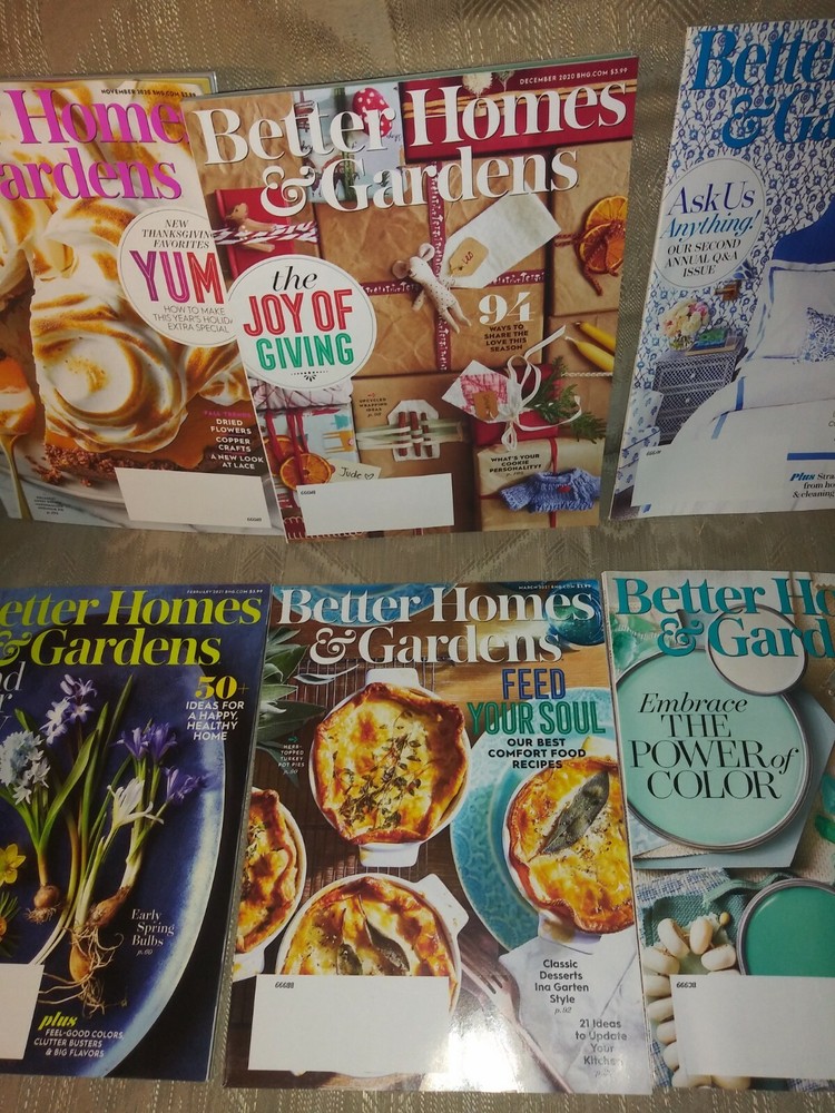 6 Better Homes & Gardens Magazines November 2020 - April 2021 Current Issues Lot. November 2020 New Thankagiving Favorites December 2020 The Joy Of Giving January 2021 Ask Us Anything Q & A Issue February 2021 50+ Ideas For A Happy Healthy Home March 2021 Feed Your Soul Comfort Food Recipes April 2021 Embrace The Power Of Color Condition is Good. Shipped with USPS Priority Mail. Item is not from a smoke free home.