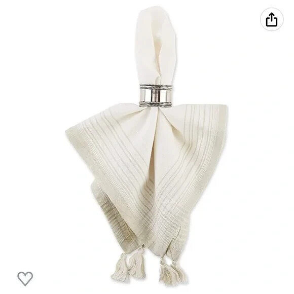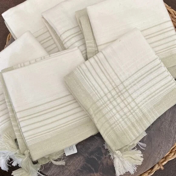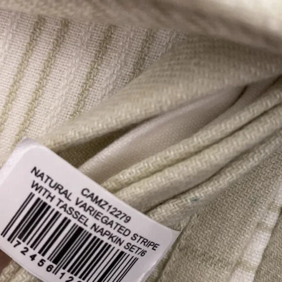Design Imports Rustic farmhouse Boho Napkin Set 20x20 Natural variegated stripe with tassel 6 Piece 100% cotton made in India White with khaki plaid stripe Tags Cottage cottage, core, rustic farmhouse, country French country, natural, neutral, minimal minimalist nature