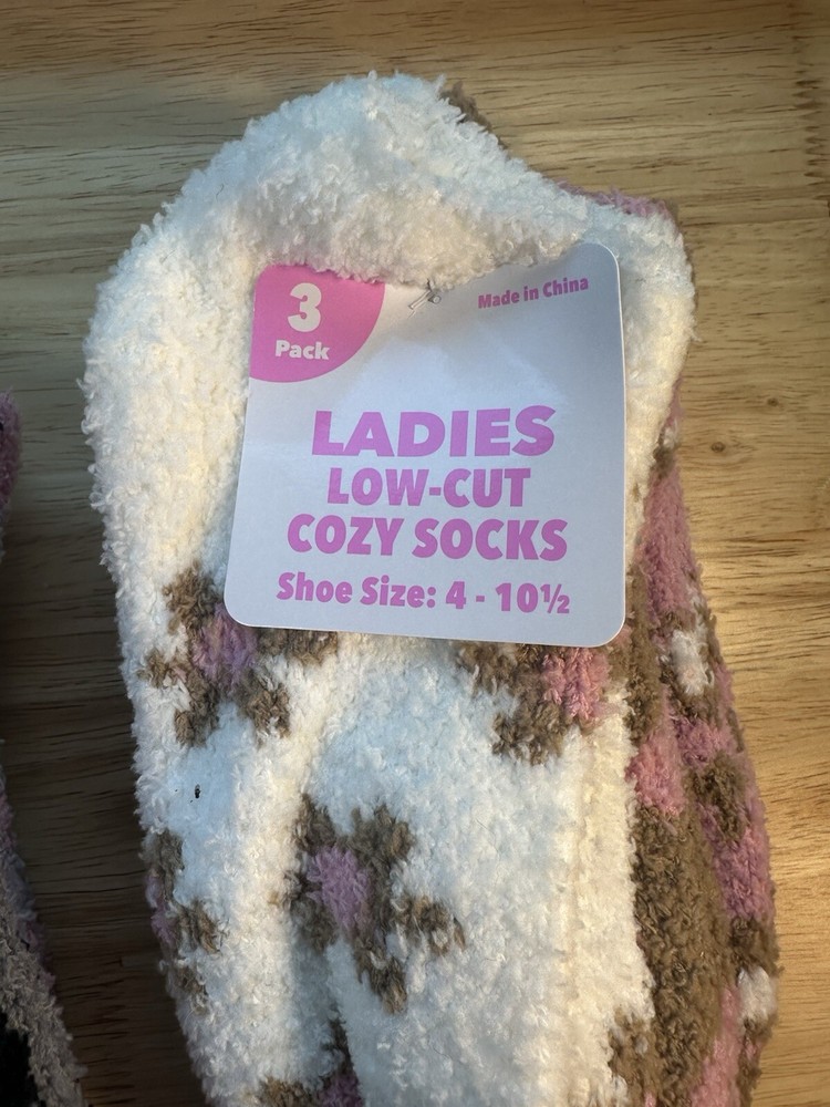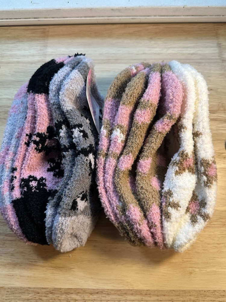 The product is a set of 6 pairs of women's cozy, fuzzy crew socks in multicolor, ranging in size from 4 to 11. Made of 99% polyester and 1% spandex, these socks are lightweight and perfect for adding a touch of comfort to any outfit. The crew length and soft material make them ideal for keeping your feet warm and stylish in colder weather. Item hk-1