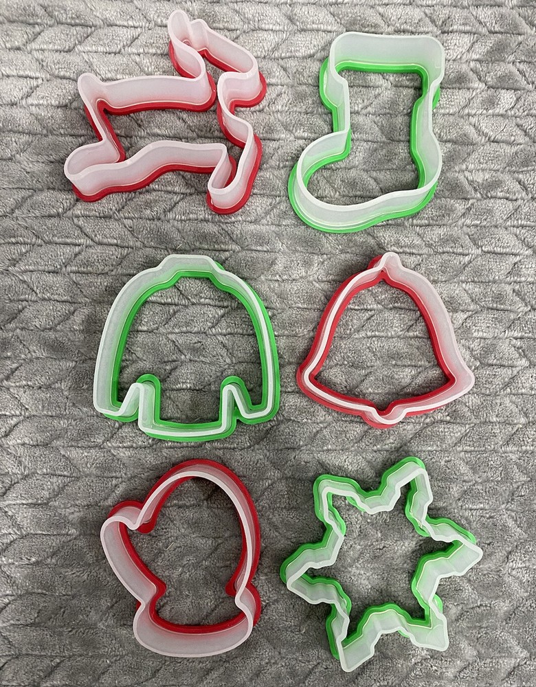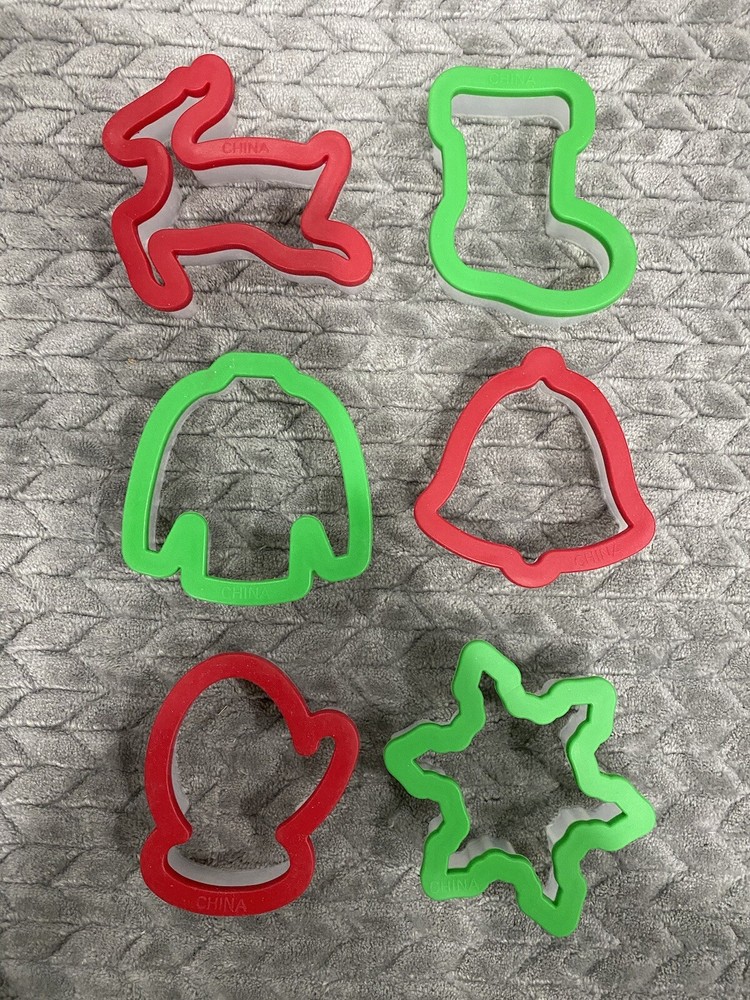 6 Piece Cookie Cutter Red Green Set Soft Grip Shapes Mitten Stocking Ugly sweater / shirt Snowflake Bell Reindeer Quick shipping Smoke and pet free home.