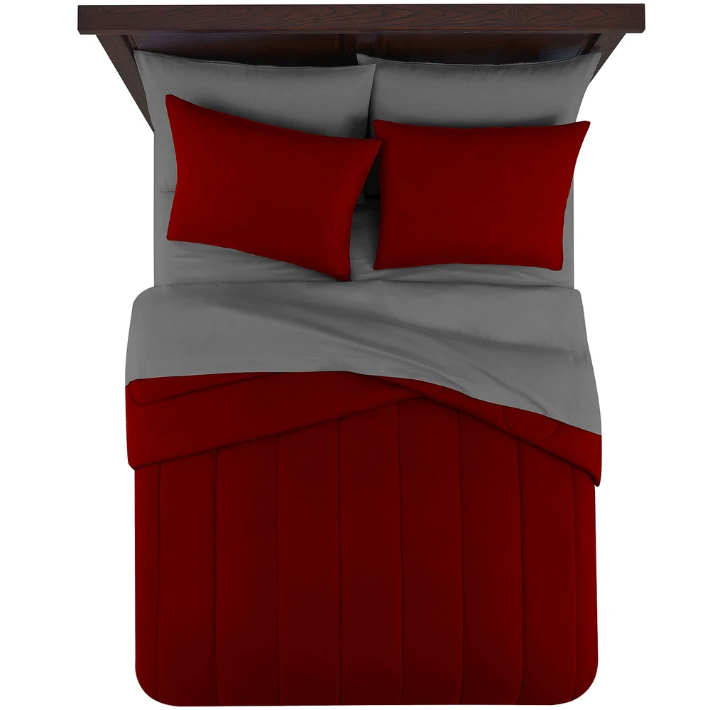 6 Piece Solid Bed in a Bag Bedding Comforter Set, Available in various colors Give your space a solid grounded look with Mainstays Solid Bed in a Bag. Available in Red, Gray and Black this bedding set gives you options to update your room in dark or bright colorways. The Red bedding set features a dark gray neutral sheet set that help tone down the look of the deep red comforter for a perfectly contrasted look. The Navy bedding set features a light blue solid sheet set that offers a hint of light colors to your dark bedding set. The Black bedding set features a dark gray neutral sheet set providing a dark and neutral color combination. Complete the look of your Mainstays Solid Bed in a Bag with the bed skirt that perfectly matches the red, navy or black toned comforter. Each Mainstays Solid Bed in a Bag includes a comforter, sheet set, pillow case(s), sham(s) and a bed skirt. Available in twin, full, queen and king sizes so you have plenty of options to make this bedding set work in you home. Made with 100% polyester microfiber for softness and comfort that will have you sleeping soundly all-night long. Mainstays Solid Bed in a Bag is easily integrated into your already decorated space. Update your bedroom today with a solid grounded look with Mainstays Solid Bed in a Bag. Mainstays Solid Bed in a Bag Coordinated Bedding Available in various sizes and colors Available in Red, Navy, Black and Mint 100% Polyester Machine Washable Twin Size includes: 1 twin comforter (64”x86”), 1 fitted sheet (39”x75”+14”), 1 flat sheet (65”x94”), 1 standard pillowcase (20”x30”), 1 standard pillow sham (20”x26”) and 1 bed skirt (39”x75”x14”) Full Size includes: 1 full comforter (76”x86”), 1 fitted sheet (54”x75”x14”), 1 flat sheet (80”x94”), 2 standard pillowcases (20”x30”), 2 standard pillow shams (20”x26”) and 1 bed skirt (54”x75”+14”) Queen Size includes: 1 queen comforter (86”x86”), 1 fitted sheet (60”x80”+14”), 1 flat sheet (86”x100”), 2 standard pillowcases (20”x30”), 2 standard pillow shams (20”x26”) and 1 bed skirt (60”x80”+14”) King Size includes: 1 king comforter (102”x86”), 1 fitted sheet (78”x80”+14”), 1 flat sheet (104”x100”), 2 king pillowcases (20”x40”), 2 king pillow shams (20”x36”) and 1 bed skirt (78”x80”+14”)