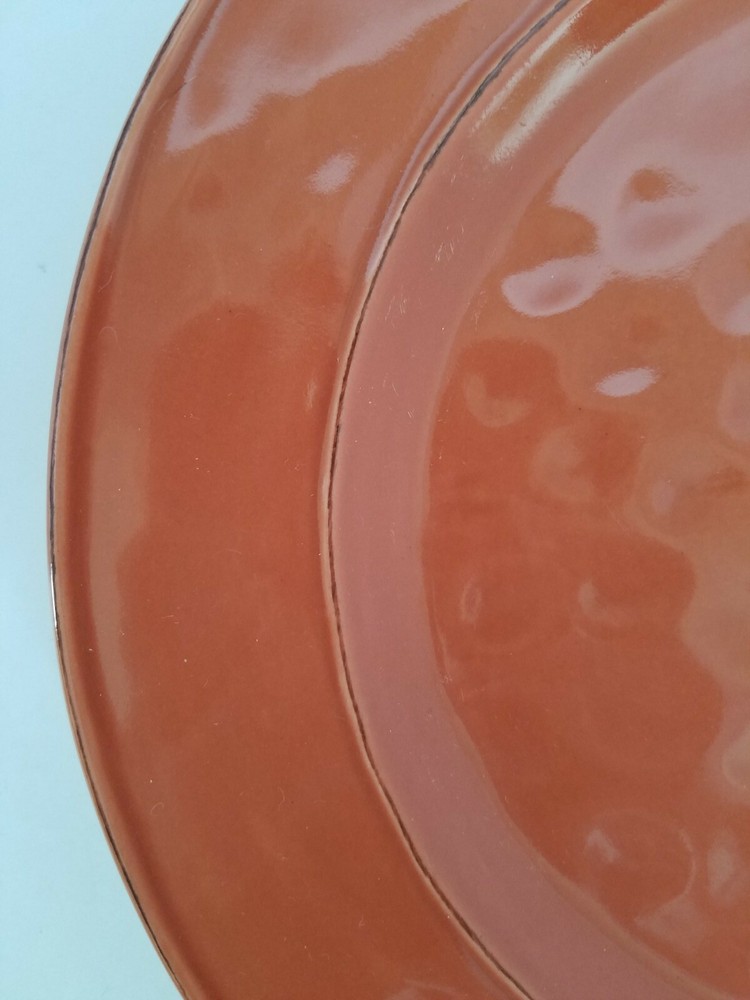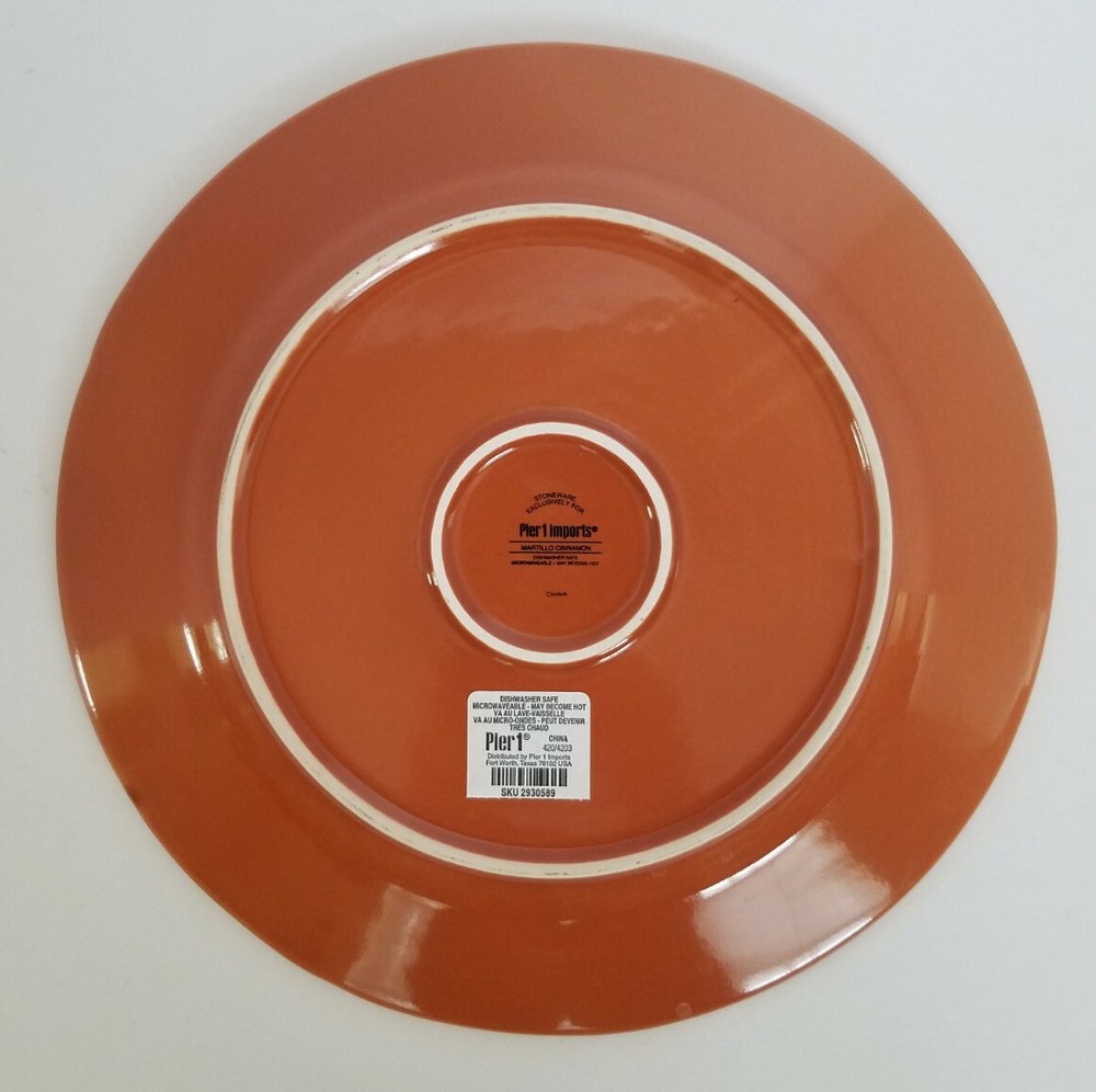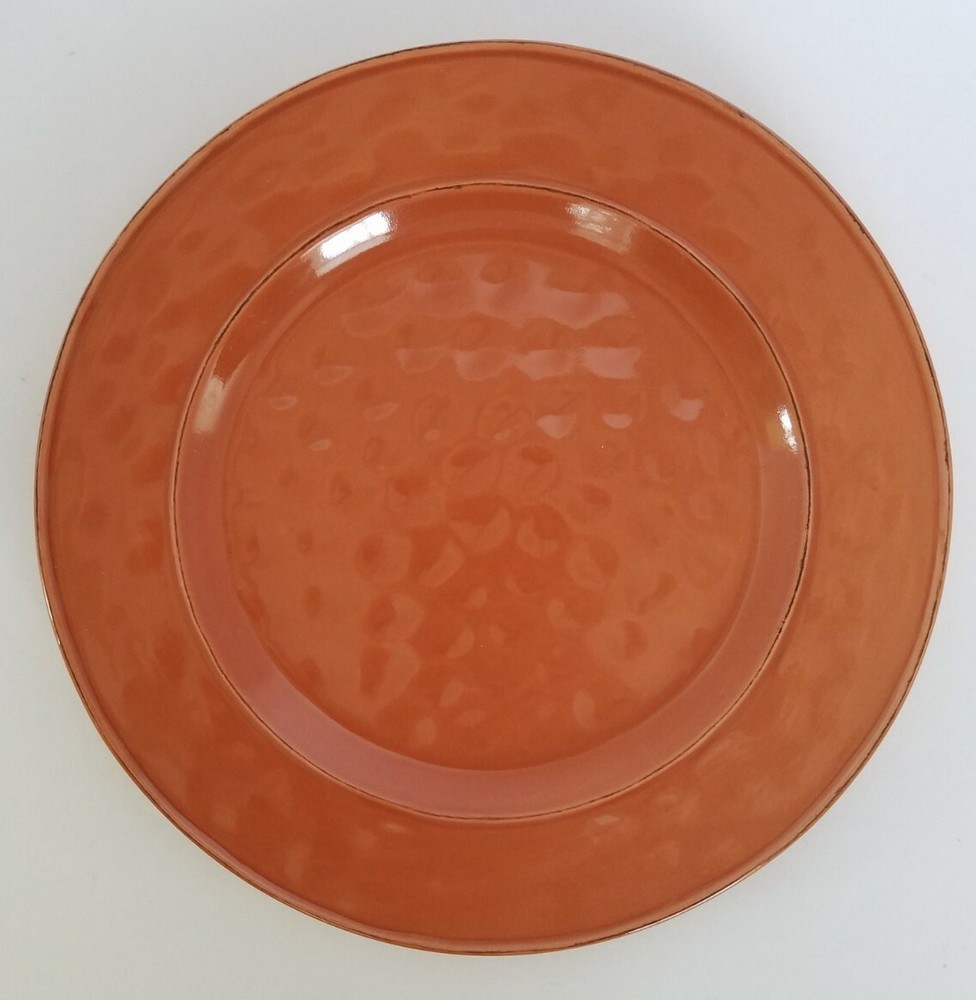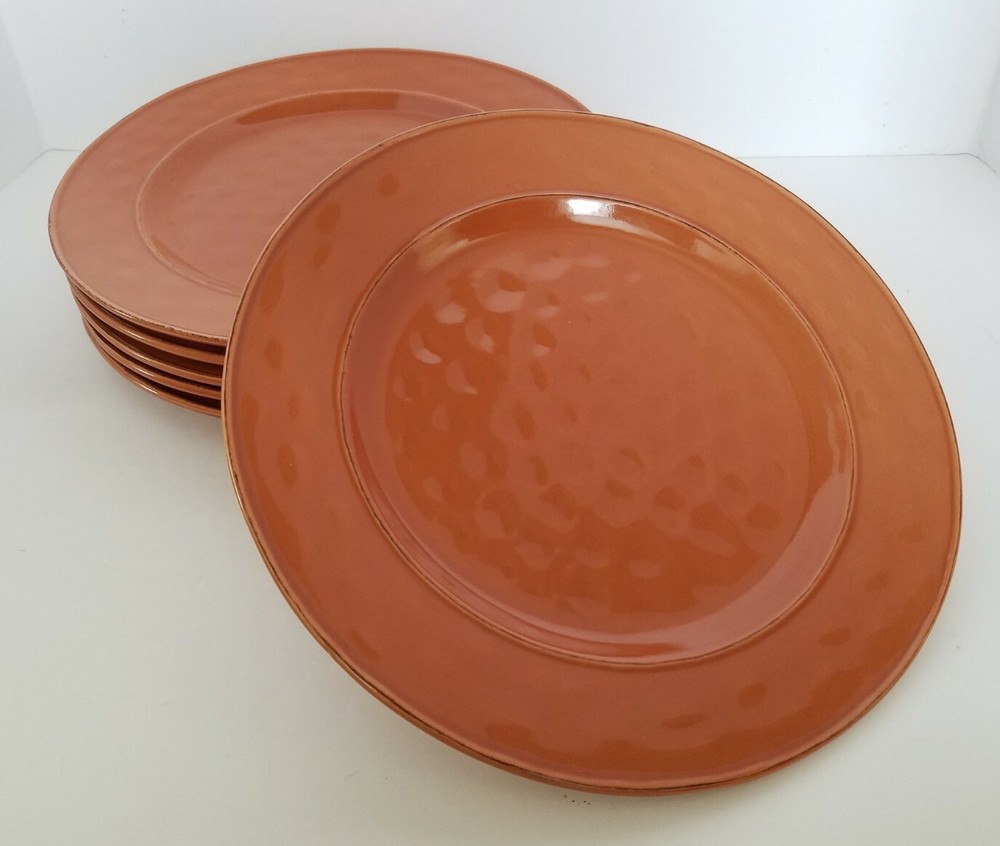 6 Pier 1 Martillo Cinnamon 11" Dinner Plates Rust Orange NWT Set of 6 stoneware dinner plates in the discontinued (2015-2016) Martillo Cinnamon pattern from Pier 1. All cinnamon colored with an embossed edge and verge accented with brown, lightly embossed with an indentation, hammered pattern. Plates measure 11" across, in unused condition with no chips, cracks, or utensil marks, with the original stickers on the bottoms. See my other listing for more in the Creme Brulee color. If you purchase more than one item, please wait for an invoice before you pay so I can combine shipping. Payment is due at the time of sale . Item will be shipped the same or the following business day. I reserve the right to re-list the item if payment is not received in 2 days. Shipping is with USPS, UPS, or FedEx. I will use the most economical method for your package. Please contact me, before or after purchase, with any questions using the ebay messaging system. I will be happy to answer all questions within 24 hours. I do my best to accurately describe all my items and strive to make your experience with me a positive one! I will leave feedback for you as soon as I know your item has been safely delivered. The same is much appreciated from you if you are happy with your purchase! All returns accepted within 30 days. IF A RETURN IS NECESSARY, PLEASE CONTACT ME DIRECTLY BEFORE YOU INITIATE A RETURN THROUGH EBAY!!! Seller pays return shipping if defective or misrepresented, refund will be given as money back. Thanks for stopping by!