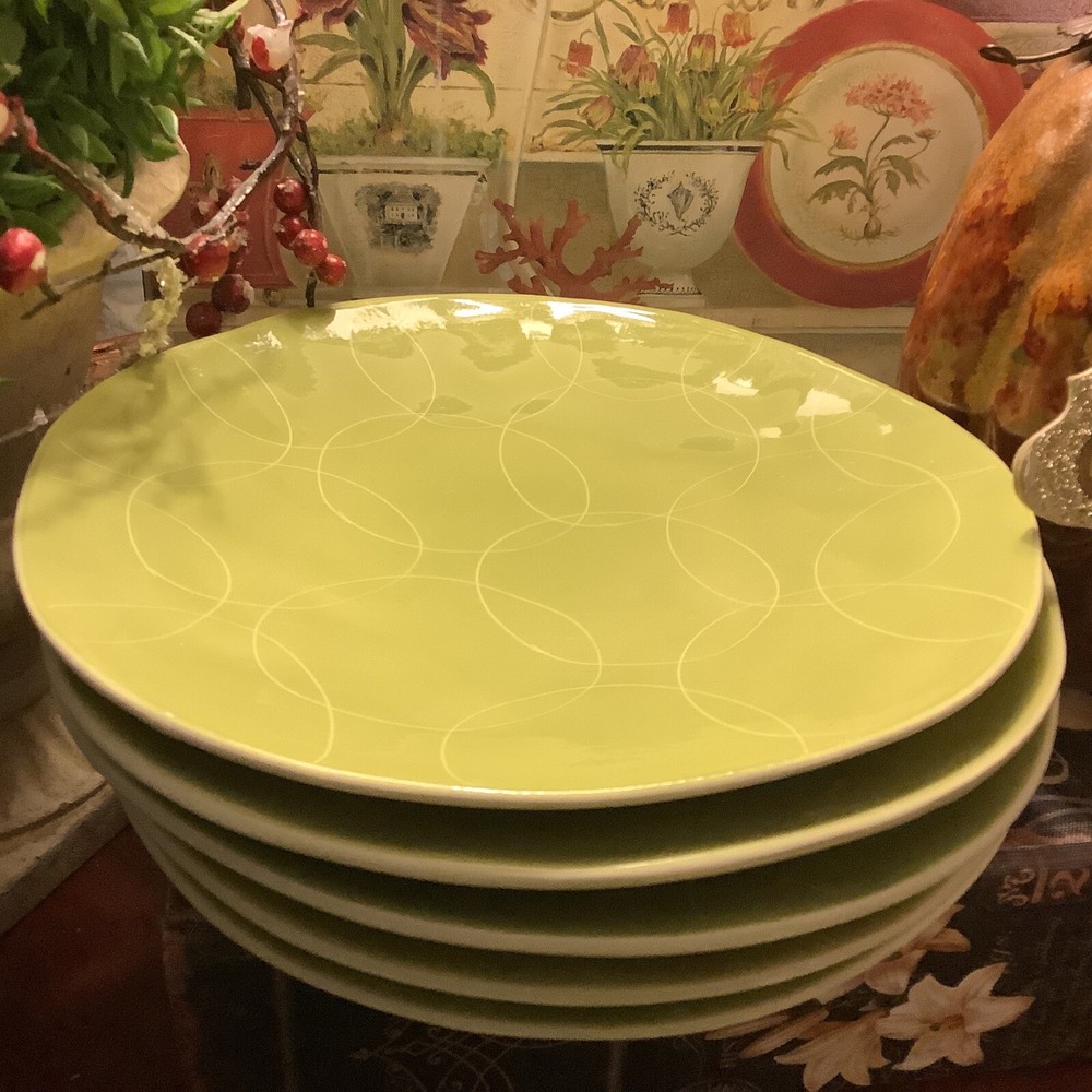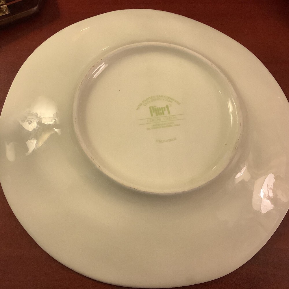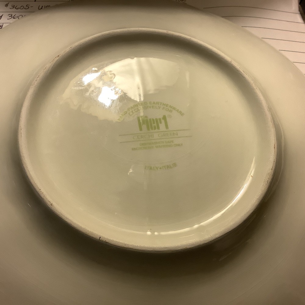 (6) Pier 1~”CERCHI GREEN”~9” Luncheon/Salad~Plates~Hand-Painted/Earthenware~ Absolutely beautiful Cerchi Green pattern~Green with light white circles~Made in Italy~Hand Painted~Earthenware~Made Exclusively for Pier 1~Discontinued Pattern~Dishwasher and Microwave Safe for Warming~These plates look like new~Could be luncheon/salad or dinner plates~I love these and they would go splendidly in any decor~ Inventory code #3623 FREE SHIPPING to continental continuous USA ~ Love 💚other items in our store? We will gladly combine shipping ~ All sales are final. We don’t do buyers remorse, but we do take care of our clients ~ Buy with confidence ~ We reserve the right to ship with priority rate, FedEx or UPS depending on where you live, weight and size of the box 📦 ~ We ship safe and secure see our wonderful feedback 😉 Thank you for looking at our beautiful finds ~