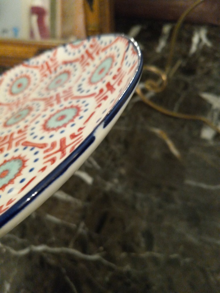 RARE Set Of 6 Salad Plates Dessert Plates Pier 1 LILY red Green Blue Stoneware. Six 8.25 inch Plates. One has a glaze issue but nothing major, please see last pics. No chips or cracks. No crazing. Pet...