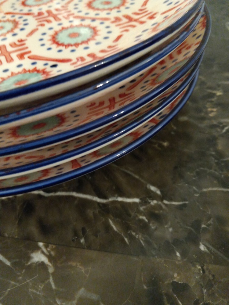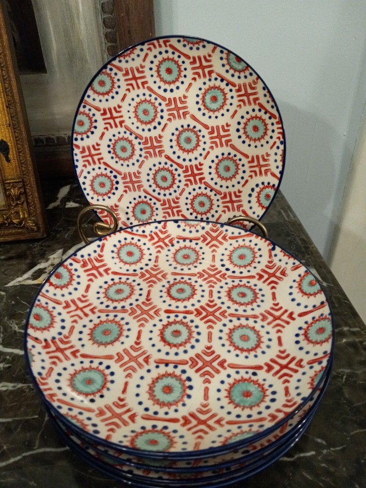 RARE Set Of 6 Salad Plates Dessert Plates Pier 1 LILY red Green Blue Stoneware. Six 8.25 inch Plates. One has a glaze issue but nothing major, please see last pics. No chips or cracks. No crazing. Pet and smoke free location.