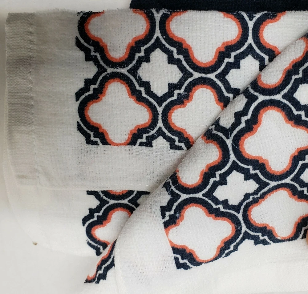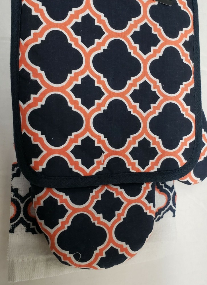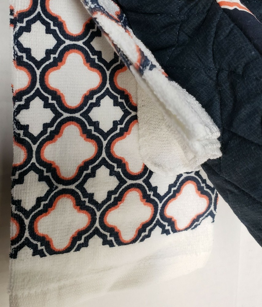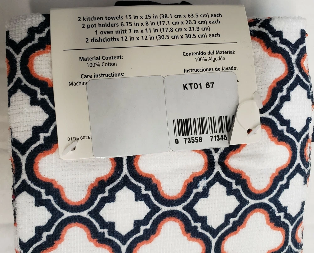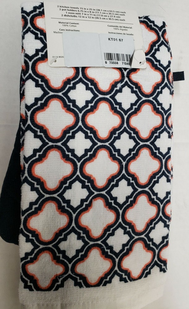 I'm selling a Printed Kitchen Set of 7: 2 POT HOLDERS (7" x 8"), 1 OVEN MITT (7' x 13"), & 2 TOWELS (15" x 25"), & 2 DISHCLOTHS (RAGS), RED, WHITE & BLUE DESIGN as shown on the pictures. Machine Wash. It's brand new, with tags. Made by Franco & Mainstays In China. Please check out my other listings and if you buy multiple items, please contact me and I will find out how I can combine your shipping. I ship to USA only (or internationally using Global Shipping)