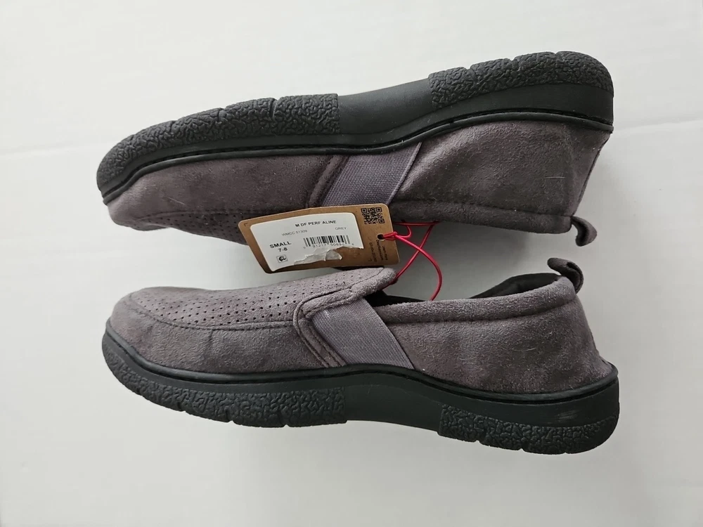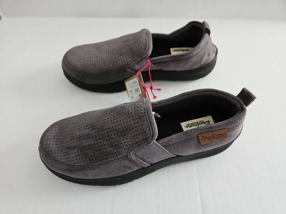 Experience ultimate comfort with these men's Dearfoams slippers. The perforated microsuede upper and cushioned memory foam footbed provide superior support and temperature regulation. The flannel lining and synthetic outsole add to the durability and ease of wear. These slippers are perfect for indoor and outdoor use, with a stylish moc toe design and closed back closure. The gray color and microsuede fabric type make these slippers a great addition to any wardrobe. With a flat heel height and machine washable features, these slippers are perfect for everyday wear. Don't miss out on the opportunity to own these cozy and stylish slippers.