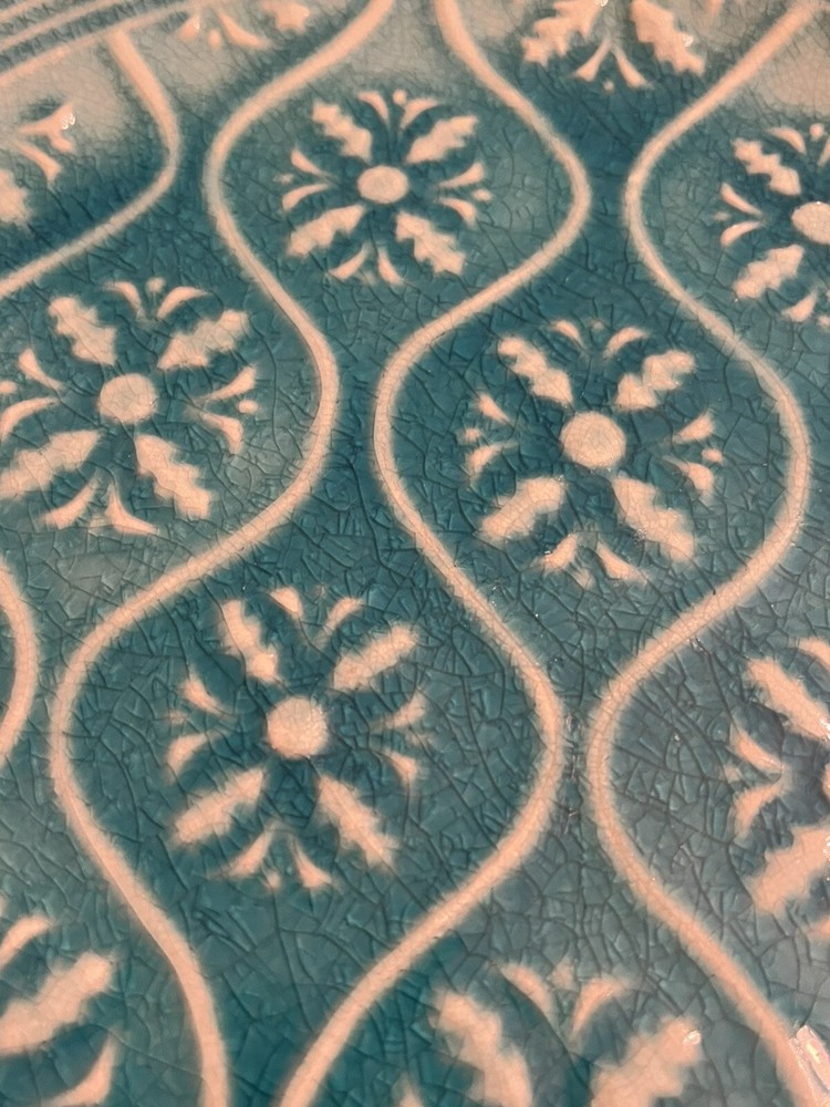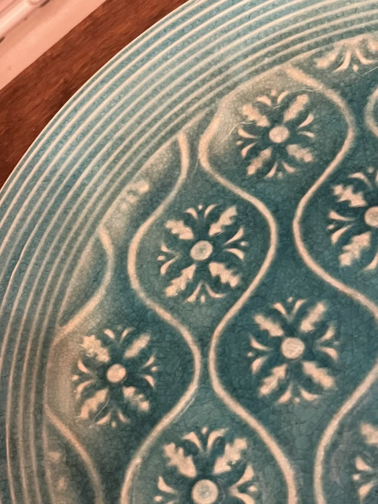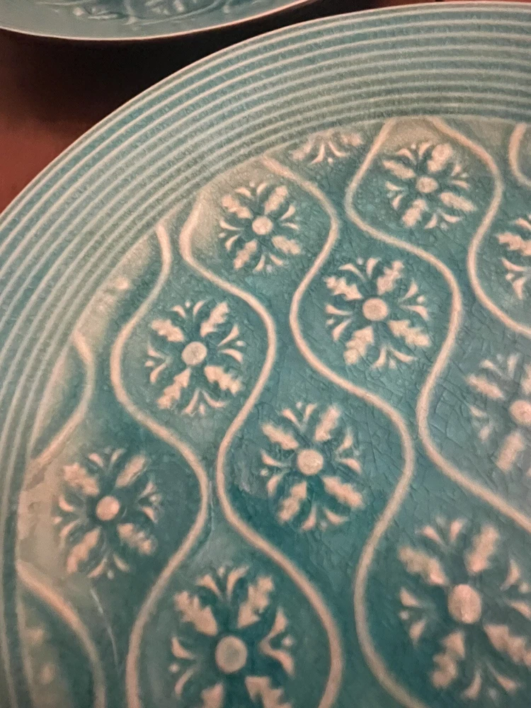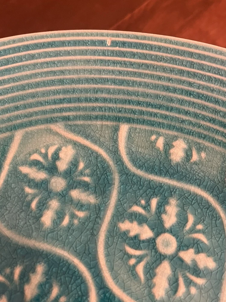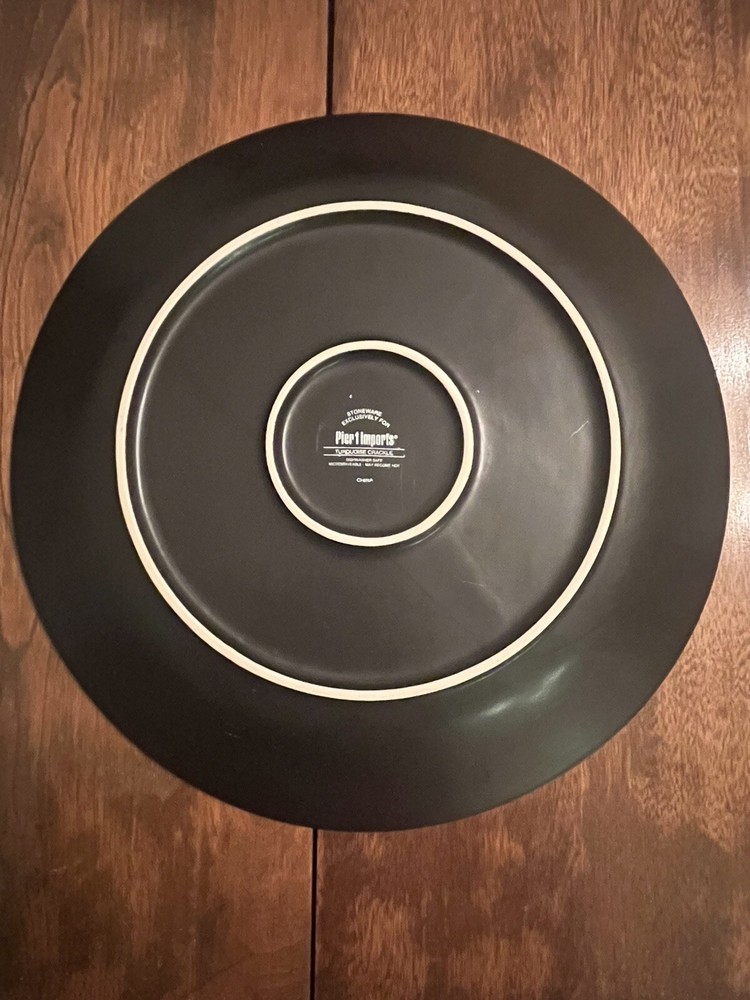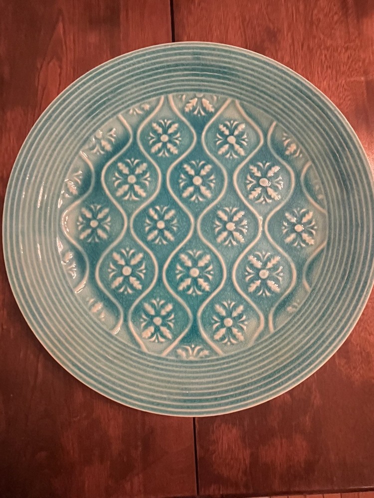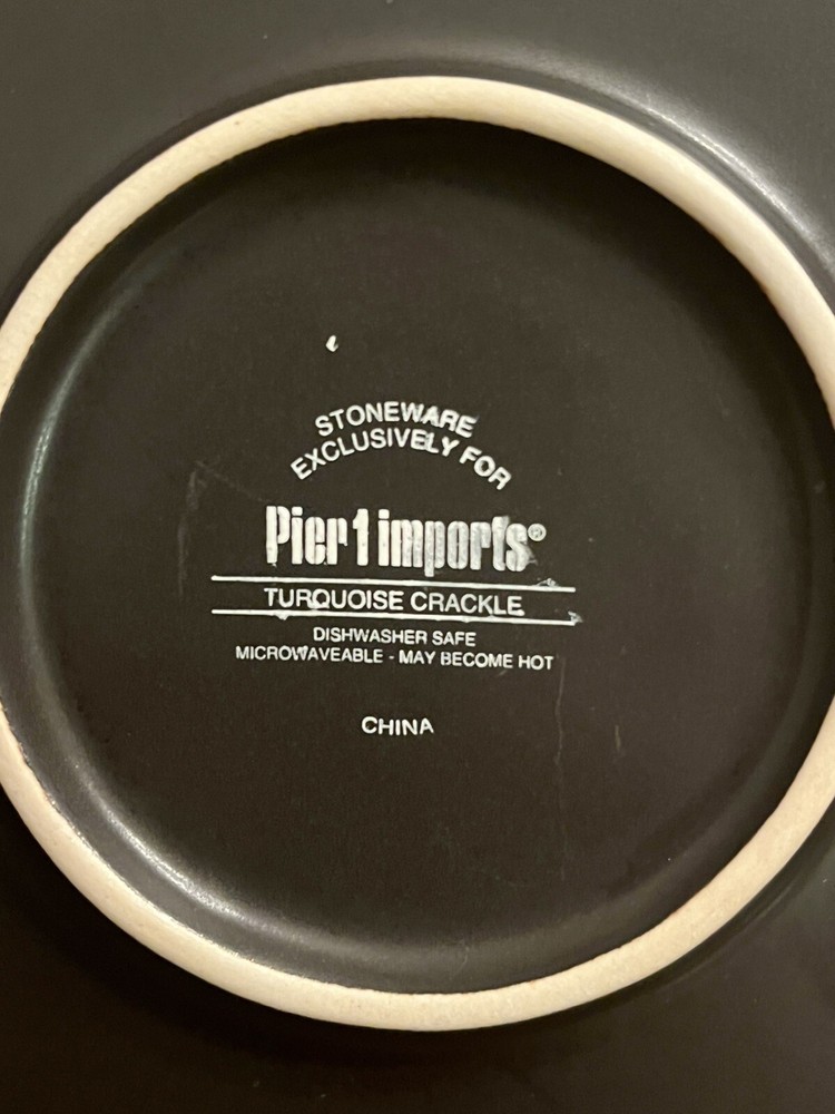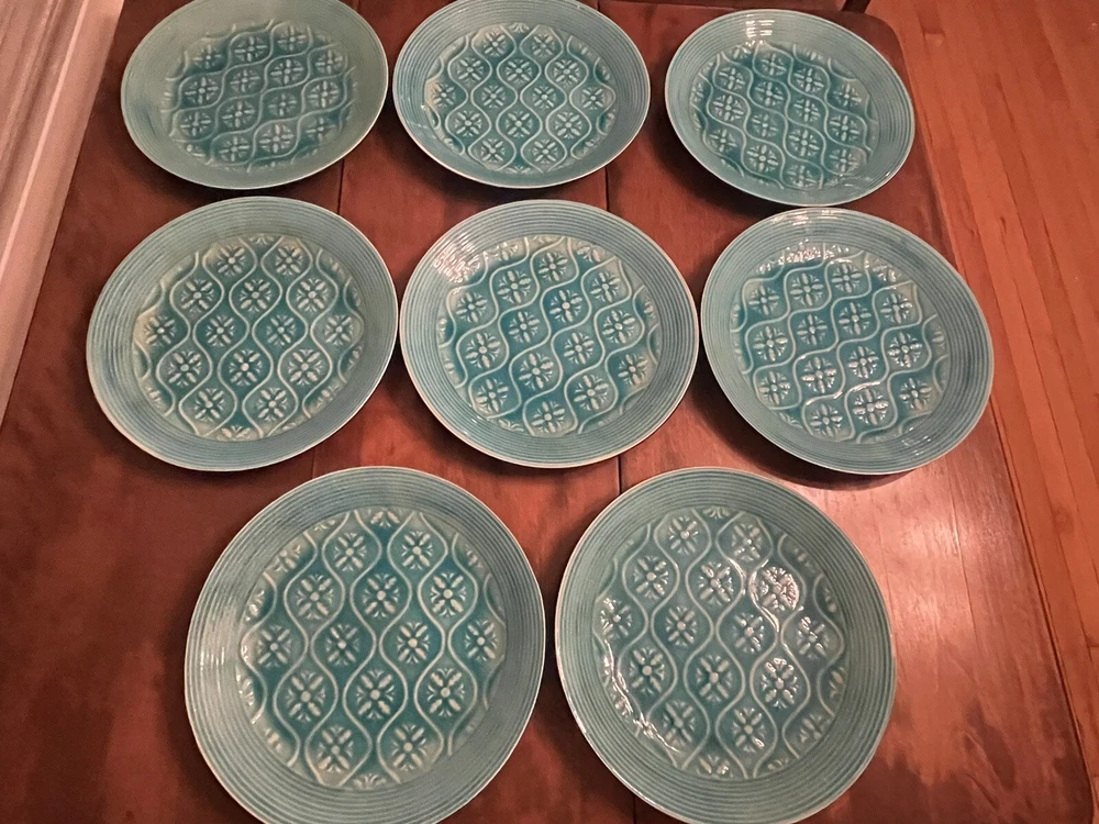Note: there is one small chip on one plate - see pictures. There also seems to be some staining from use on a few plate but not very noticeable. Again see pictures. They are heavy plate and discontinued so they cannot be found in stores anymore. This set of eight Pier 1 Imports dinner plates features a beautiful blue and turquoise crackle design. The plates are made of stoneware and have a glossy finish. They are dishwasher safe and have a production style of art pottery with a latticework pattern and round shape. These plates are perfect for all occasions and are a great addition to any kitchen.