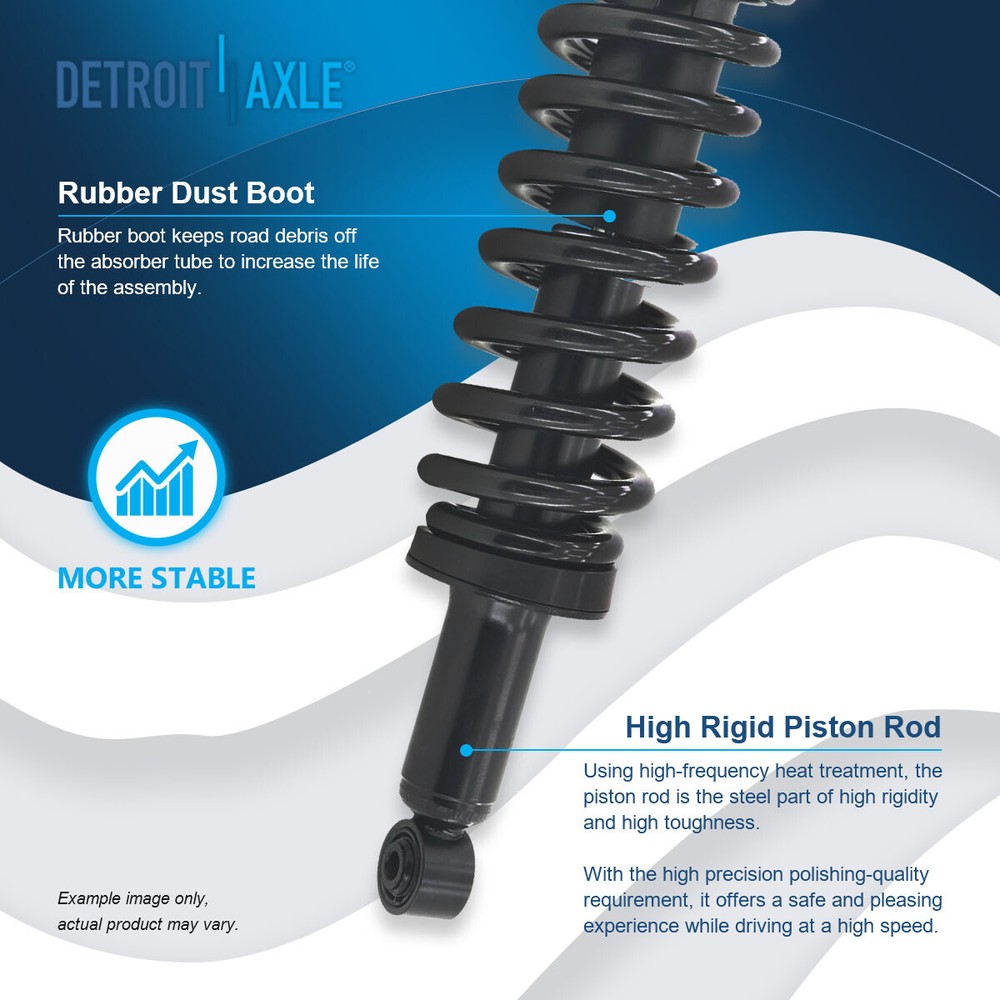 Warranty Details Click here for Warranty Details Questions? Call us! Monday-Friday 8am - 6pm ET Saturday 8am - 4pm ET 8pc Front Strut & Coil Spring Assembly Suspension Kit Fits Driver and Passenger Sides Pre-assembled and ready to install! No special tools required! Kit Includes 1x Complete Front Strut & Coil Spring Assembly - Driver Side - 17 1347L 1x Complete Front Strut & Coil Spring Assembly - Passenger Side - 17 1347R 2x Front Sway Bar End Link - Driver & Passenger Side - K90680 1x Front Outer Tie Rod End Link - Driver Side - ES80382 1x Front Outer Tie Rod End Link - Passenger Side - ES80381 2x Front Upper Ball Joints - Driver & Passenger Side - K90255 Each Assembly includes: Strut Coil Spring Boot Bumper Kit Spring Seat Isolator FITS MAKE MODEL YEAR RANGE SPECIFIC DETAILS TOYOTA TUNDRA 2003 - 2006 All Models Not what you were looking for? Search our Store Page to find the right part! Brand Information Detroit Axle, offers parts and accessories for the perfect combination of quality and value. Detroit Axle offers cost-conscious customers a full range of parts to a broad range of applications Provides extensive coverage of bearings for a broad range of automotive and heavy-duty 4x4 wheel applications. Manufactured in ISO 9000 / ISO 9001 / ISO 9002 certified facilities gives the fit, performance Reliability and durability of OE. Detroit Axle offers an extensive lineup of Wheel Bearings, CV Axles, Power & Manual Steering Rack & Pinions, Gear Boxes, Ready Struts, Drive Shafts, Prop Shafts and much more. Manufacturer Information Detroit Axle offers an extensive coverage of bearings for a large range of automotive and heavy-duty wheel end applications. Our Products are manufactured in ISO 9000 / 9001 / 9002 certified facilities. Detroit Axle products deliver the look, feel, fit and performance of OE. Manufactured with Internal bearing seals that are specifically designed to combat all types of road conditions to keep debris out and keep the bearing turning. With an OE design, simple installation and long life as a guarantee. Payment Visa, and MasterCard are the accepted forms of payment. Please use the eBay checkout system when paying for your order. Immediate payment is required for all orders. Shipping All orders placed before 2pm (Eastern Standard) will be shipped the same business day. Orders made after 2pm (Eastern Standard) will be shipped the following business day. All orders in the continental 48 States will be shipped FREE of charge via FedEx or USPS at our discretion. Orders outside the continental 48 States (Alaska, Hawaii, Puerto Rico, US territories, or International) will be required to pay a surcharge for shipping. International orders will be shipped via USPS Priority Mail International. Return Policy Customer must contact Detroit Axle within 30 days of receiving shipment for approval of any return or exchange. Returns or exchanges will be subject to a 15% restocking fee of the original item purchased plus cost of return shipping and replacement shipping. Exchanges due to shipping errors by Detroit Axle will not be subject to a restocking fee or shipping charges. Track Page Views With Auctiva's FREE Counter