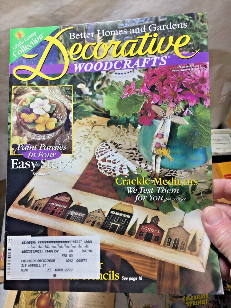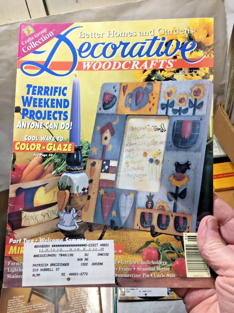 (1224) - 9 - 1997 & 1998 Better Homes & Garden Decorative Woodcrafts Magazine Issues - i n good shape with mailing labels. From 1997 issues are April, June, August, October, December, December. From 1998 issues are February, June, August.