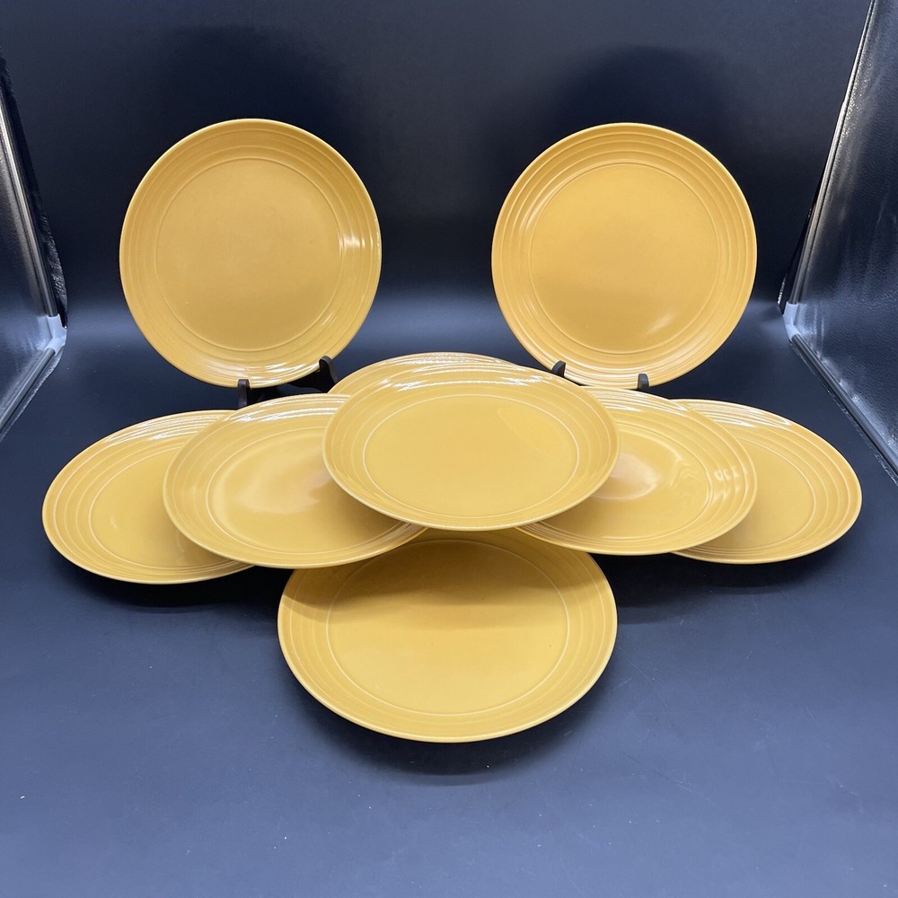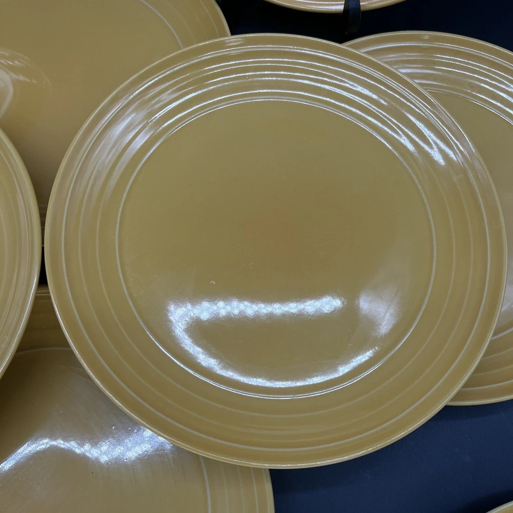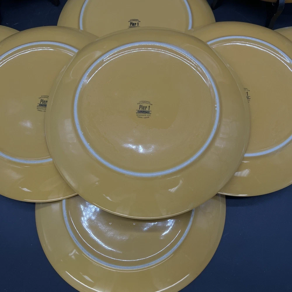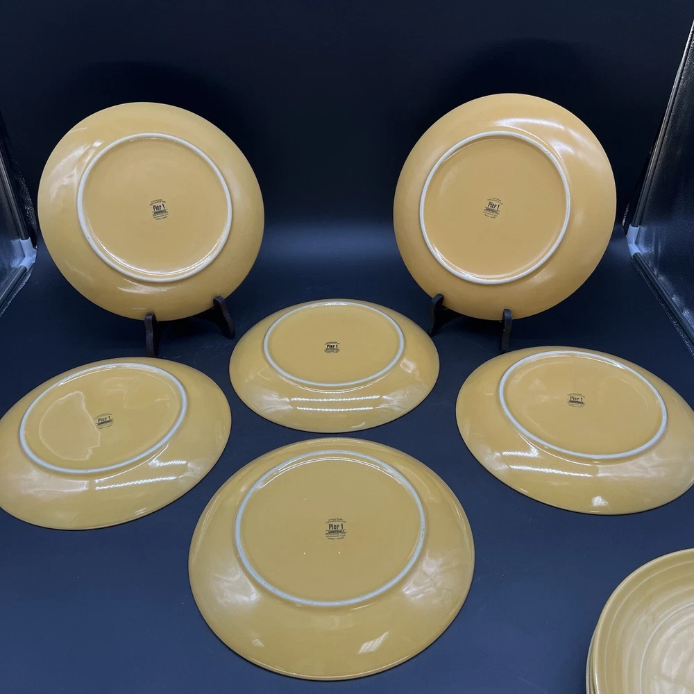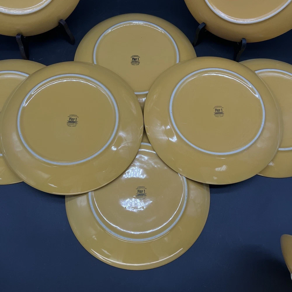 This set of 9 dinner plates from Pier 1 is perfect for all occasions. The plates are round with an 11" width and are made of stoneware in a beautiful yellow color. Each plate is hand-painted with an essential colors pattern, making them unique and eye-catching. These plates are not only beautiful but also practical, as they are microwave and dishwasher safe. They were manufactured in 2008 and are an original production style in earthenware. The plates were made in China using the pottery production technique and have a printed backstamp. These plates are perfect for anyone who loves handmade, high-quality dinnerware. See photos for size and condition.