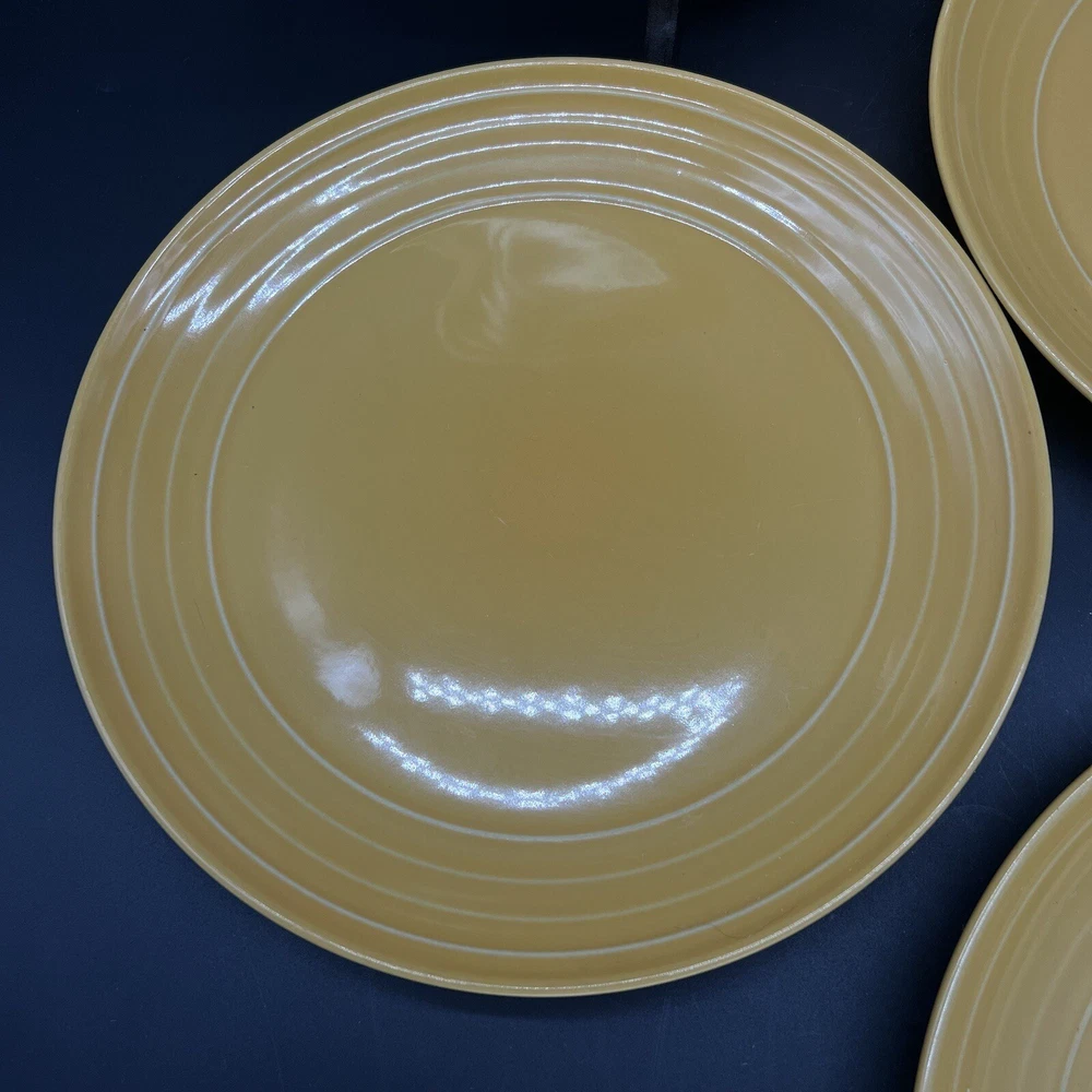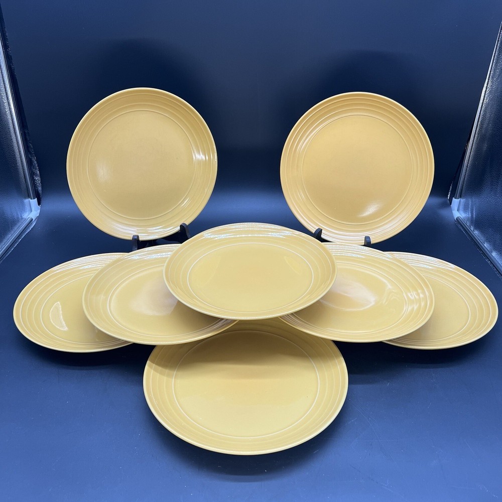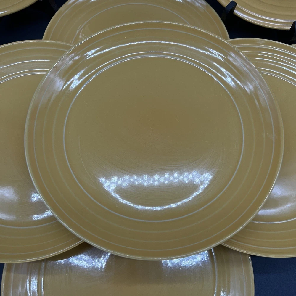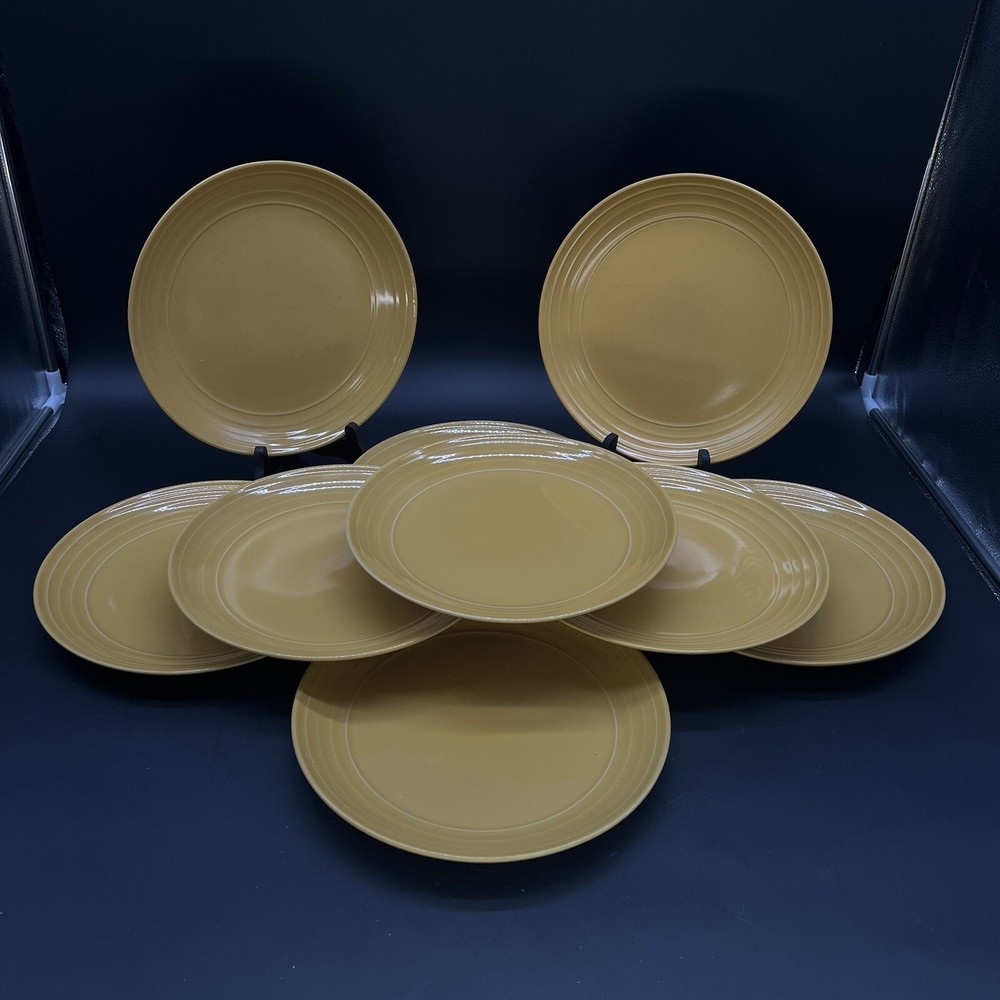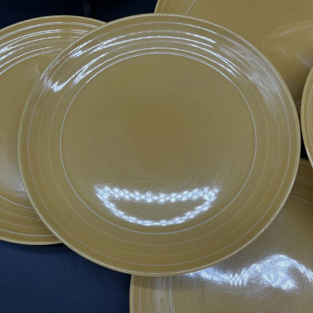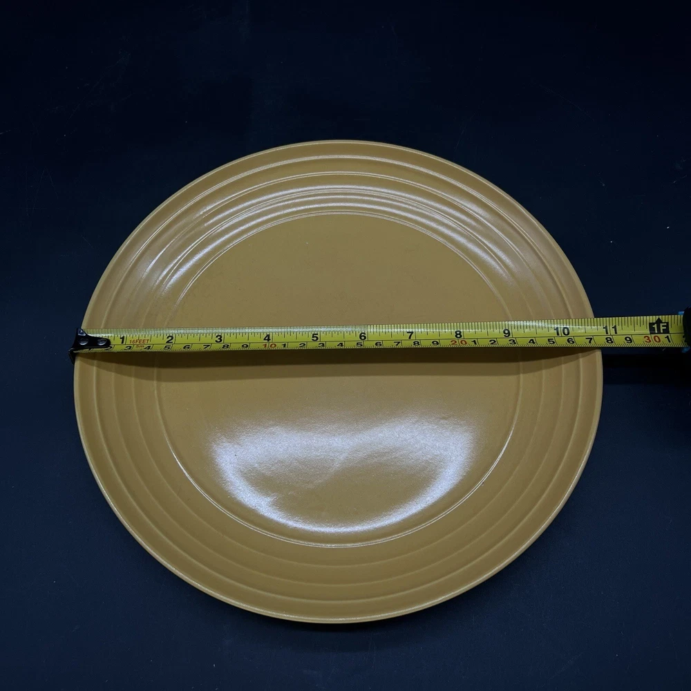 This set of 9 dinner plates from Pier 1 is perfect for all occasions. The plates are round with an 11" width and are made of stoneware in a beautiful yellow color. Each plate is hand-painted with an essential colors pattern, making them unique and eye-catching. These plates are not only beautiful but also practical, as they are microwave and dishwasher safe. They were manufactured in 2008 and are an original production style in earthenware. The plates were made in China using the pottery production technique and have a printed backstamp. These plates are perfect for anyone who loves handmade, high-quality dinnerware. See photos for size and condition.