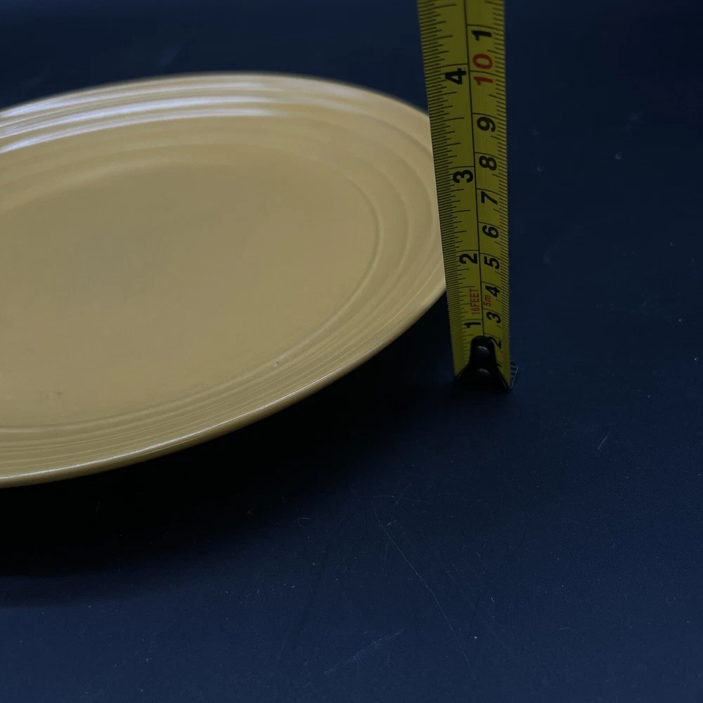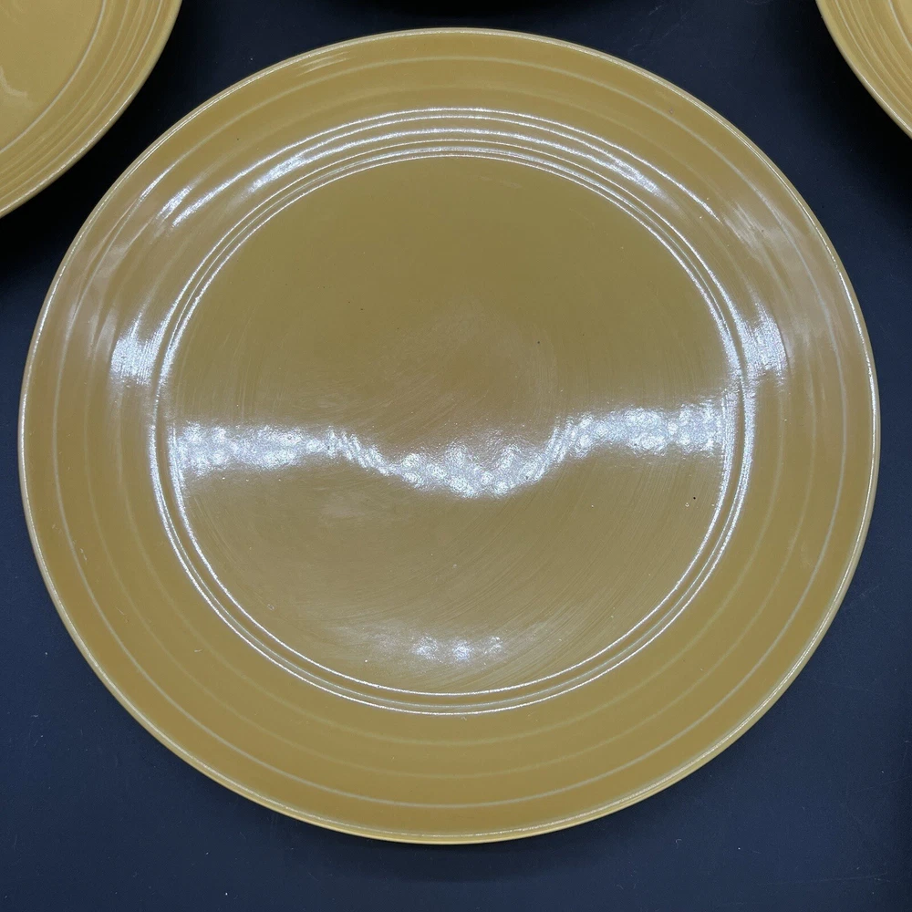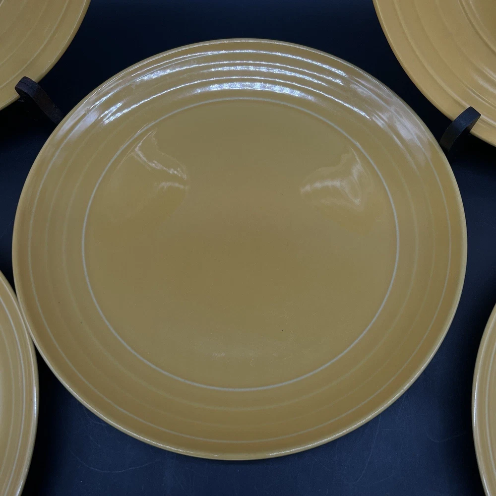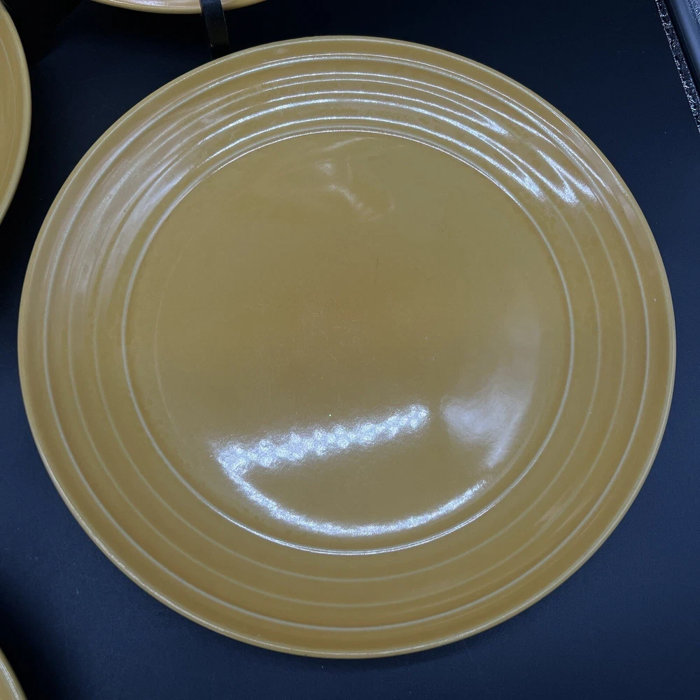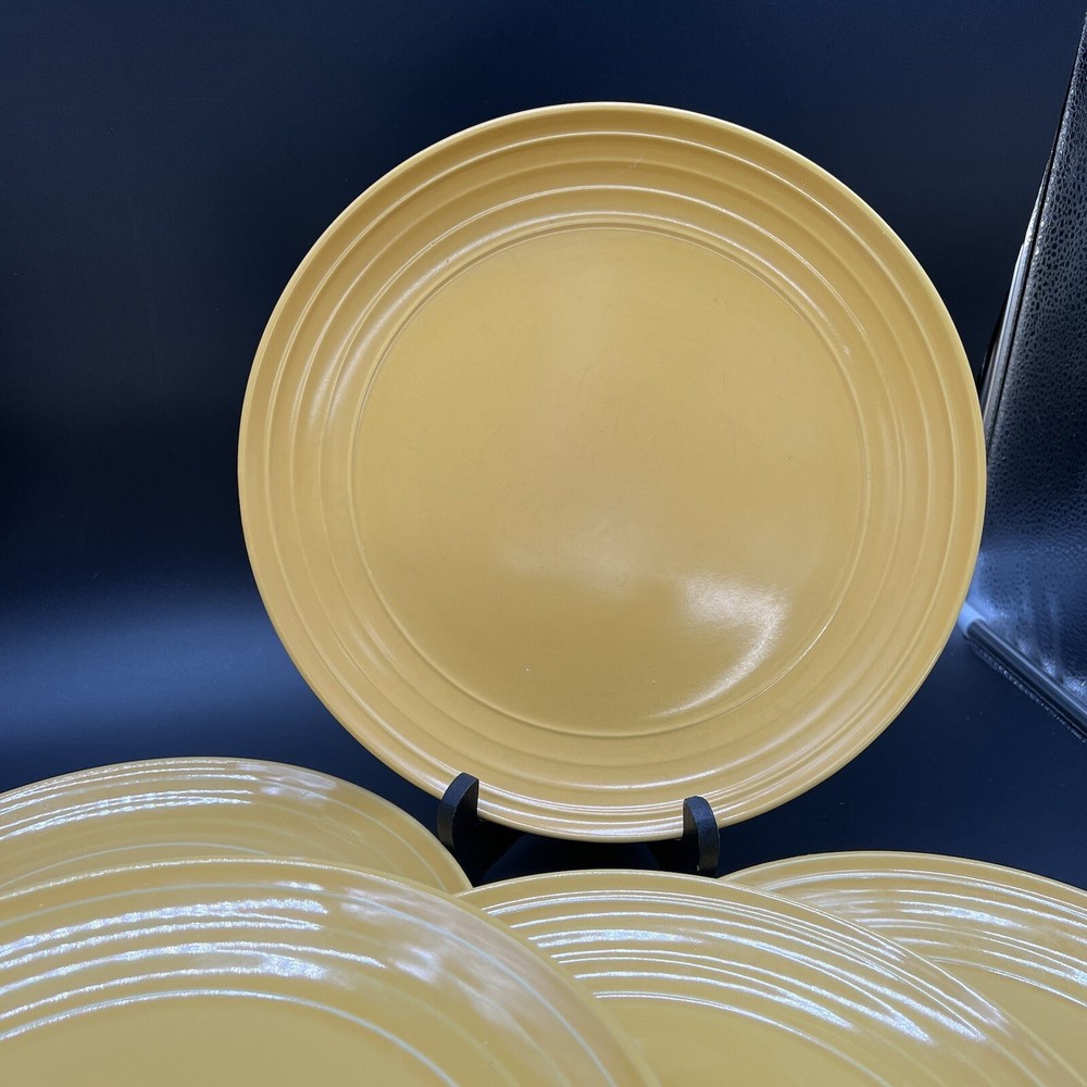 This set of 9 dinner plates from Pier 1 is perfect for all occasions. The plates are round with an 11" width and are made of stoneware in a beautiful yellow color. Each plate is hand-painted with an essential colors pattern, making them unique and eye-catching. These plates are not only beautiful but also practical, as they are microwave and dishwasher safe. They were manufactured in 2008 and are an original production style in earthenware. The plates were made in China using the pottery production technique and have a printed backstamp. These plates are perfect for anyone who loves handmade, high-quality dinnerware. See photos for size and condition.
