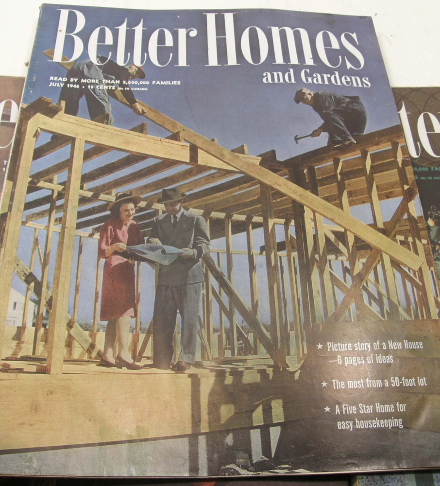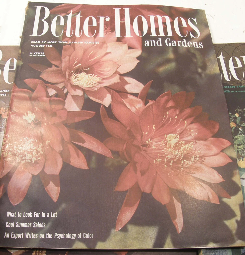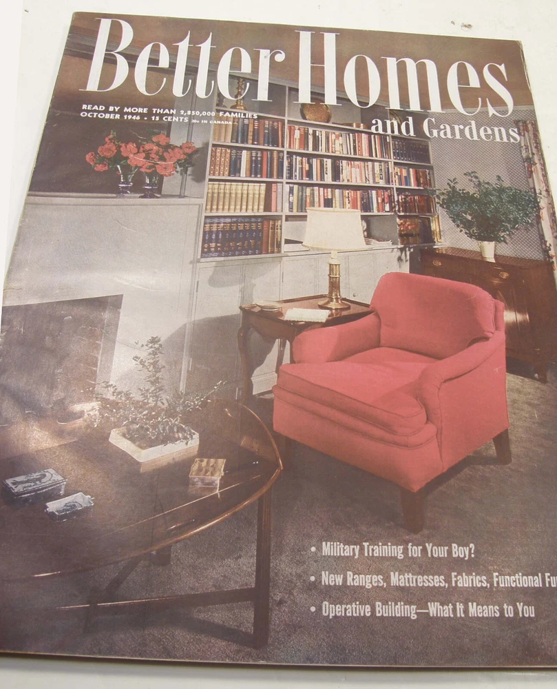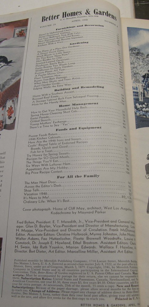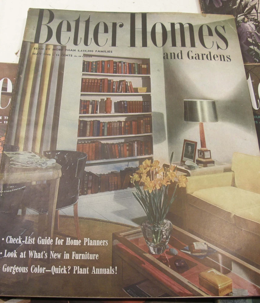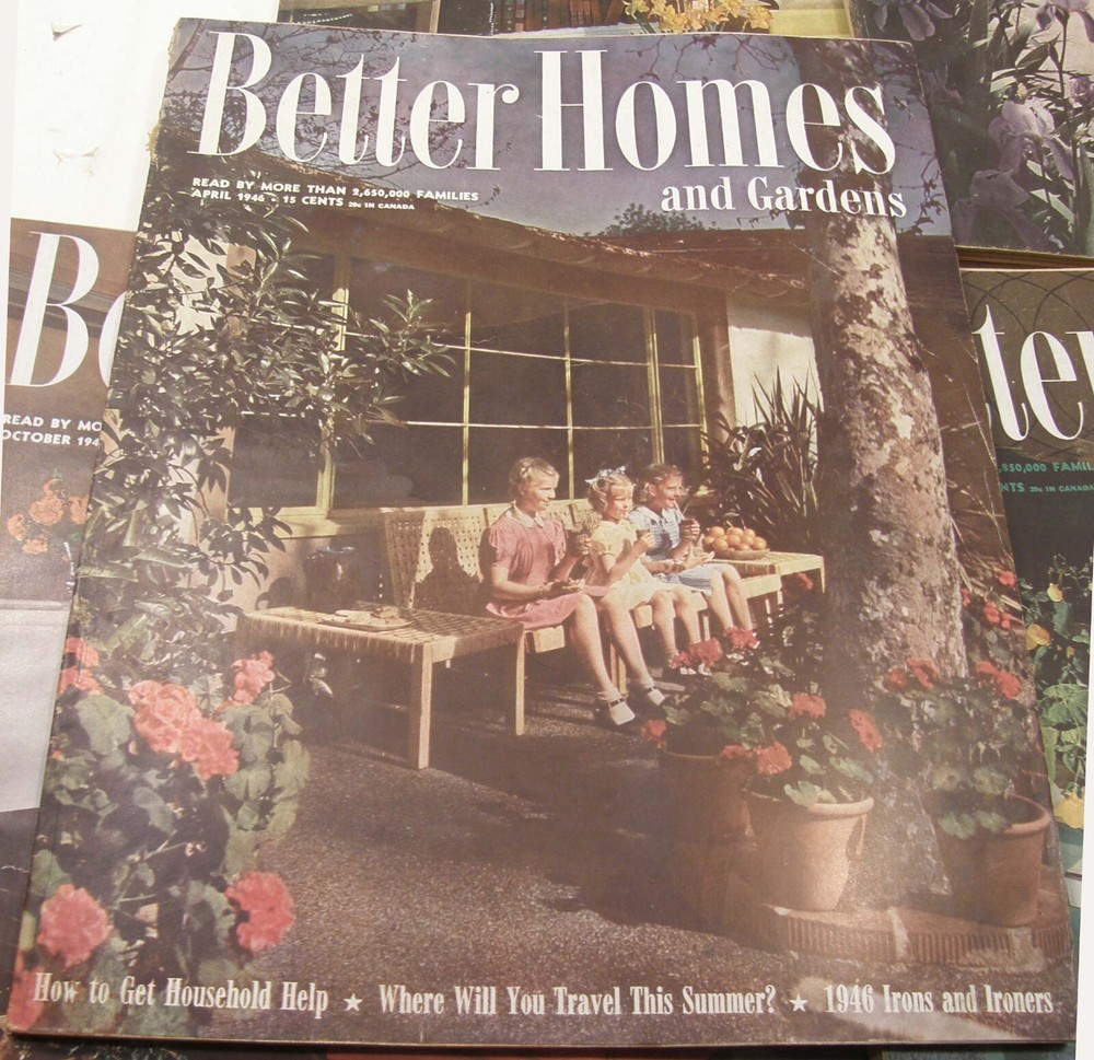 Please email with any questions. Group of nine 1946 issues of Better Homes & Gardens magazine. Each issue has over 100 pages of architecture, decorating, recipes, do-it-yourself improvement ideas, gardening, the latest in appliances and other mod cons that American homeowners wanted in their optimistic post-war lives. Great ads- many for products you've never heard of. Each issue has a section of mail order items that are so much fun. Retro recipes. December issue full of Christmas gift ideas, decorations to make. These magazines have text intact and clean, some wear and tear to the covers and spine.