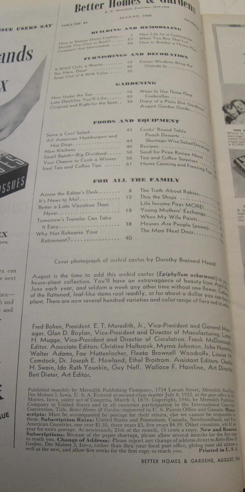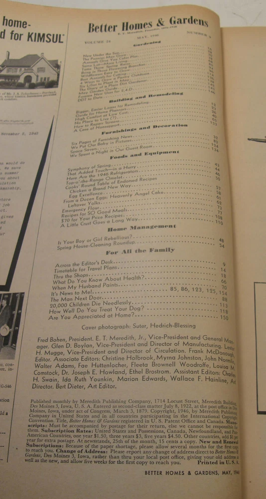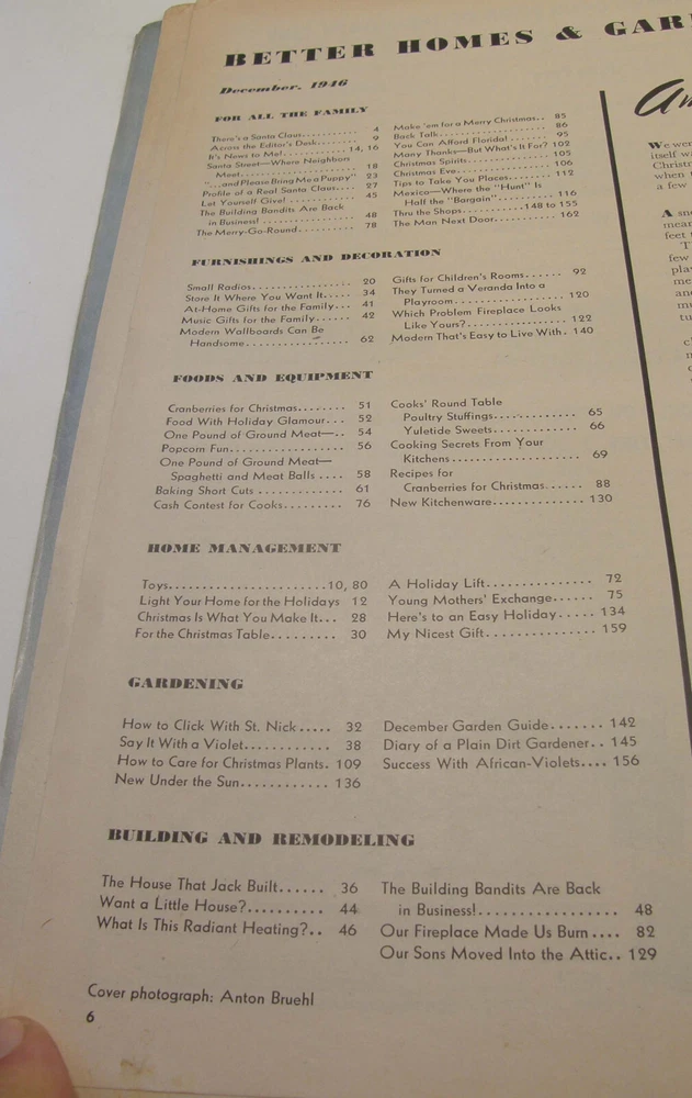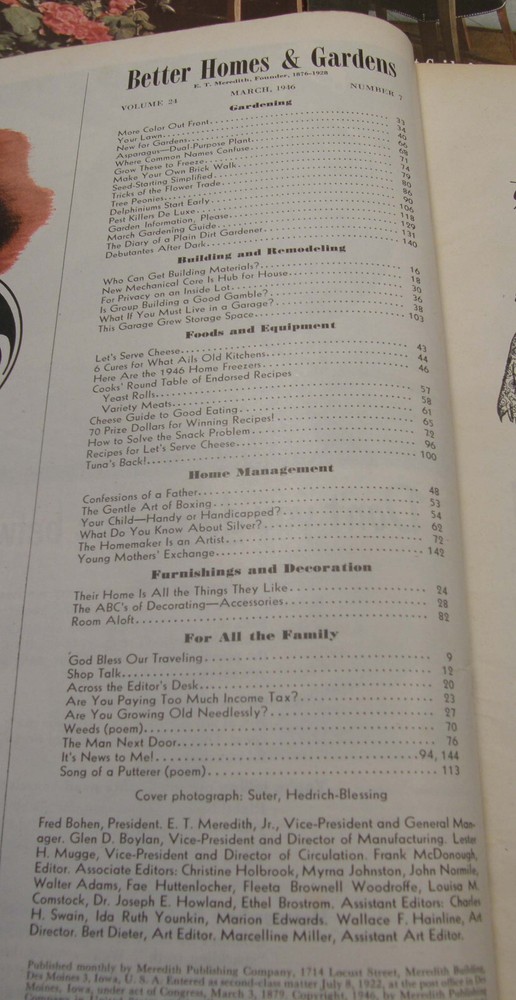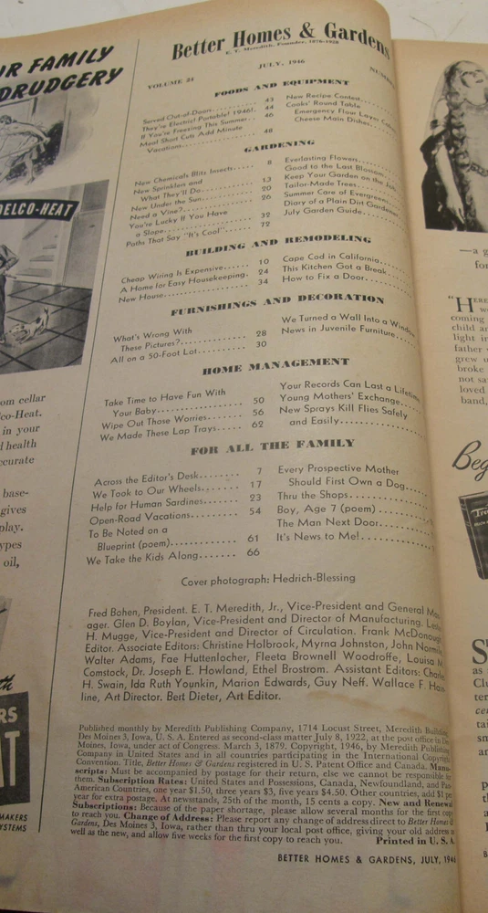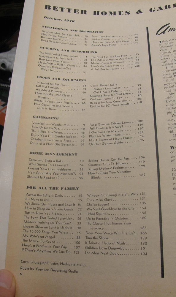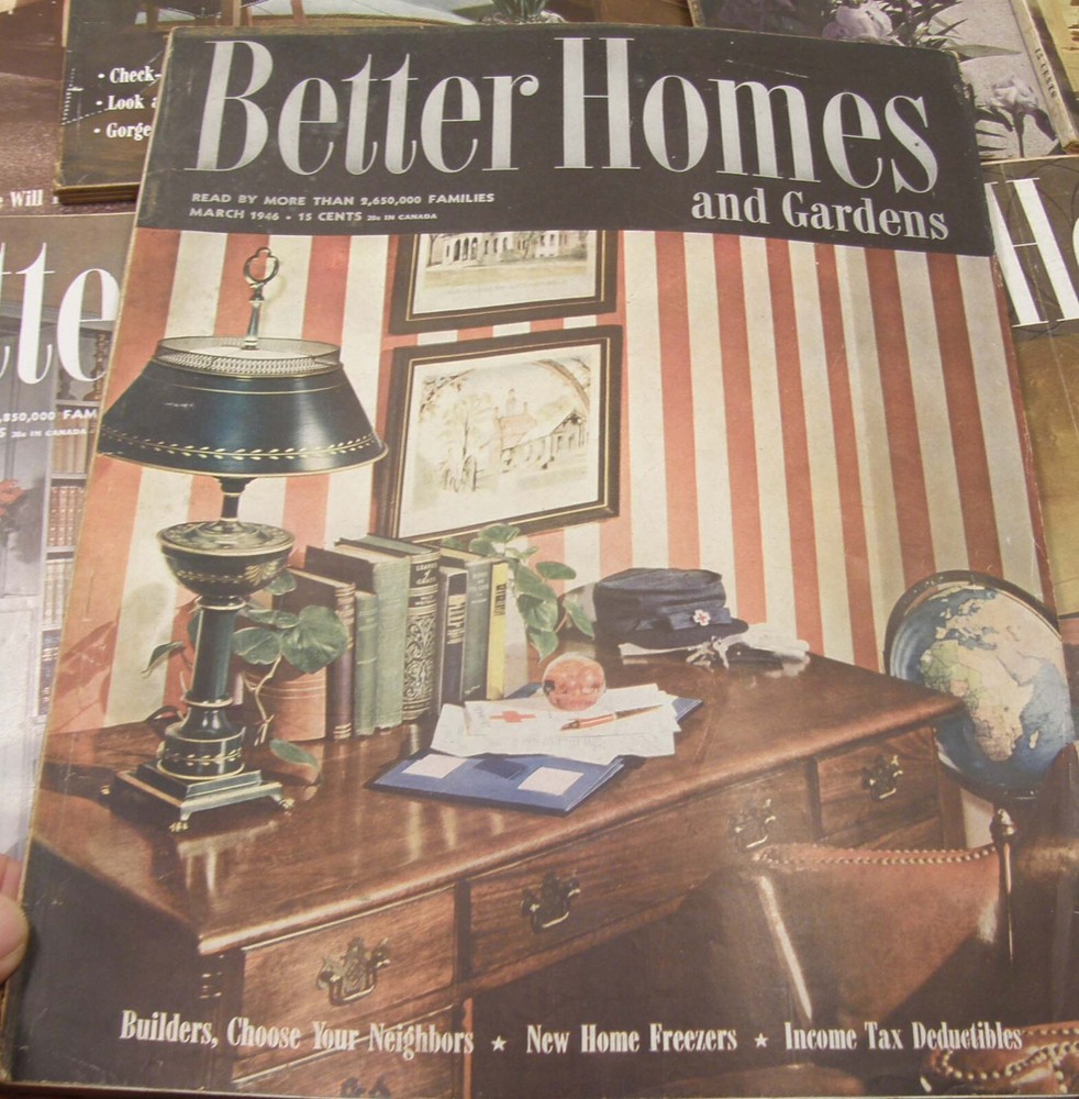 Please email with any questions. Group of nine 1946 issues of Better Homes & Gardens magazine. Each issue has over 100 pages of architecture, decorating, recipes, do-it-yourself improvement ideas, gardening, the latest in appliances and other mod cons that American homeowners wanted in their optimistic post-war lives. Great ads- many for products you've never heard of. Each issue has a section of mail order items that are so much fun. Retro recipes. December issue full of Christmas gift ideas, decorations to make. These magazines have text intact and clean, some wear and tear to the covers and spine.