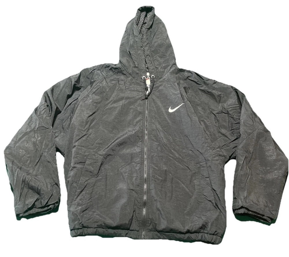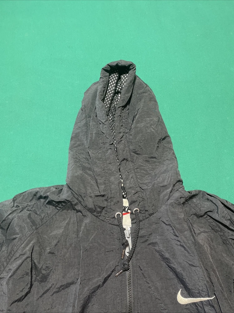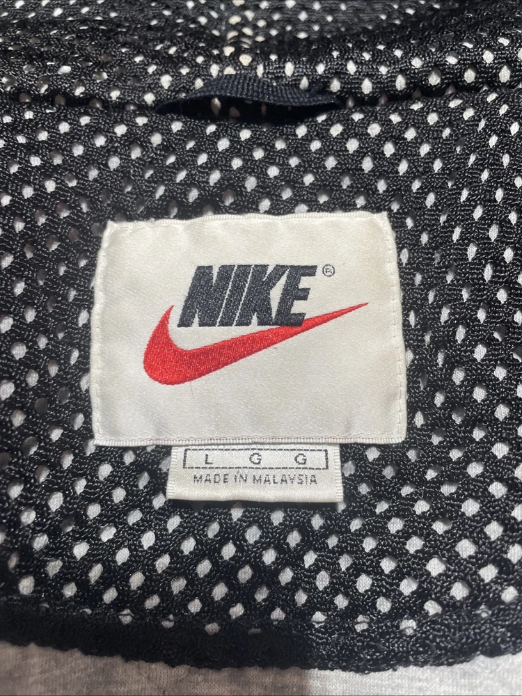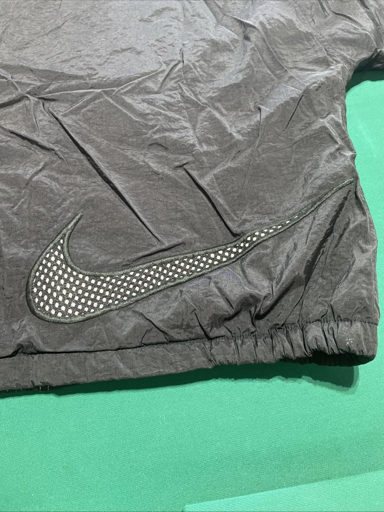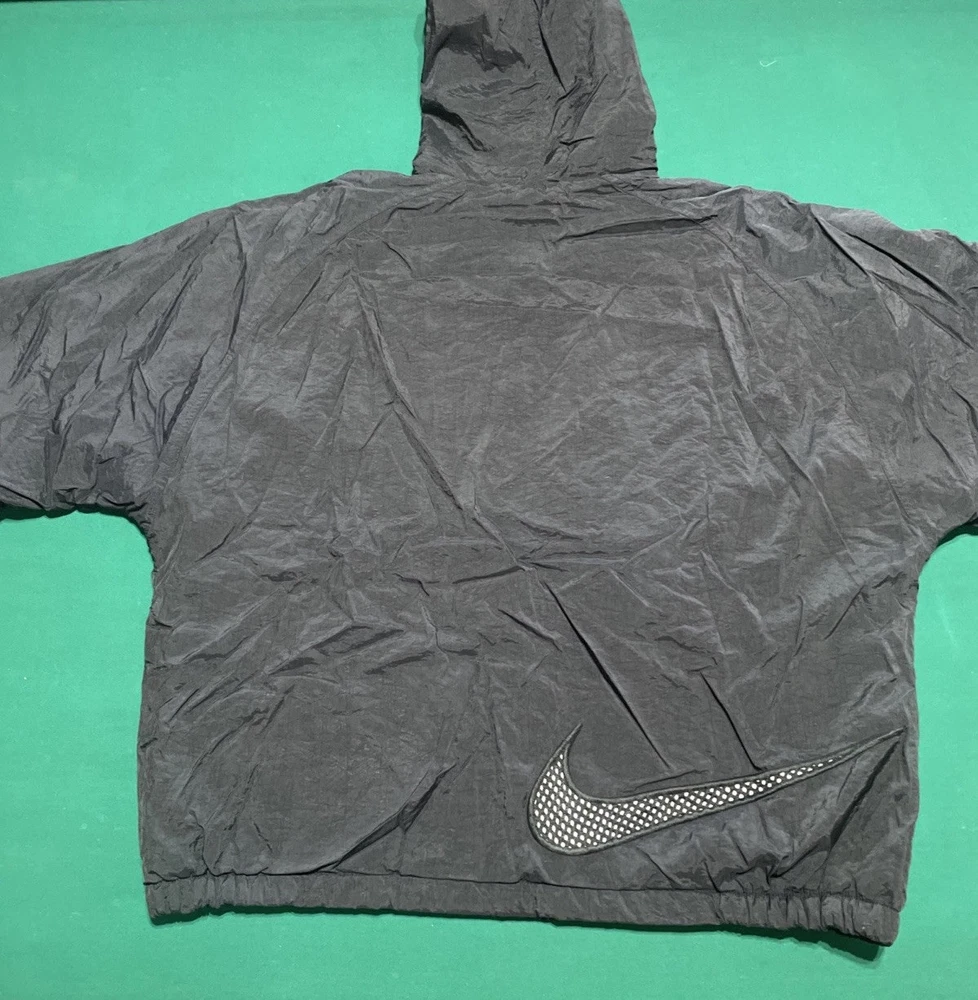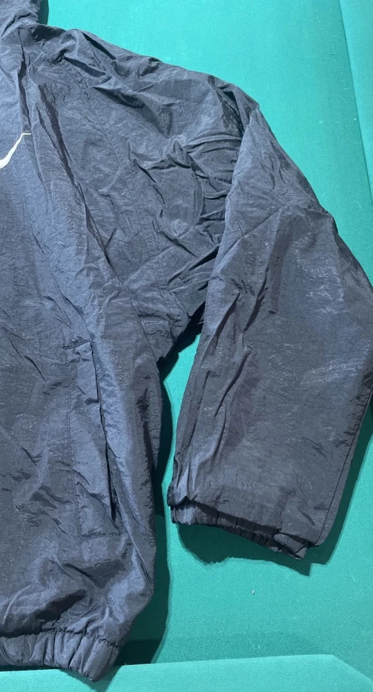 This Nike windbreaker track jacket is a vintage 90s piece with a black nylon outer shell and a polyester lining. Men’s size Large. It features a full zip closure, reflective accents, and a hood. The jacket is lightweight, wind-resistant, and suitable for all seasons. It has pockets and a Nike logo accent. Large Nike swoosh on the back waist area. Pilling occurring on the inside on areas, grungy/dirty on one side and a cigarette burn on the inside. Yellowing on the inside . Pics are included of imperfections, look closely before purchasing Chest Width: 27.25 in. Shoulder Width: 25.0 in. Body Length: 26.25 in. Sleeve Length: 28.0 in. Bottom Hem Width: 23.0 in. Sleeve Opening Width: 2.25 in. Sized by Smartsizer