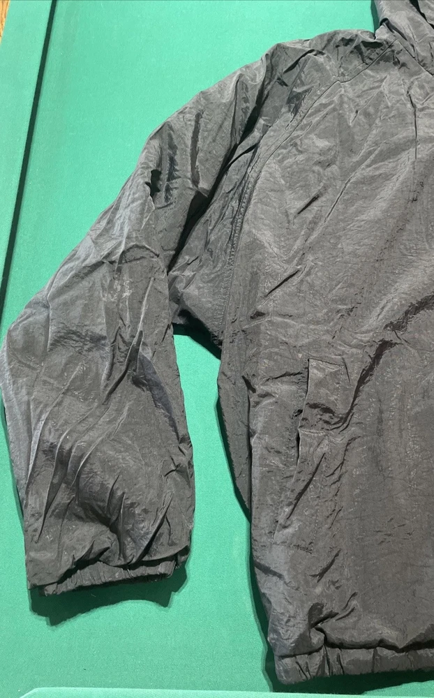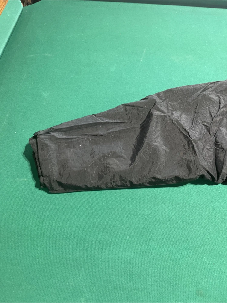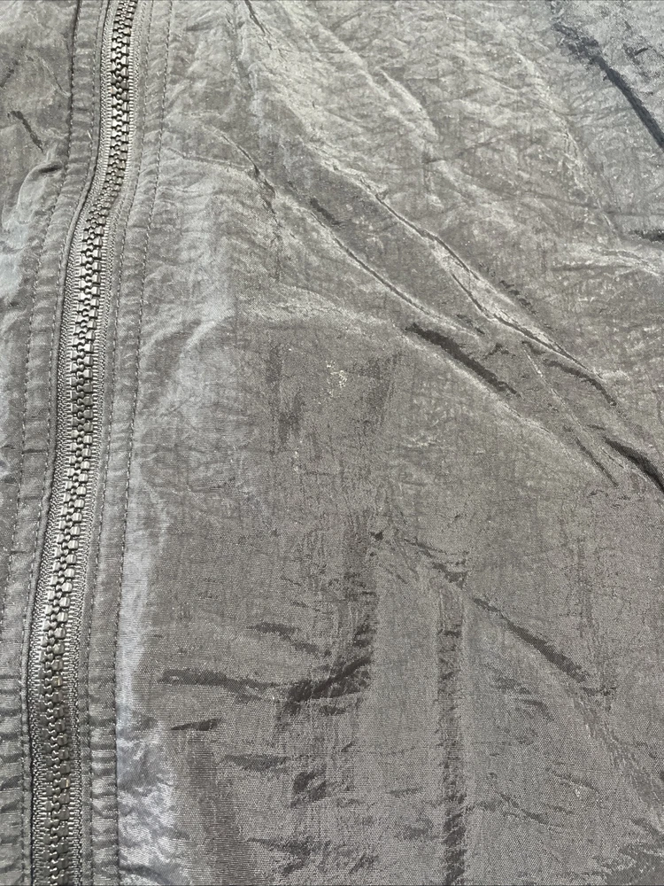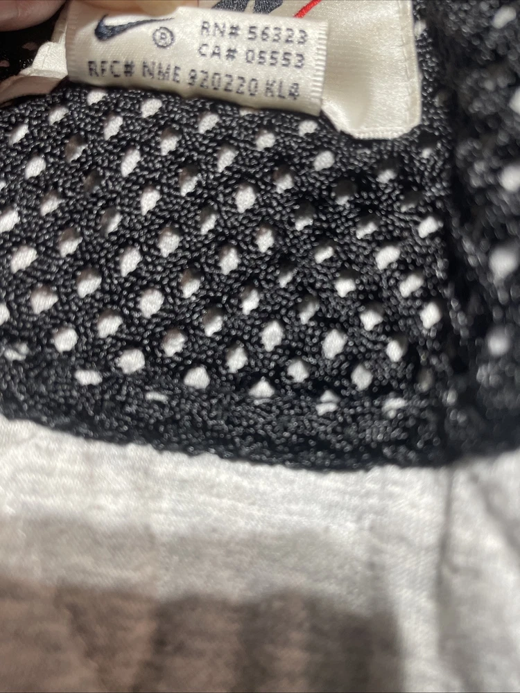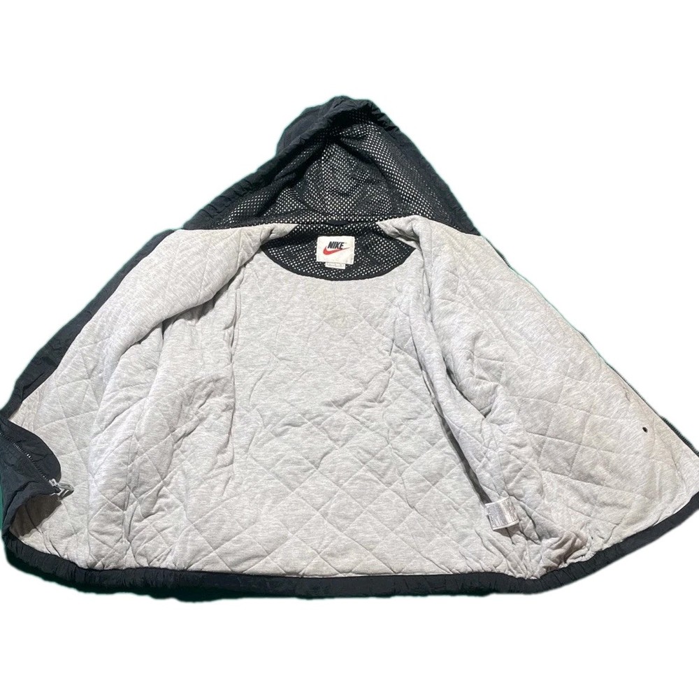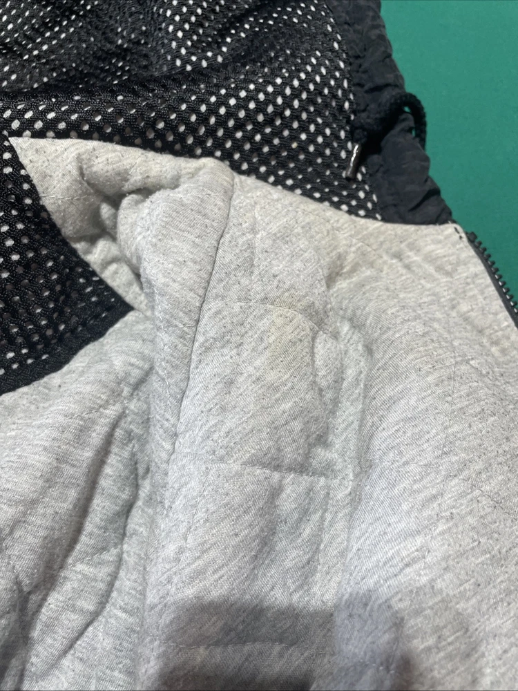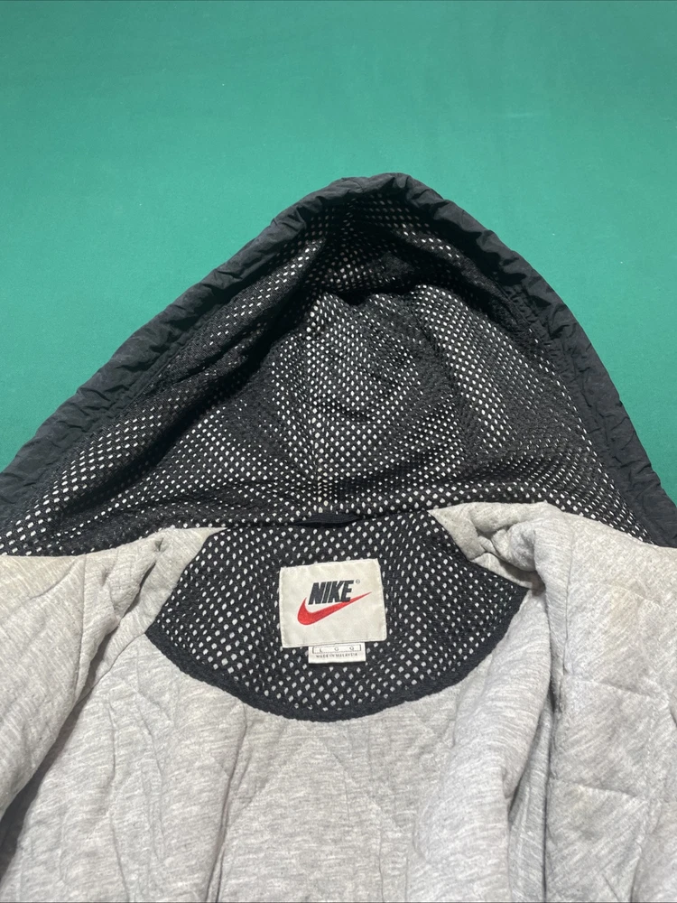 This Nike windbreaker track jacket is a vintage 90s piece with a black nylon outer shell and a polyester lining. Men’s size Large. It features a full zip closure, reflective accents, and a hood. The jacket is lightweight, wind-resistant, and suitable for all seasons. It has pockets and a Nike logo accent. Large Nike swoosh on the back waist area. Pilling occurring on the inside on areas, grungy/dirty on one side and a cigarette burn on the inside. Yellowing on the inside . Pics are included of imperfections, look closely before purchasing Chest Width: 27.25 in. Shoulder Width: 25.0 in. Body Length: 26.25 in. Sleeve Length: 28.0 in. Bottom Hem Width: 23.0 in. Sleeve Opening Width: 2.25 in. Sized by Smartsizer