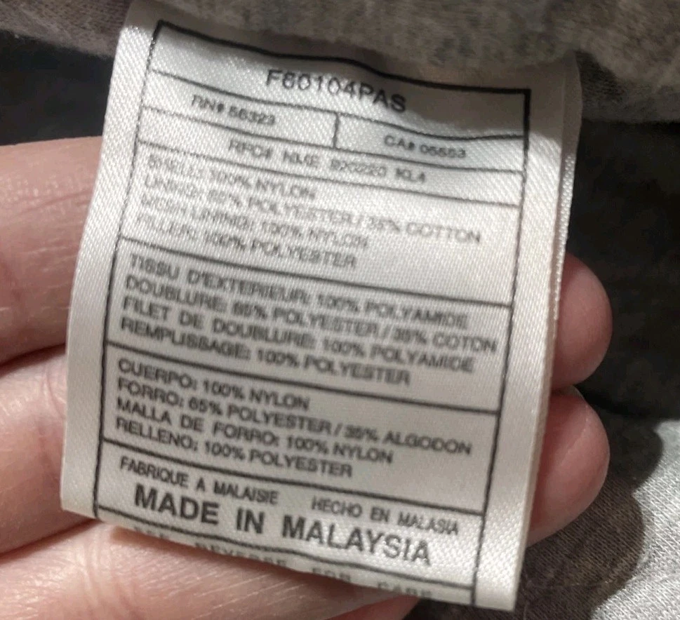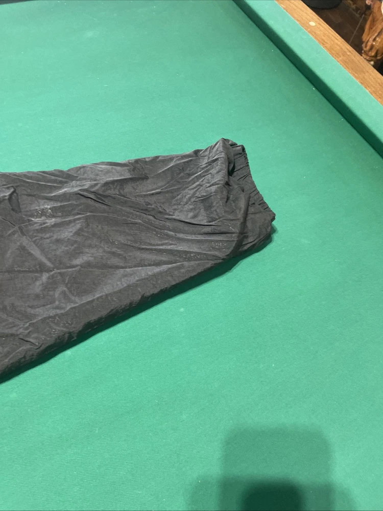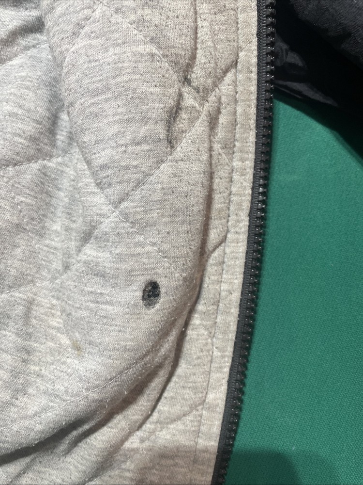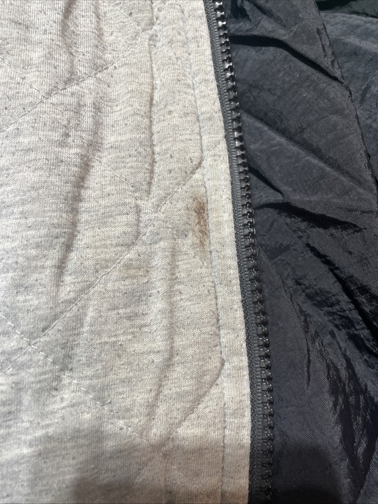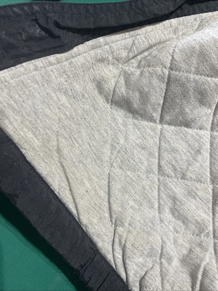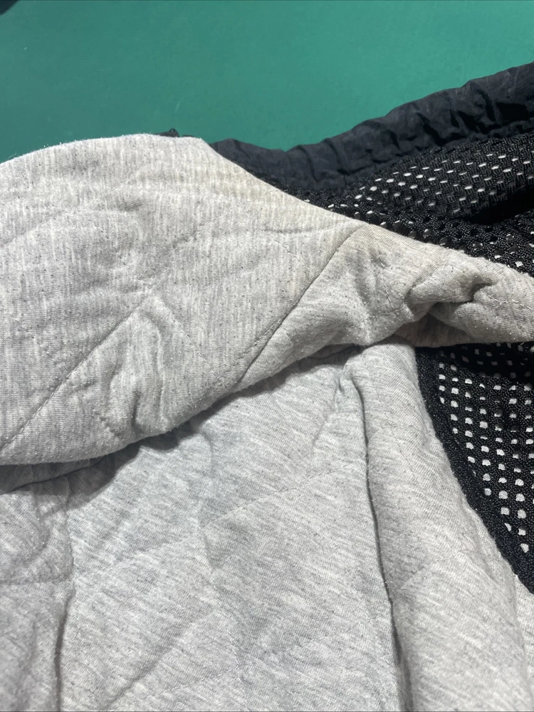 This Nike windbreaker track jacket is a vintage 90s piece with a black nylon outer shell and a polyester lining. Men’s size Large. It features a full zip closure, reflective accents, and a hood. The jacket is lightweight, wind-resistant, and suitable for all seasons. It has pockets and a Nike logo accent. Large Nike swoosh on the back waist area. Pilling occurring on the inside on areas, grungy/dirty on one side and a cigarette burn on the inside. Yellowing on the inside . Pics are included of imperfections, look closely before purchasing Chest Width: 27.25 in. Shoulder Width: 25.0 in. Body Length: 26.25 in. Sleeve Length: 28.0 in. Bottom Hem Width: 23.0 in. Sleeve Opening Width: 2.25 in. Sized by Smartsizer
