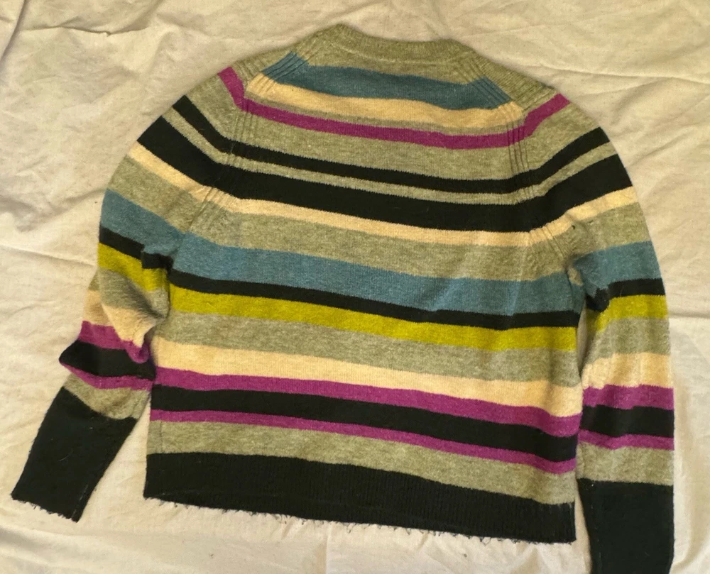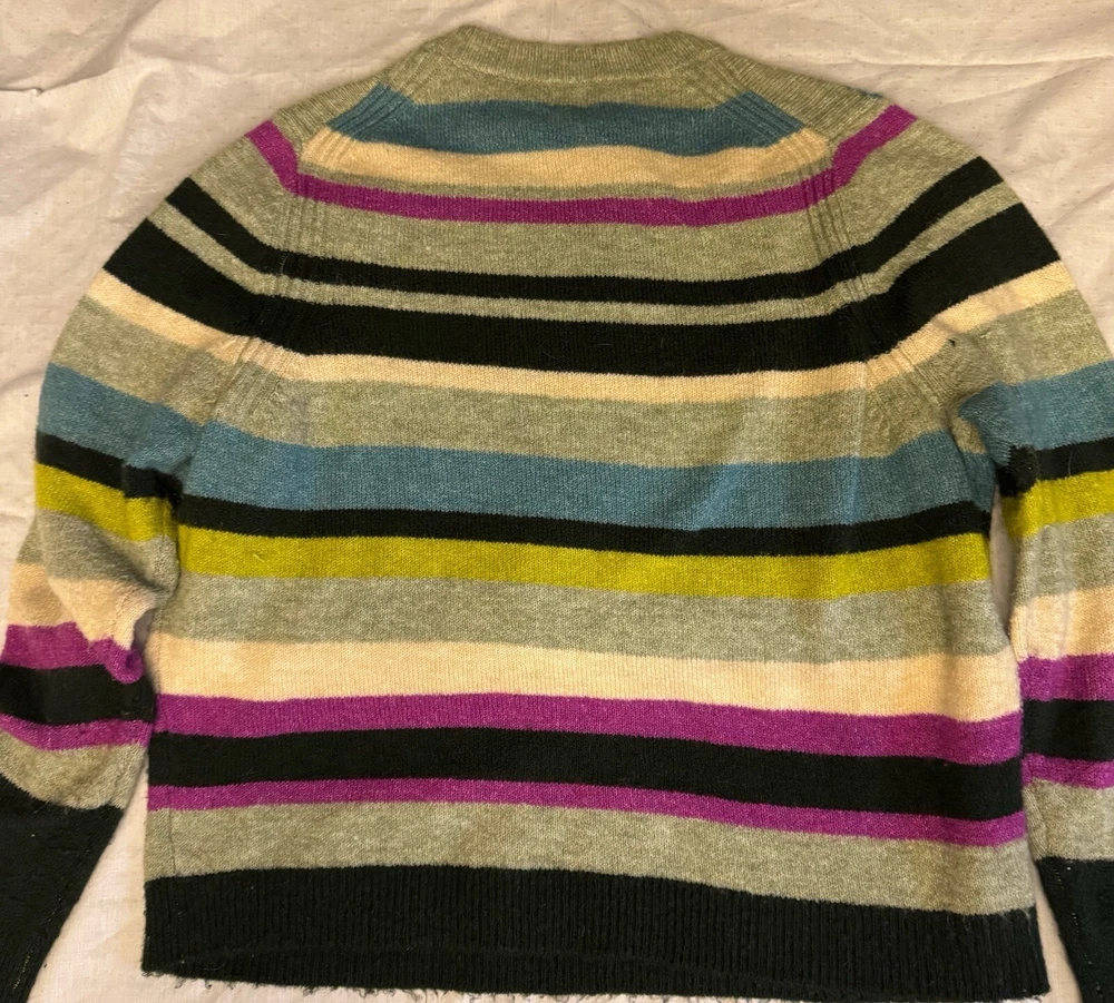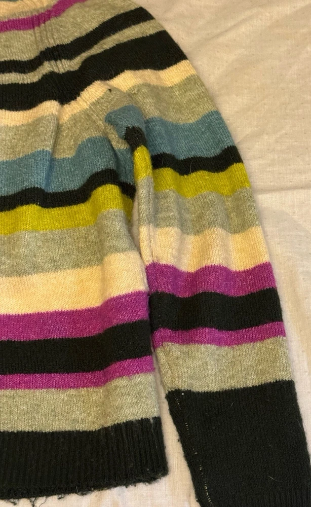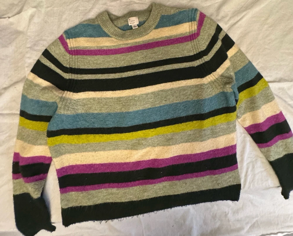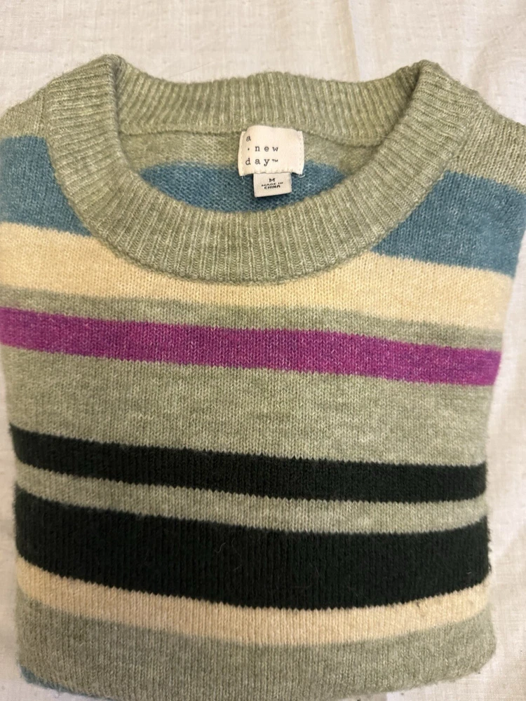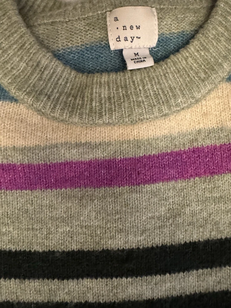 This A New Day sweater is the perfect addition to your wardrobe. It features a crew neckline and pullover style, with a comfortable and cozy fabric type made of polyester knit. The multicolor stripes add a touch of playfulness to the sweater, making it perfect for any casual occasion. The sweater is available in size medium, and is made for women of all ages. The vintage-inspired design adds a touch of nostalgia to your outfit. Don't miss out on this soft and comfortable sweater that will keep you cozy all day long.