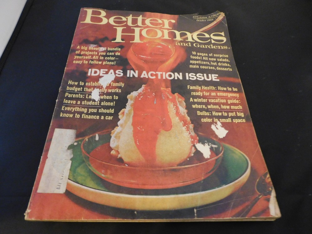 Vintage "Better Homes and Gardens" October 1966. Very fun to read stories and ads! This magazine is not graded and has damage including broken binding, rips, rub marks, creases , water stains and written names - this magazine is simply for a good read and is not of collector quality. Sold as is. Inventory I