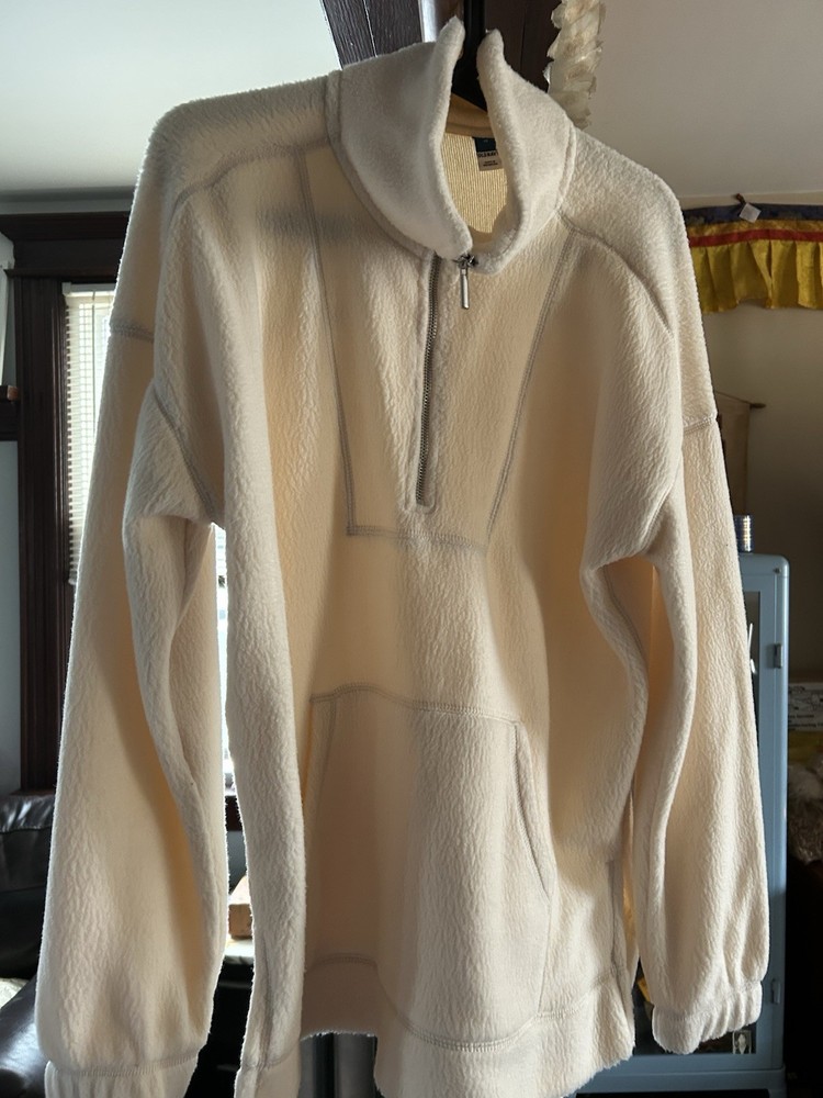 The product is a cozy white sweater designed for women, specifically in size small. It features a pullover style, making it easy to put on and take off. This sweater would be a comfortable and stylish addition to any woman's wardrobe, perfect for cooler days or for layering in the colder months.