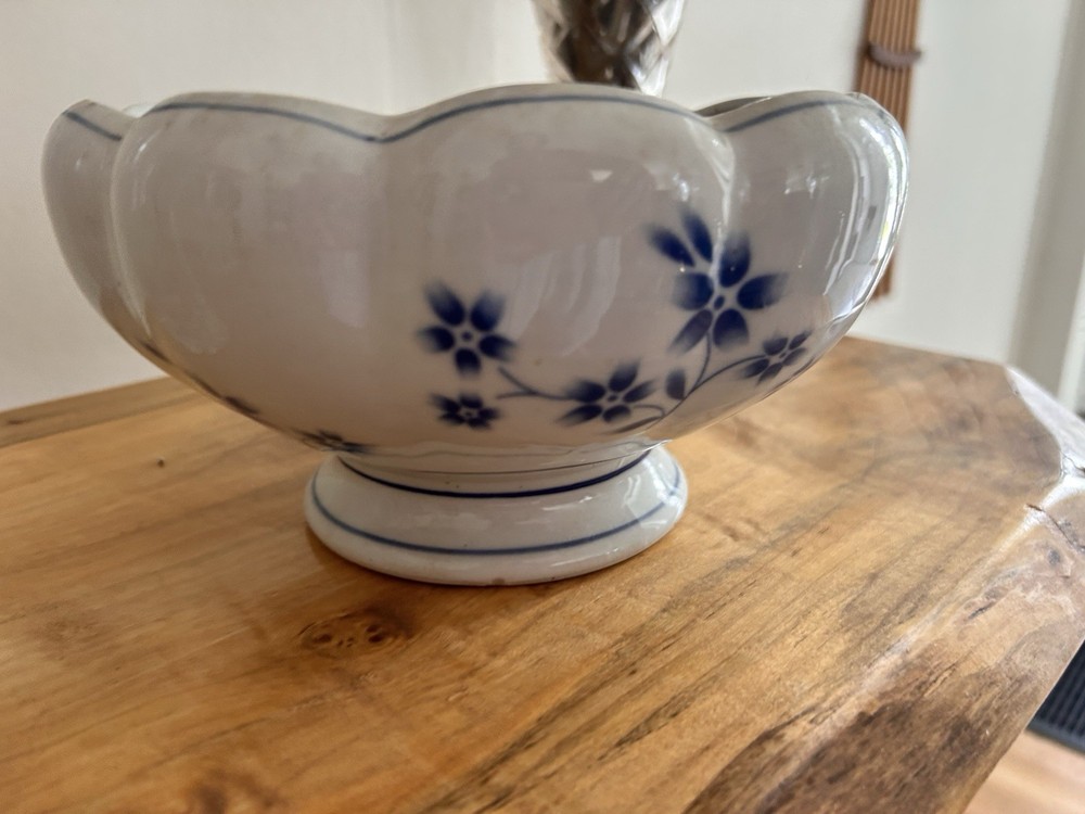 The AAA Imports Decoware Fine Pottery Pedestal Planter is a beautiful decorative collectible featuring a blue floral design. Made in China, this round-shaped planter stands at 4.5" tall and 8" wide, weighing 1 lb 14 oz. The intricate design and quality craftsmanship make it a perfect piece for displaying flowers or as a stylish centerpiece in any room of the house.