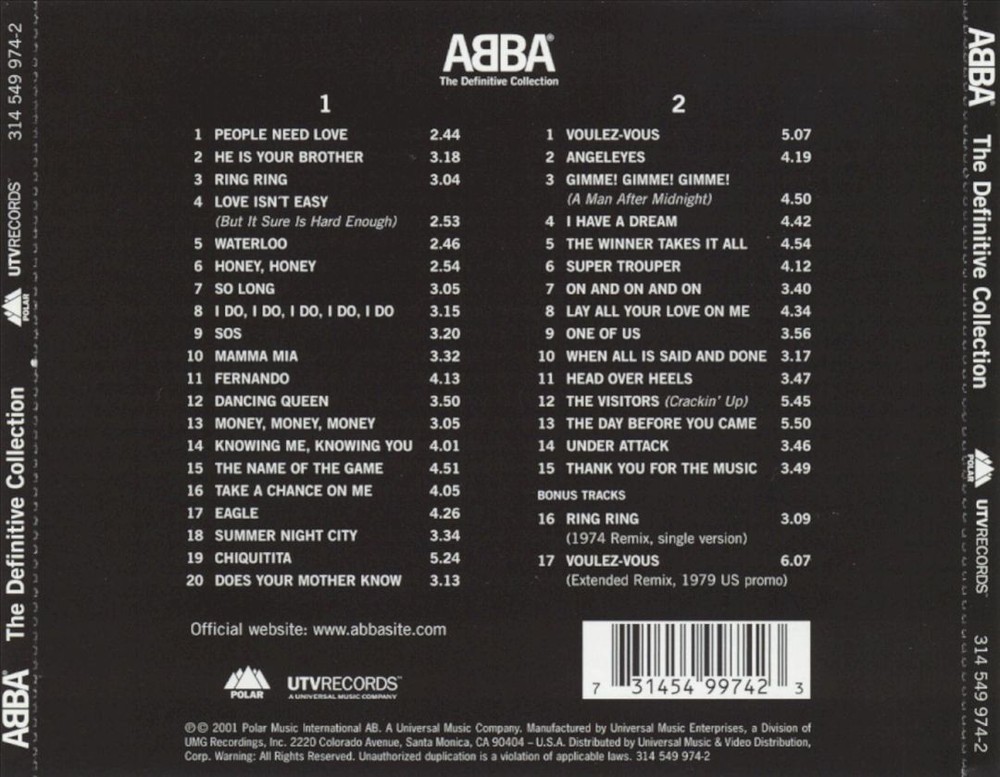 Additional Information from Movie Mars Product Description 0. DISC 1: 1. People Need Love 2. He Is Your Brother 3. Ring Ring 4. Love Isn't Easy (But It Sure Is Hard Enough) 5. Waterloo 6. Honey, Honey 7. So Long 8. I Do, I Do, I Do, I Do, I Do 9. S.O.S. 10. Mamma Mia 11. Fernando 12. Dancing Queen 13. Money, Money, Money 14. Knowing Me, Knowing You 15. Name of the Game, The 16. Take a Chance on Me 17. Eagle 18. Summer Night City 19. Chiquitita 20. Does Your Mother Know 0. DISC 2: 1. Voulez-Vous 2. Angeleyes 3. Gimme! Gimme! Gimme! (A Man After Midnight) 4. I Have a Dream 5. Winner Takes It All, The 6. Super Trouper 7. On and on and On 8. Lay All Your Love on Me 9. One of Us 10. When All Is Said and Done 11. Head Over Heels 12. Visitors, The (Crackin' Up) 13. Day Before You Came, The 14. Under Attack 15. Thank You for the Music 16. Ring Ring - (1974 Remix, Single Version mix, 1974 single remix) 17. Voulez-Vous - (Extended Remix, 1979 US Promo mix) About Movie Mars All items are Brand New. We offer unbeatable prices, quick shipping times and a wide selection second to none. Purchases come with a 30-day Satisfaction Guarantee (minus Shipping & Handling fees) on all unopened products. All items are from licensed Distributors. We do not deal with any Bootleg or Used items!