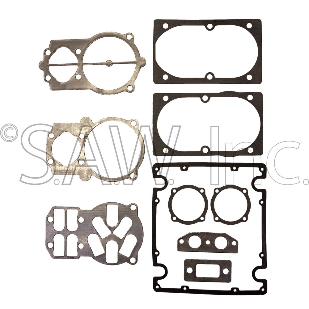 ABP-5950057 Gasket Kit is the complete gasket kit for the B5900 Series 2 Stage air compressor pumps used by DeVilbiss Air Power Company on many air compressors. Service Note: The B5900 Pump has only 10 Reed Valves on the valve plate and will require the ABP-5950057 Gasket Kit. The B4900 Pump has only 6 Reed Valves on the valve plate and will require the ABP-4950055 Gasket Kit. Please verify that the correct gasket kit is being ordered before placing your order. This ABP-5950057 Complete gasket kit contains all the gaskets needed to repair the air compressor pump during any tear-down and rebuild. These gaskets can only be purchased as part of the complete gasket kit. The ABP-5950057 Gasket Kit will fit the pumps used on several different models of air compressors, including the Z-ABP-459, ABP-459, D27044, Z-D27044, AP5900, and B5900 pumps. This series of 2 2-stage air Compressor pumps were used by Sears Craftsman, DeVilbiss, DeWalt, Porter Cable, Pentair, Ex-Cell, Air America, Sanborn, Coleman Powermate, and many other manufacturers. Warning: Never service an air compressor while the unit is still plugged into any power source or while the unit is still hot; severe burns, injury, or electrical shock can occur. For any additional information, please contact our office by email through our eBay store, and one of our customer service agents will respond to your question in a timely manner. Our customer service department can answer parts compatibility questions by email Monday through Friday from 10 am to 4 pm Central Standard Time or by text at 269**447**0412. We do not offer technical services for repairing equipment and have limited access to replacement parts at our eBay store. The most common replacement parts will be listed in our store, and if what you are looking for is not listed in our store, we will not be able to provide any additional non-listed parts.