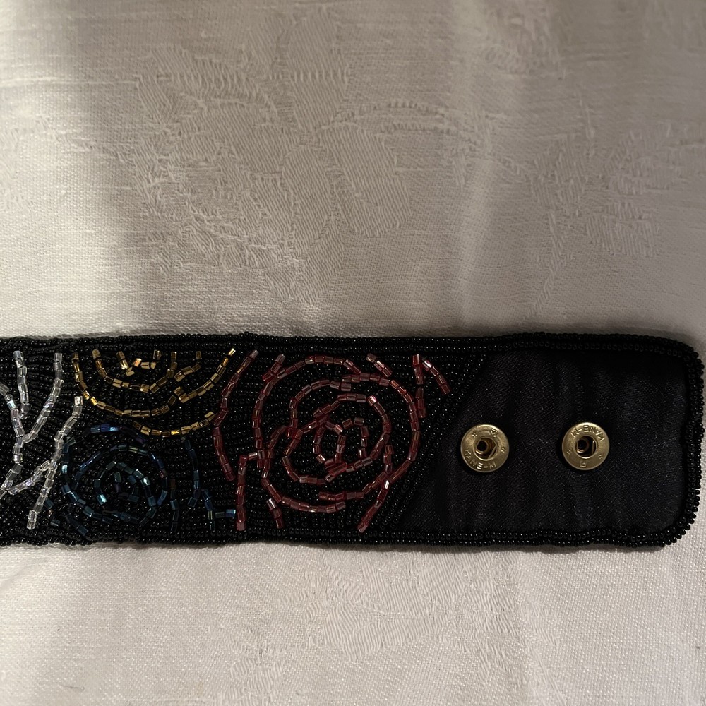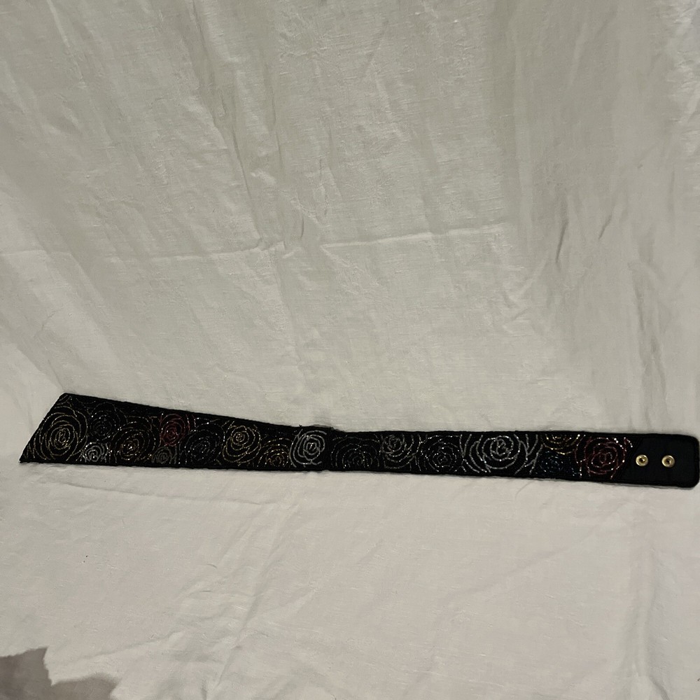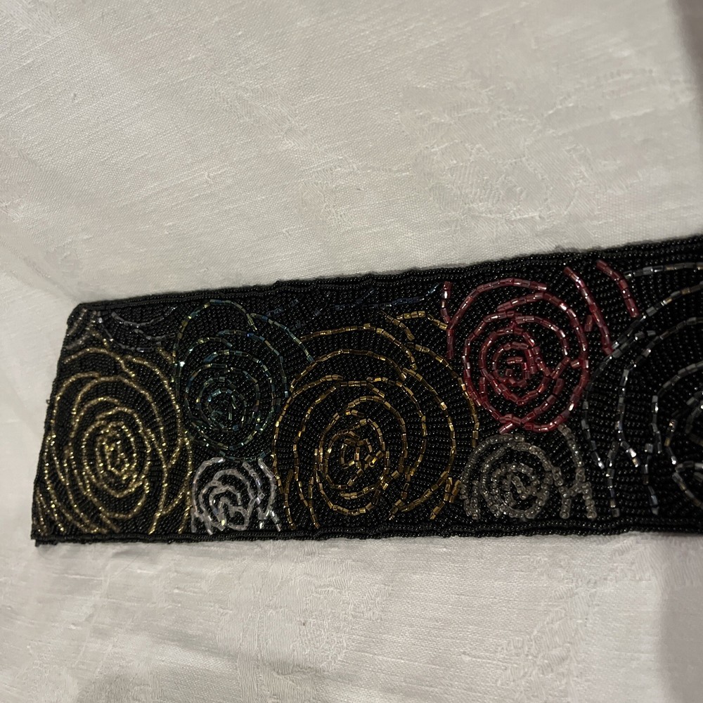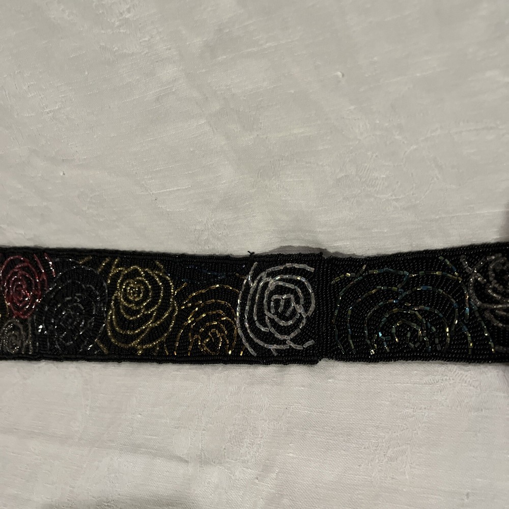ADG Fashion Imports Beaded Belt Rose Petal Design, Multi Color 33 Inches Long. 3 snap adjustments . Red, Gold, Silver, Green, Blue roses with black beaded background on black fabric. Like new