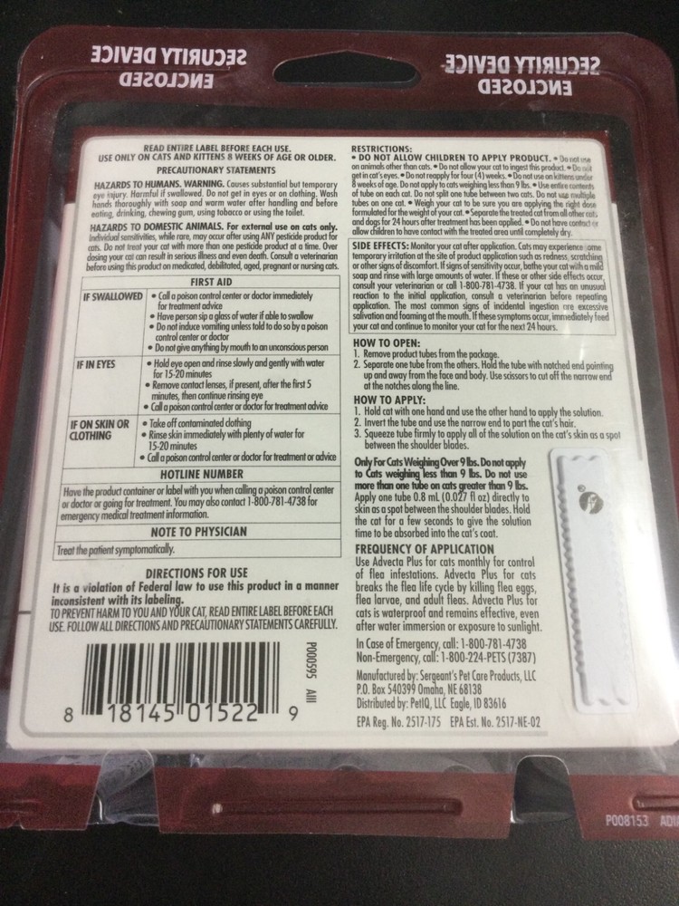 ADVECTA Plus for CATS Over 9 lbs - 4 Doses of Flea & Lice Treatment . Ships free....
