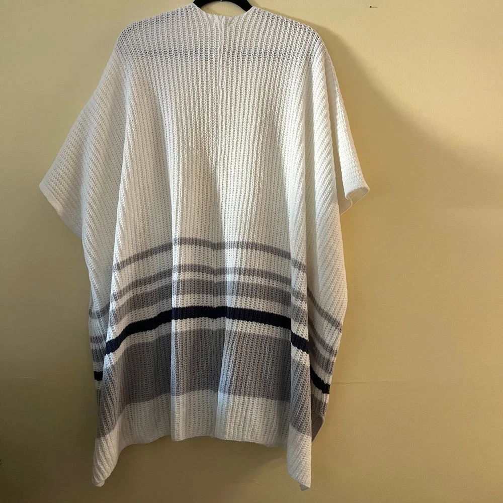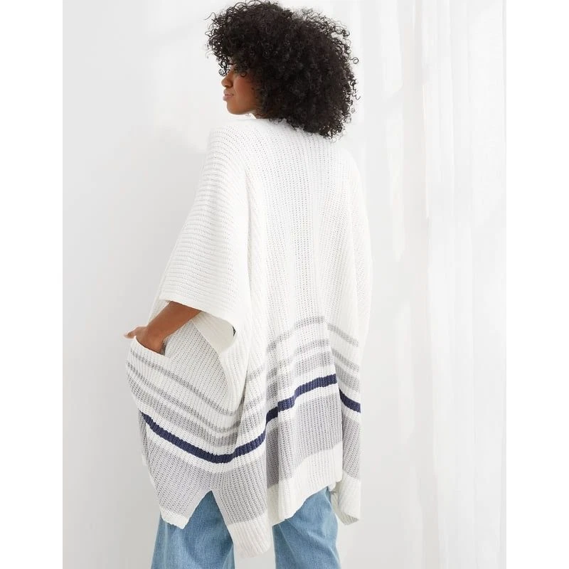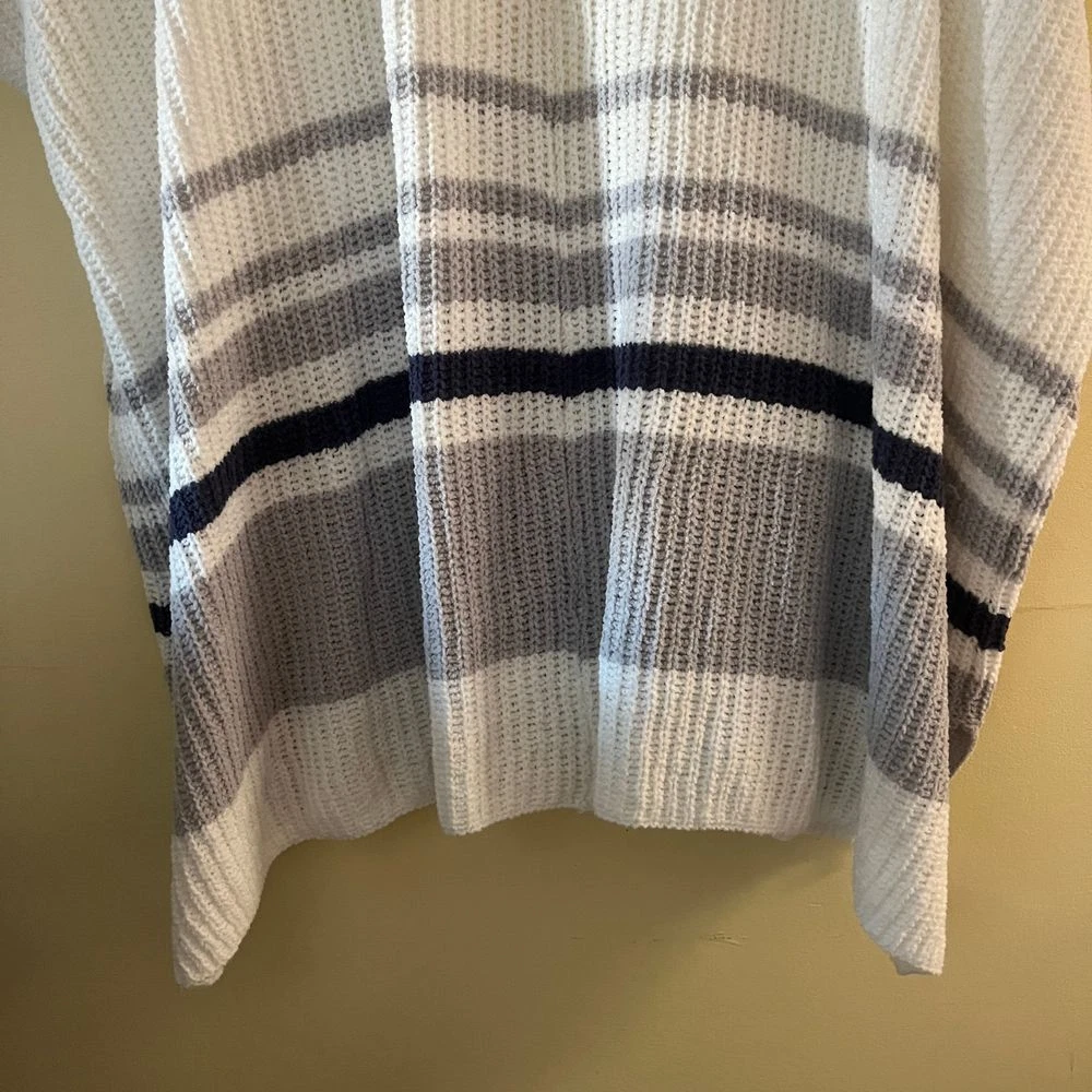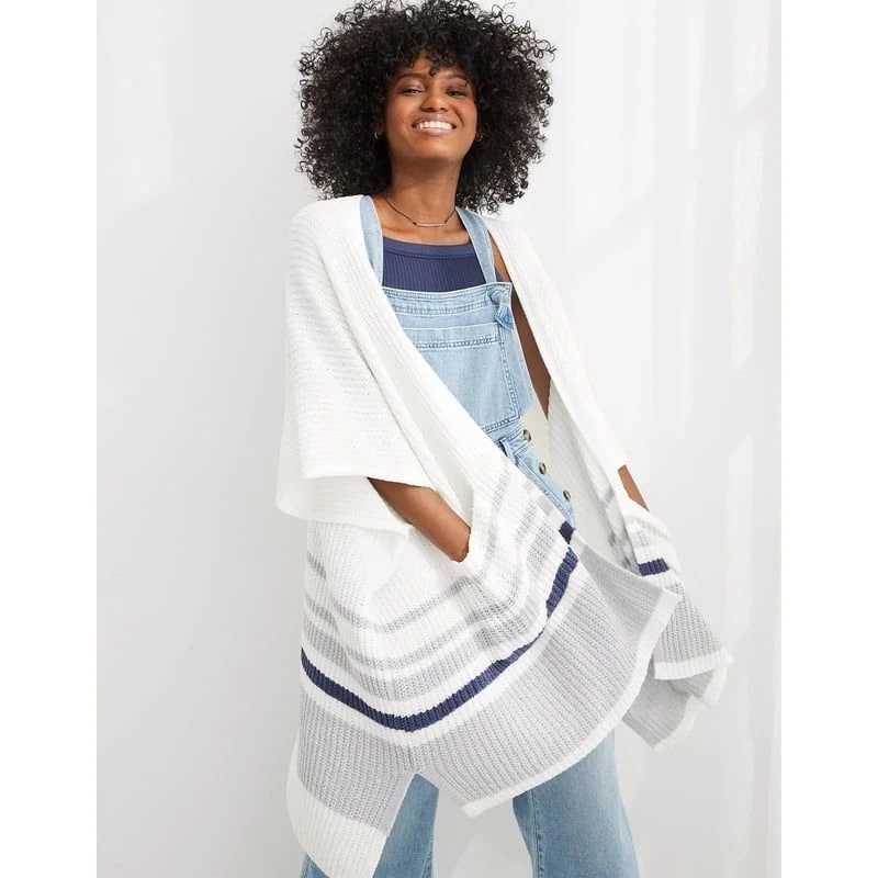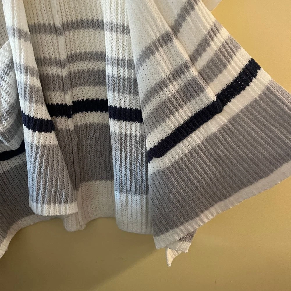 In excellent pre-owned condition! No flaws detected. Cute Cozy Cloud Cape striped open cardigan sweater by Aerie. White with gray and black stripes. Size X-Small/Small. Retail price $45. Soft knit. Open front. Short sleeve. 2 pockets in front. Machine washable. Please see size chart in photos for best fit. Stock photos to show fit β the stripes are gray/black, not blue. Love this item but not the price? Send me an offer! Questions? Leave a comment below! Tags: boho, bohemian, casual, comfy, cozy, fall, knit, lounge, loungewear, neutral, office, oversized, school, spring, winter