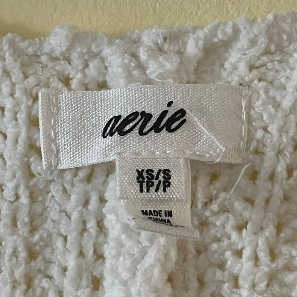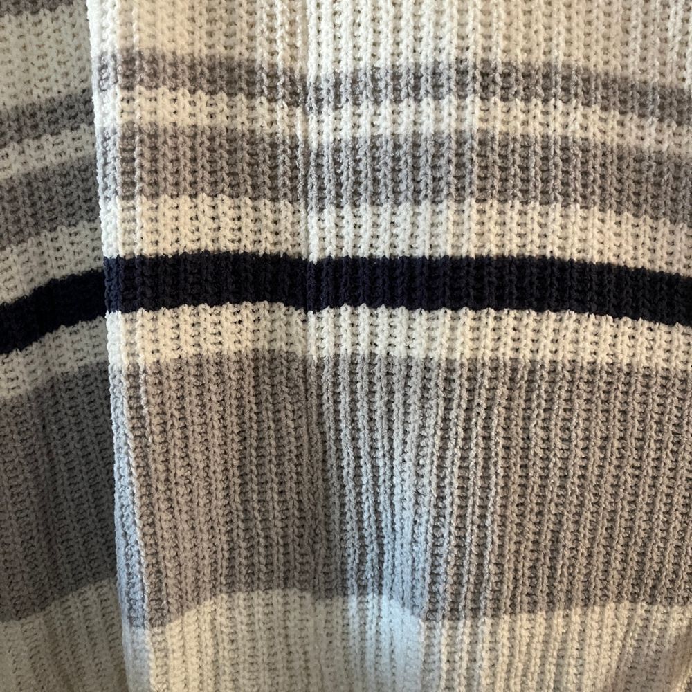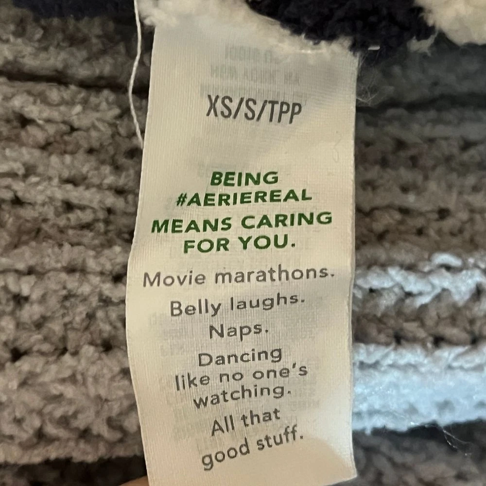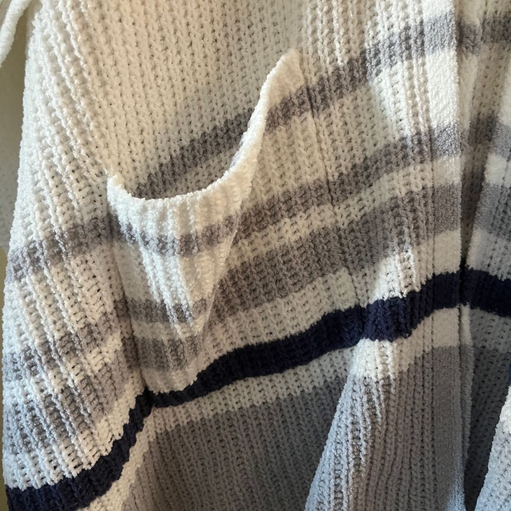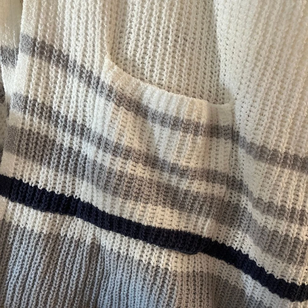 In excellent pre-owned condition! No flaws detected. Cute Cozy Cloud Cape striped open cardigan sweater by Aerie. White with gray and black stripes. Size X-Small/Small. Retail price $45. Soft knit. Open front. Short sleeve. 2 pockets in front. Machine washable. Please see size chart in photos for best fit. Stock photos to show fit β the stripes are gray/black, not blue. Love this item but not the price? Send me an offer! Questions? Leave a comment below! Tags: boho, bohemian, casual, comfy, cozy, fall, knit, lounge, loungewear, neutral, office, oversized, school, spring, winter