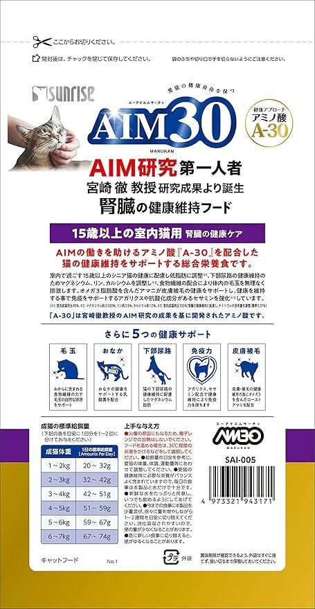 Item description This is Chicken Flavor!! AIM30 Kidney health care for over 15 years old indoor cats 600g Fish Flavor ↑This is fish flavor :) Here is the series of AIM30 and treats! (Plus AIM18 treats!) B uy 2 or 3 you will get some discount and for more than 2 bags of food, will ship with Expedited For Kitten AIM30 Healthy Urinary Tract Care for Kittens 600g Fish Flavor For Mature/Adult cats AIM30 Indoor Spaying/Neutering Mature Cat Health Urinary Tract and Hairball Care AIM30 Indoor Mature Cat Healthy Urinary Tract and Hairball Care Fish Flavor For Senior Cats : over 11 years AIM30 Kidney health care for indoor cats over 11 years old 600g Fish Flavor AIM30 Kidney health Care for Indoor Spayed/Neutered Cats over 11 Years 600g : over 15 years AIM30 Kidney health care for over 15 years old indoor cats 600g Fish Flavor : over 18 years (almost 20) AIM30 Kidney health care for indoor senior cats aged over 18 600g Fish Flavor Buy 8 different kinds of Treats! AIM30 Crunchy Treats (Fish, Chicken, Salmon, Seafood, Cheese, Mix, Beef, Tuna) Chicken Flavor series AIM30 Indoor Spaying/Neutering Mature Cat Health Urinary Tract Hairball Care AIM30 Indoor Mature Cat Healthy Urinary Tract and Hairball Care Chicken Flavor AIM30 Kidney health care for indoor cats over 15 years old 600g set of 3 Chicken AIM30 Kidney health care for indoor senior cats aged over 18 600g chicken Flavor Here is more AIM series from CHAO, get some different treats (semi-liquid, chewy type) this one features AIM18 for Cats kidney health CIAO for AIM Chewy Treat Variety pack 25 pieces Kidney Heath Churu semi- liquid This is a comprehensive nutritional food to support the health maintenance of senior cats aged 15 and above who spend their time indoors, formulated with amino acid "A-30". It is adjusted to be low in fat to consider the health of indoor senior cats. Magnesium, phosphorus, and calcium are adjusted for the maintenance of lower urinary tract health, and by incorporating dietary fiber, hairballs are excreted naturally. Roasted amani containing omega-3 fatty acids supports the health of skin and fur, and Agaricus and sesamin, which support immunity by maintaining health, are strengthened. (※1 Comparison for indoor cats: 95%, ※2 Magnesium approx. 0.085%, Phosphorus approx. 0.9%, Calcium approx. 1.0%, ※3 Comparison for indoor adult cats: 150%). It is adjusted to contain an appropriate amount of sodium (standard 0.37%) for the maintenance of kidney health. Standard retail price (tax included): Open Ingredients: Corn, gluten meal, chicken, beef, pork, animal fat, wheat flour, fish extract, roasted amani, dietary fiber, vegetable oil, yeast, chicken liver powder, okara powder, tuna/bonito shavings powder, lactic acid bacteria, agaricus, cranberry, sesamin, minerals (P, Na, Cl, Ca, K, Zn, Fe, Cu, Co, Mn, I), amino acids (cystine, methionine, taurine), vitamins (A, B1, B2, B6, B12, C, D3, E, K3, choline, niacin, pantothenic acid, biotin, folic acid), seasoning, antioxidant (mixed tocopherols, herb extract) Nutritional components: Protein: 28.5% or more, Fat: 10.0% or more, Crude fiber: 4.0% or less, Ash: 9.0% or less, Moisture: 10.0% or less Energy: 315 kcal (per 100g) Capacity: 600g Country of origin: Japan Expiration date: 18 months Product number: SAI-005 JAN: 4973321943171 Shipping We ship currently US only using an international courier service for Expedited shipping. It takes about 2-7 days to deliver. Free ECONOMY shipping uses USPS, so it may take 1-3weeks to deliver. We offer tracking and insurance for your peace of mind. We can also combine shipping and save you some costs. For combine shipping , t he shipping fee depends on the total weight(or size) of your items so we will send you a new invoice(or payback for the shipping cost) so please feel FREE!!! to ask. Returns We accept returns only if the item is not as described. International Buyers You may have to pay import duties, taxes and charges when you receive your item. These are not included in the item price or shipping fee. These are your responsibility. Please check with your country?s customs office before buying to find out what these costs are. Do not confuse them with additional shipping charges. We do not mark merchandise values below value or mark items as ?gifts? US and International government regulations prohibit such behavior.